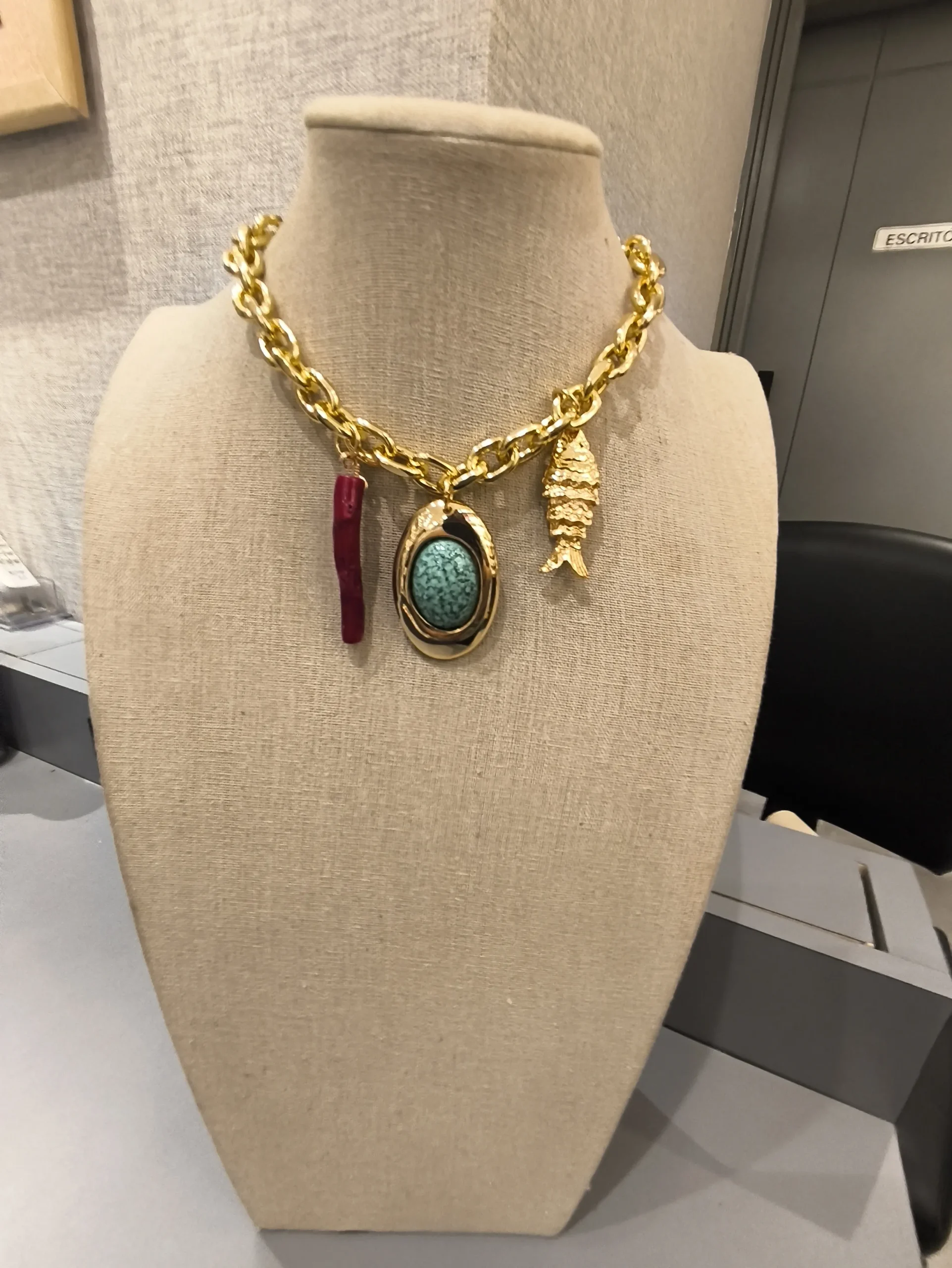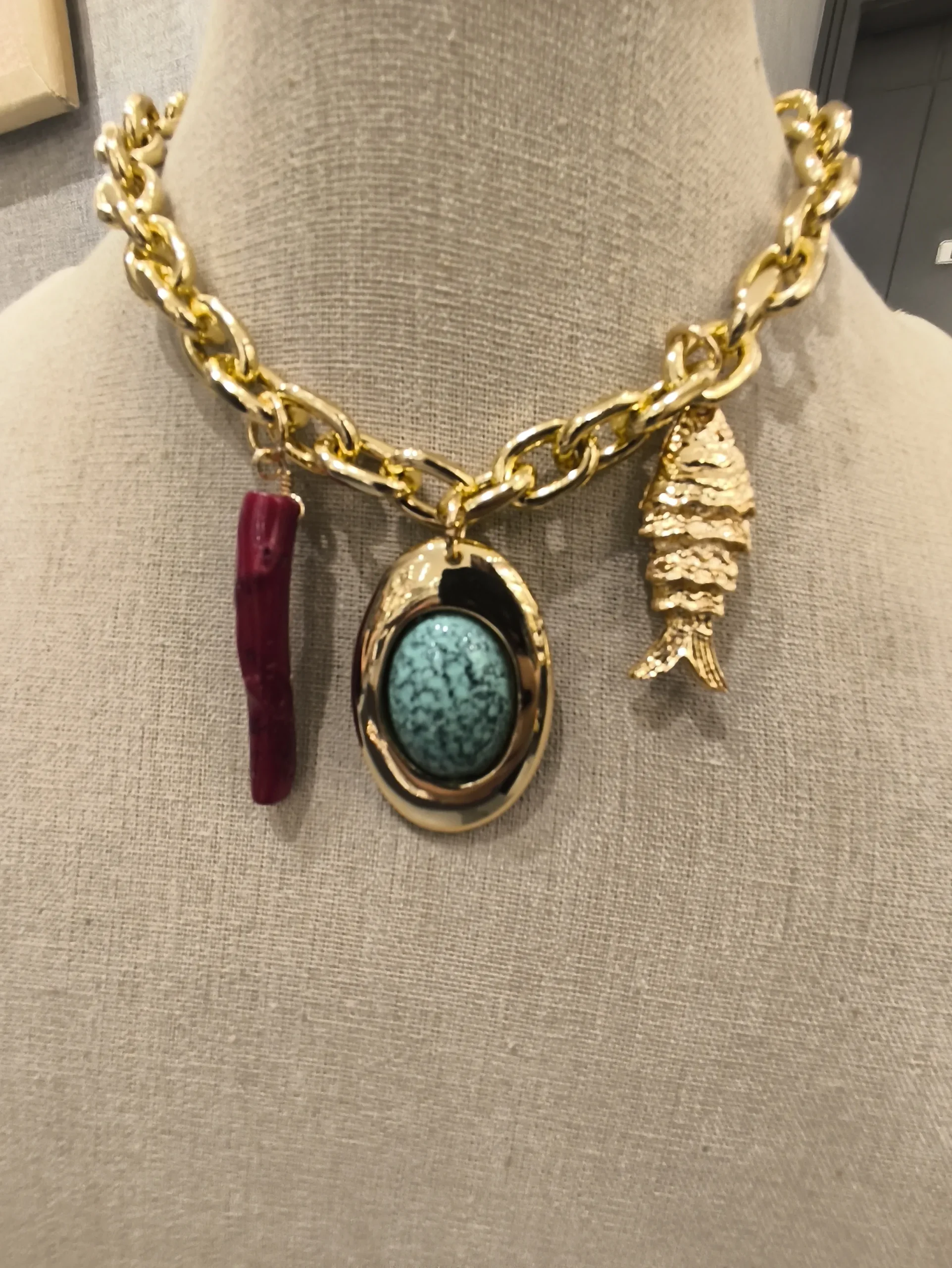 Este colar dourado com pingentes ✨ é uma verdadeira joia de personalidade. Feito com elos largos e acabamento polido, ele combina força e sofisticação em cada detalhe. Os pingentes — um coral vermelho intenso 🍷, uma pedra turquesa vibrante 💙 envolta em moldura dourada e um delicado peixe metálico 🐠 — trazem uma energia única, misturando elementos naturais e simbólicos com elegância. O contraste entre o dourado quente e as cores marcantes dos pingentes cria uma composição ousada e moderna, perfeita para mulheres que gostam de acessórios que contam histórias e chamam a atenção com sutileza e bom gosto.