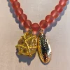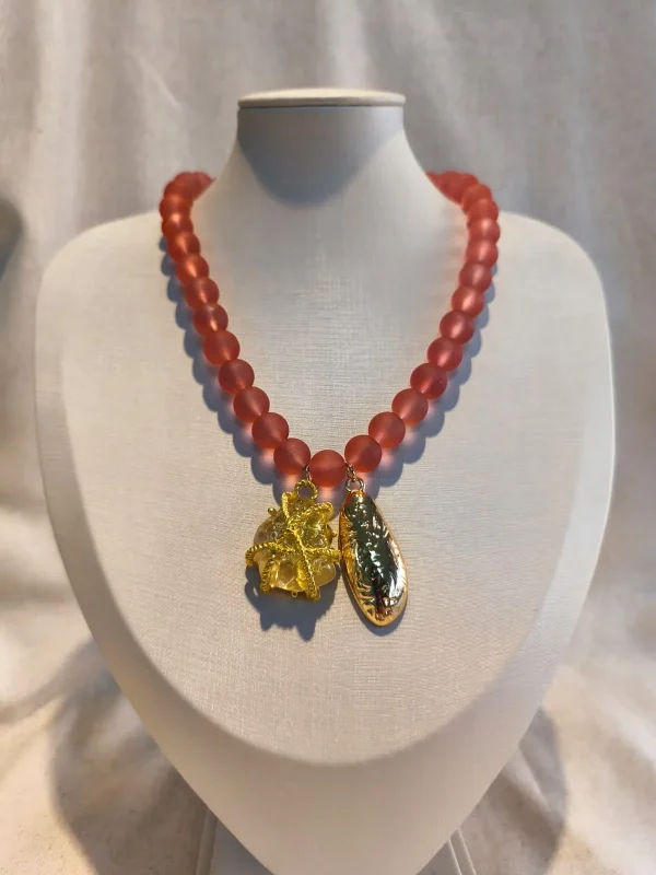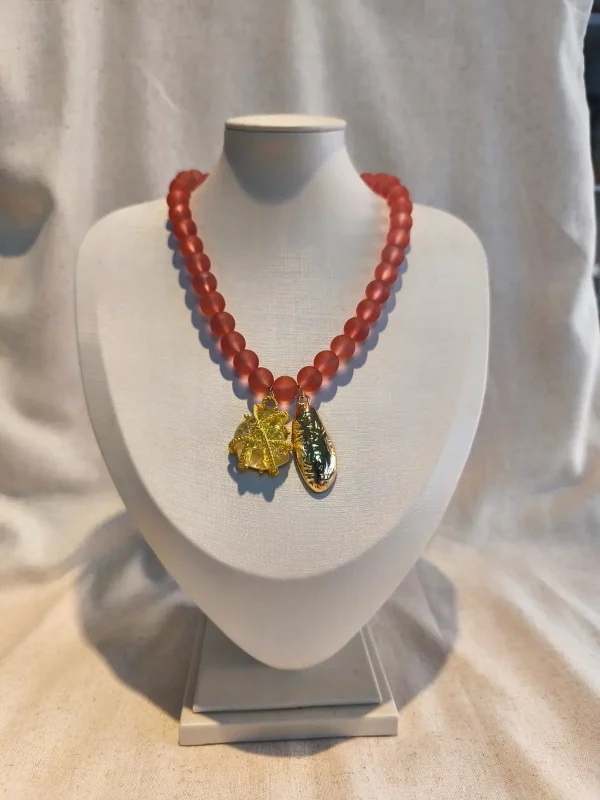 As contas em resina vermelha fosca trazem um efeito sofisticado e contemporâneo, enquanto os pendentes dourados adicionam brilho e personalidade na medida certa.