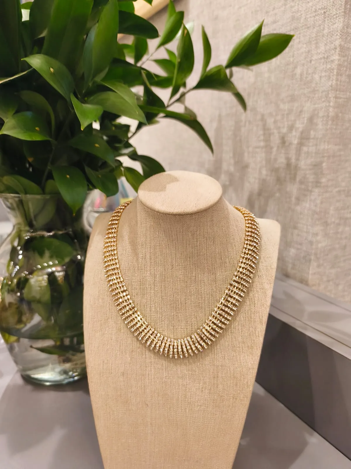 Dica de estilo: combine o colar dourado de strass com um vestido preto de decote reto ou uma blusa de seda bege. Para um visual mais moderno, use-o em sobreposição com correntes finas douradas — o mix de brilhos cria um contraste elegante e contemporâneo.