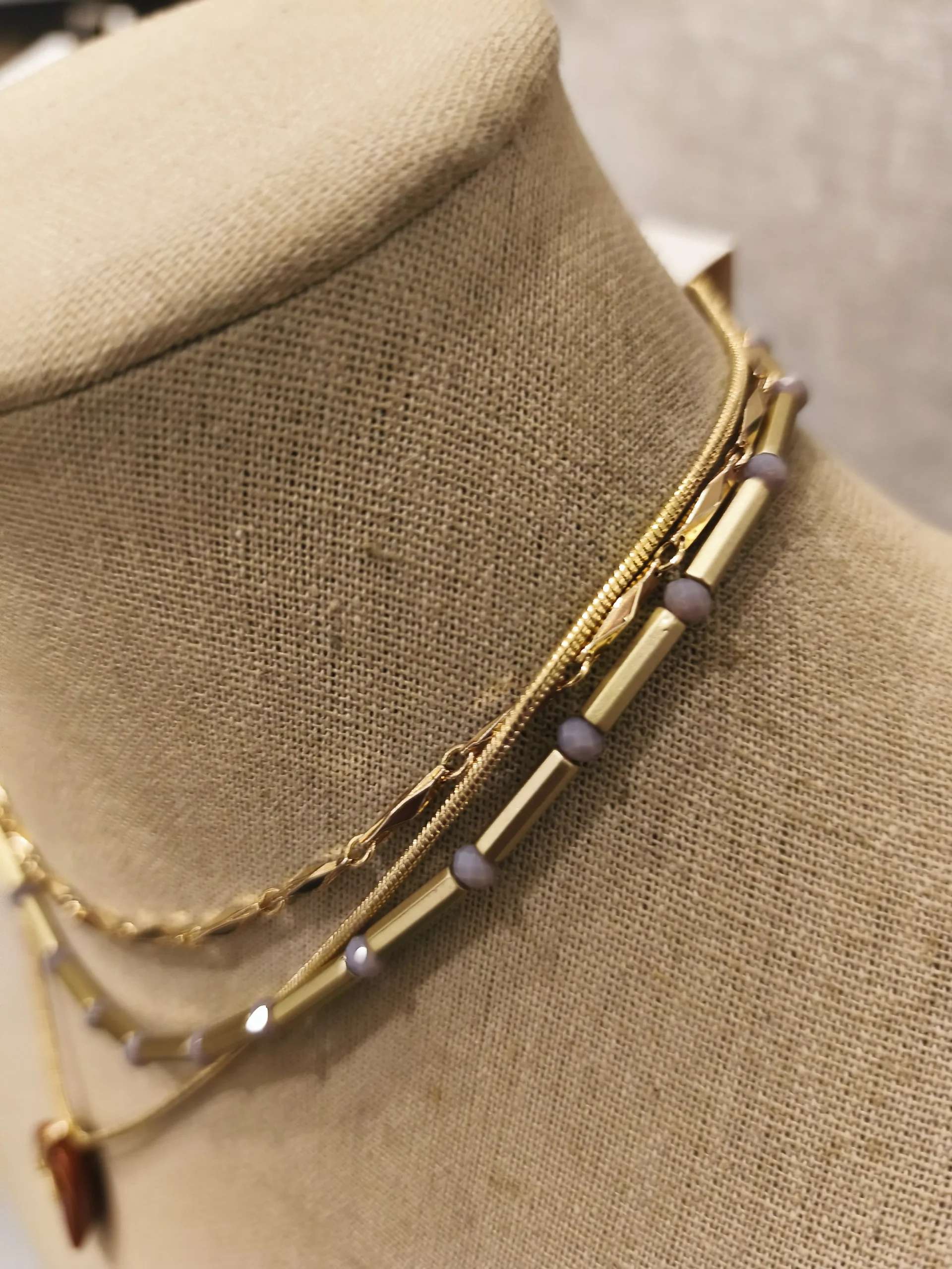 Dica de estilo: use-o com uma camisa branca de linho ou uma blusa off-white 🤍 para realçar o brilho do dourado e o contraste suave do lilás. Se quiser um visual mais criativo, combine com um vestido em tons terrosos ou verde oliva — o trio de colares vai trazer harmonia e sofisticação instantânea 🌿.