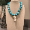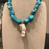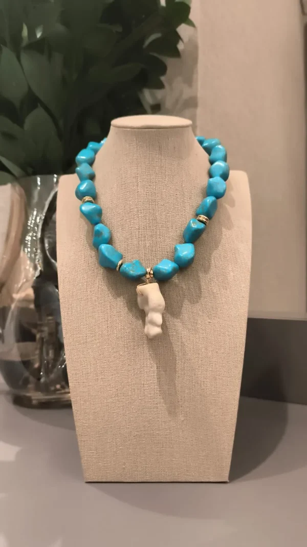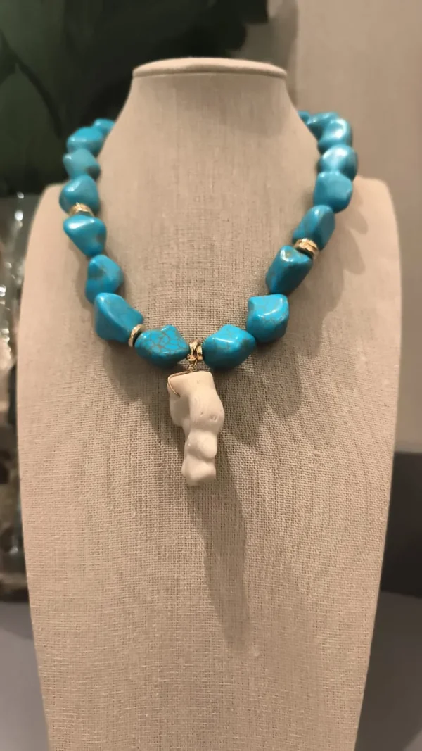 Para quem ama se destacar! 🌊 Este colar é composto por pedras irregulares na vibrante cor turquesa, intercaladas por detalhes dourados que trazem sofisticação. O pingente central em forma de escultura anatômica dá um toque artístico e único à peça. ✨