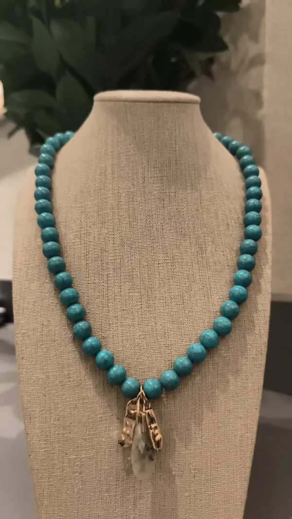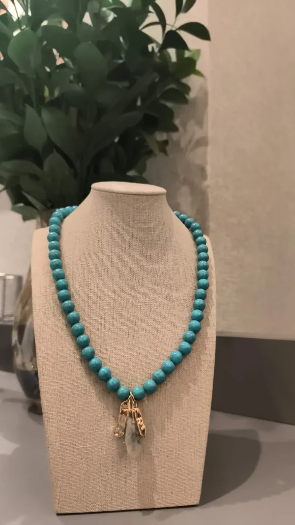 Composto por esferas em tom turquesa vibrante, este colar traz frescor e personalidade ao look 🌊🌿. O detalhe em dourado com pingentes em pedra natural adiciona um charme rústico e ao mesmo tempo elegante 💫🔮. Ideal para compor produções leves e autênticas — perfeito para quem ama acessórios com alma e cor! 💙