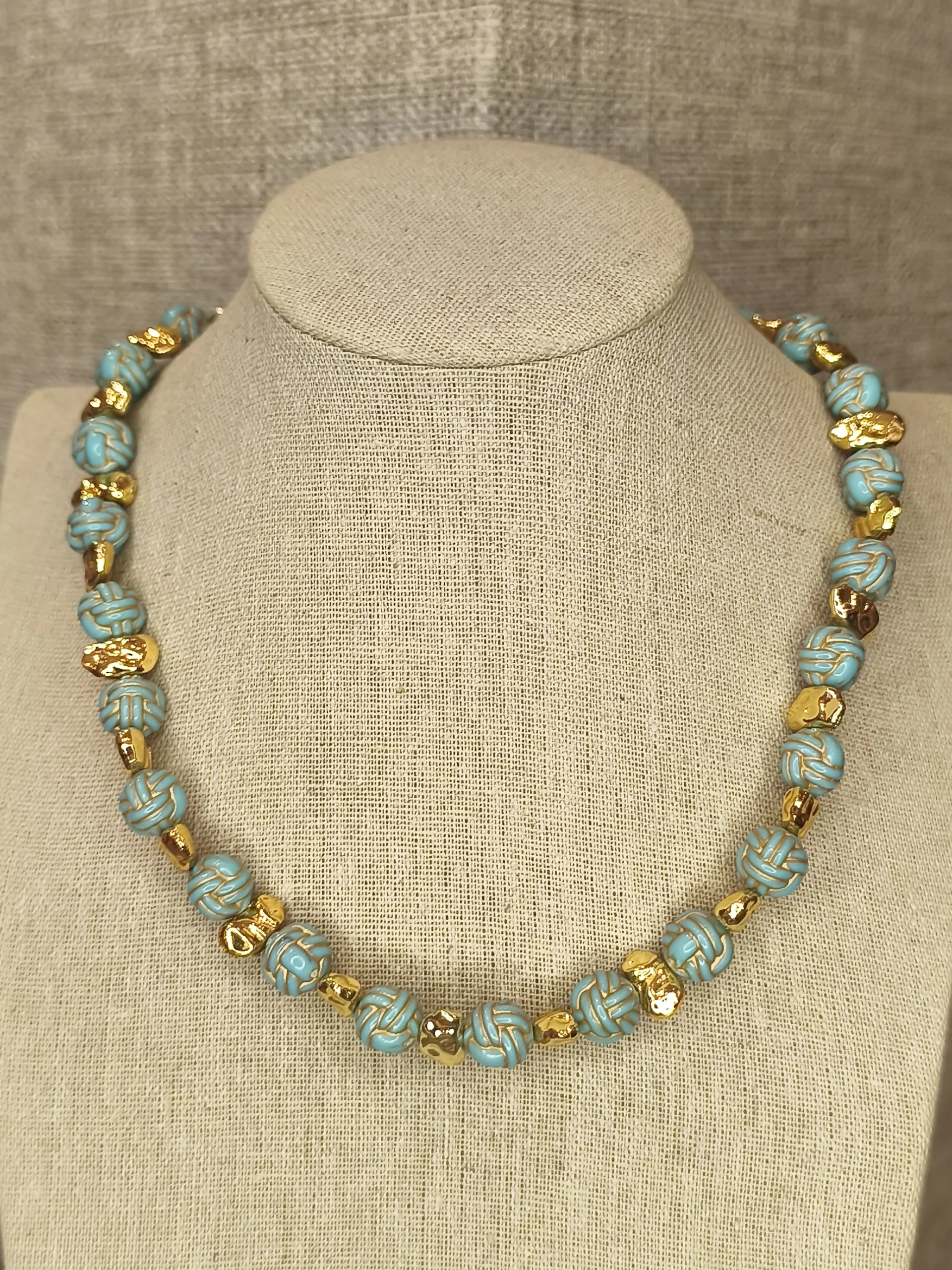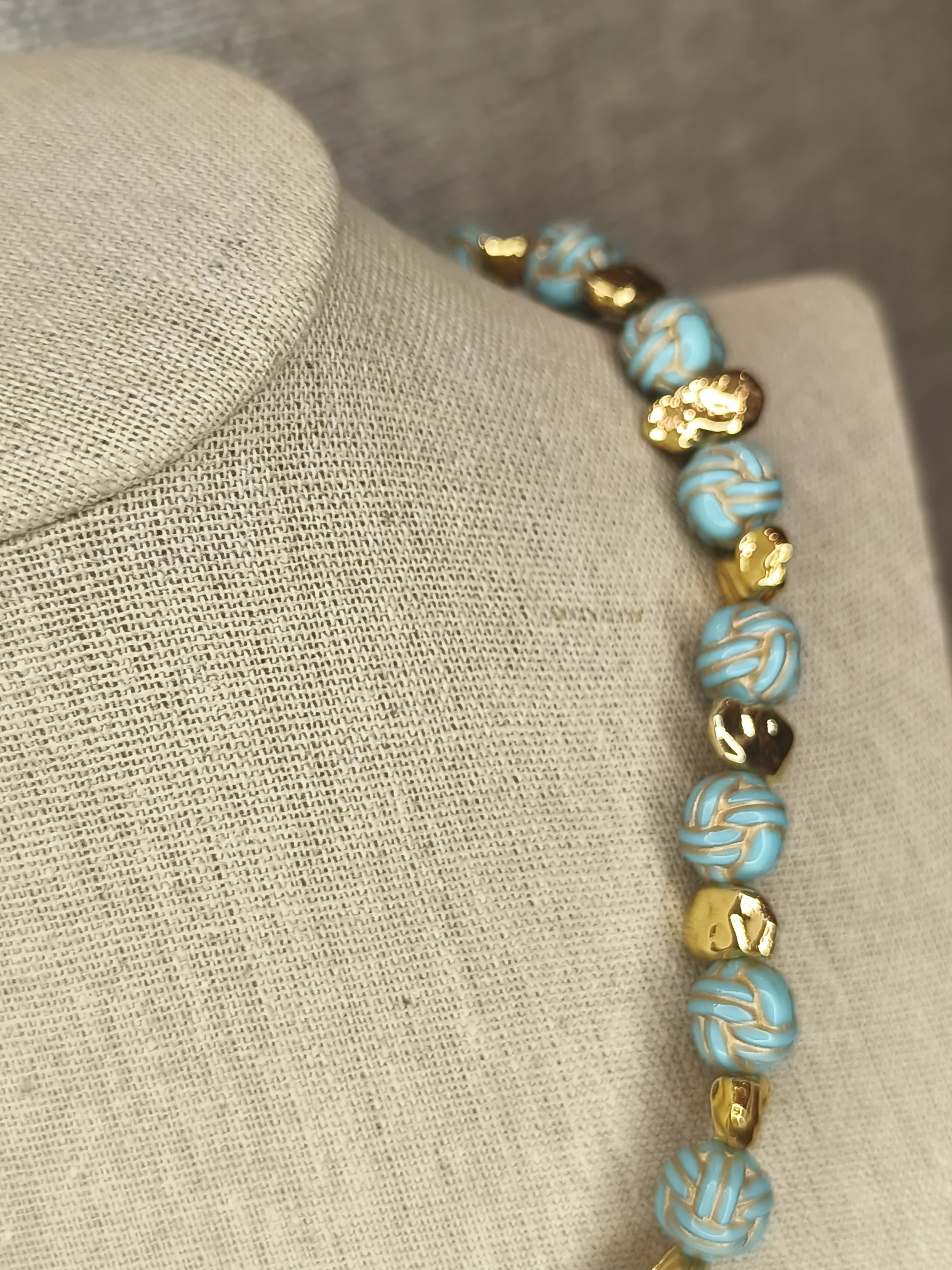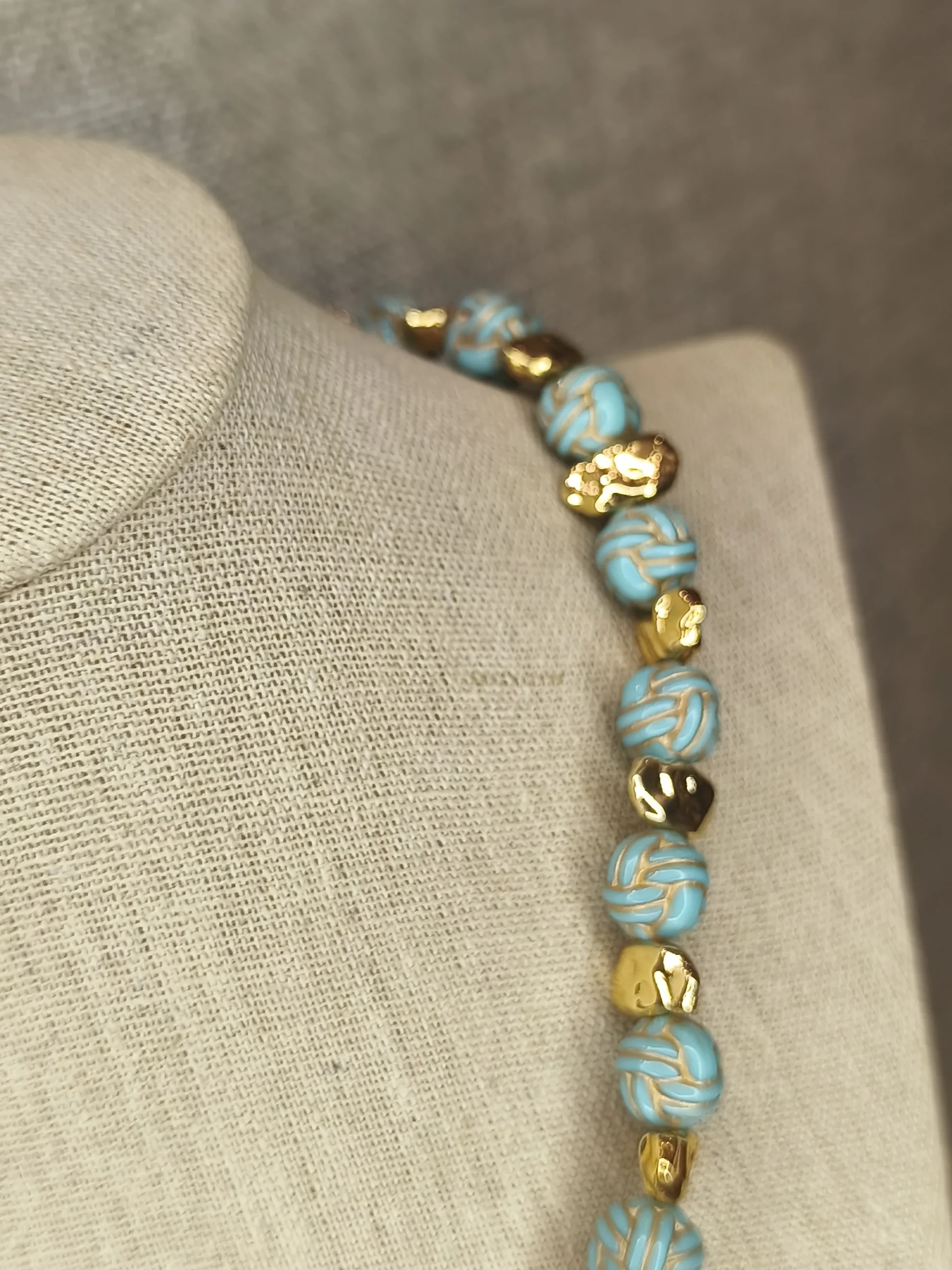 Este colar dourado com bolinhas turquesa é a combinação perfeita de frescor, elegância e modernidade ✨. As contas em tom turquesa, levemente translúcidas, criam um efeito luminoso e sofisticado, enquanto os pequenos elementos dourados entre elas adicionam ritmo, contraste e aquele brilho discreto que faz toda a diferença. O visual é equilibrado, delicado e ao mesmo tempo marcante — ideal para mulheres que gostam de acessórios que trazem cor com suavidade, sem pesar no look. Ele funciona lindamente com peças claras, vestidos fluidos, camisas de linho, tricôs leves e até looks de alfaiataria neutra, trazendo um toque contemporâneo e elegante 🌊💛.