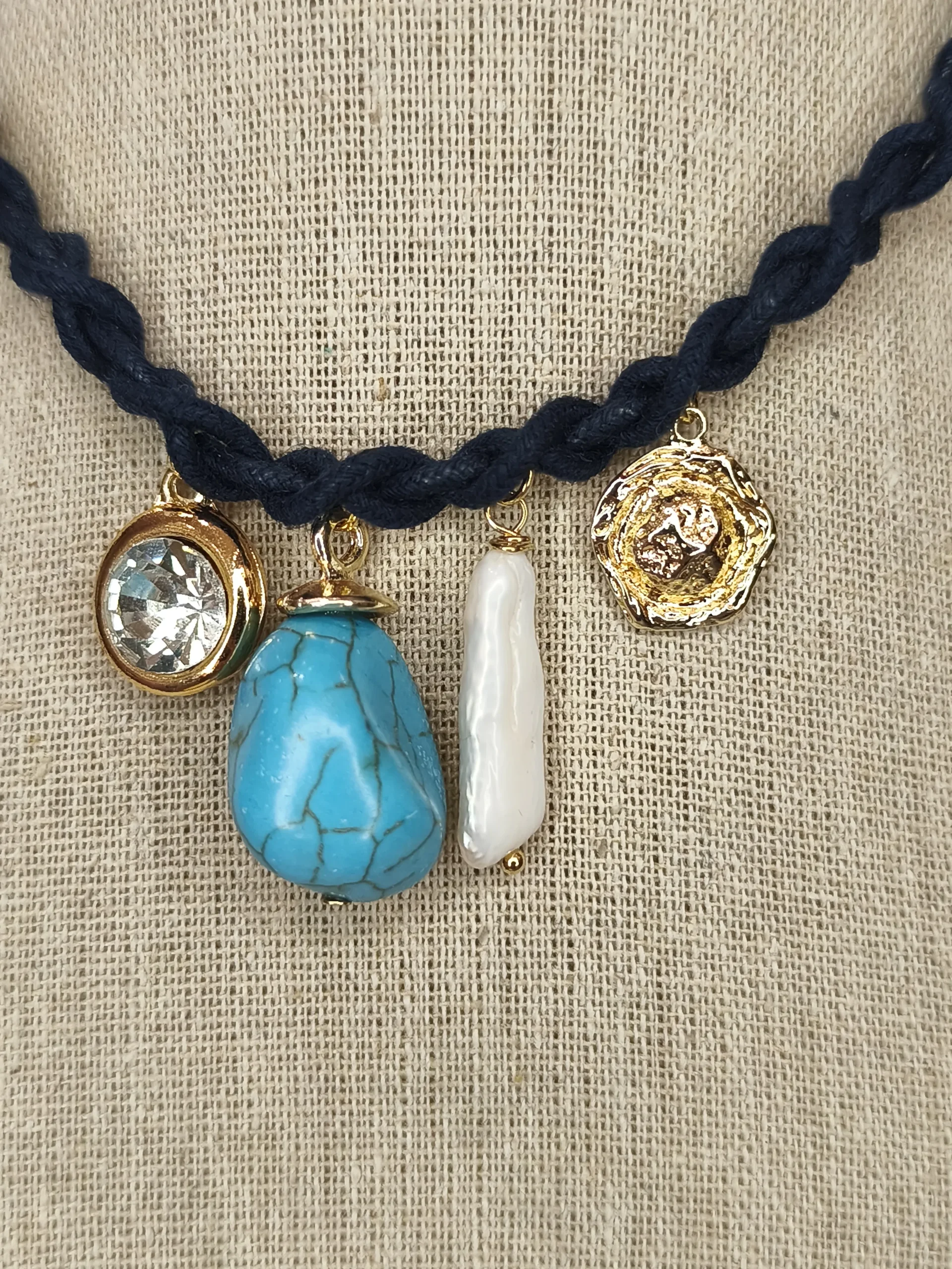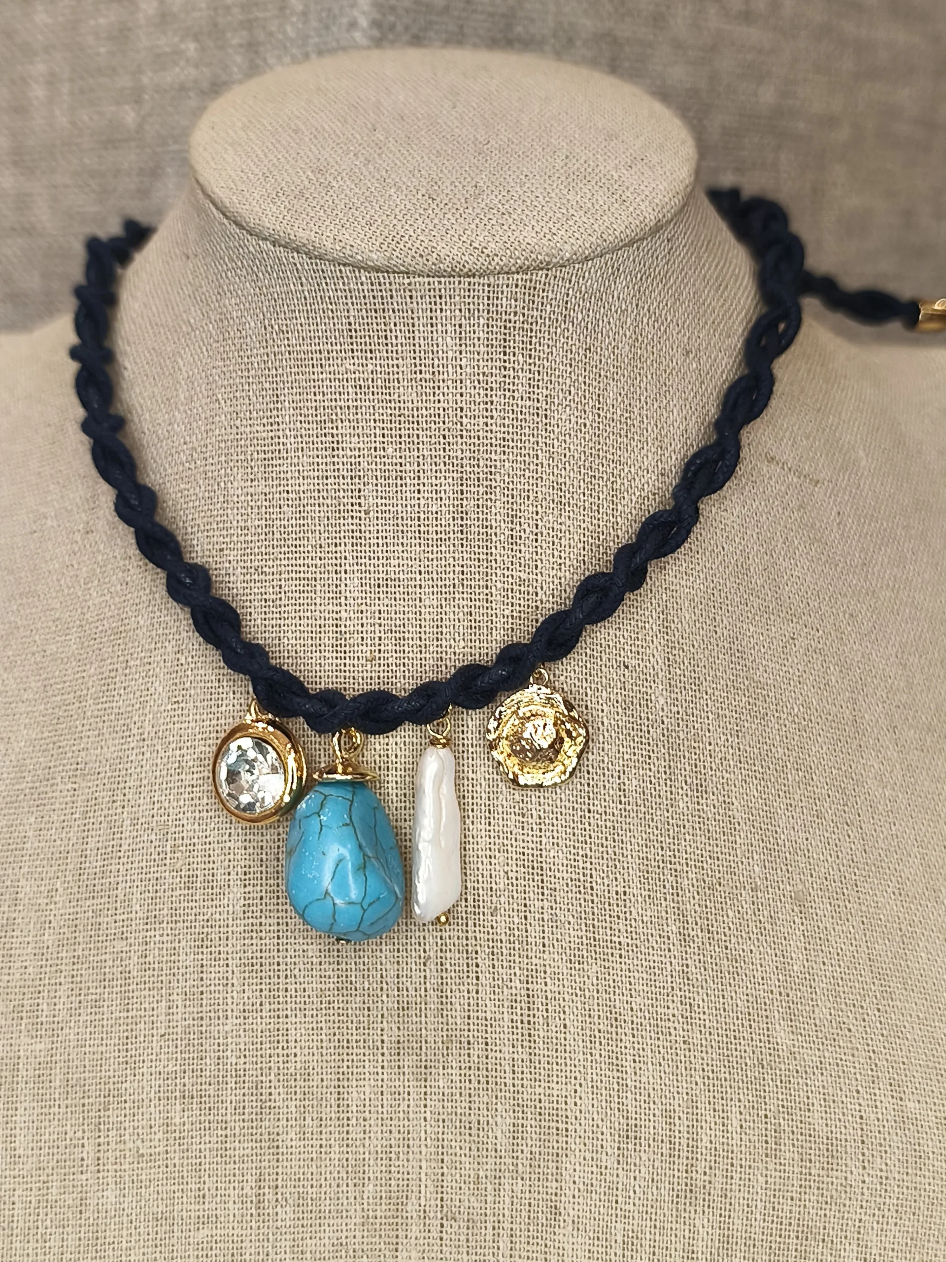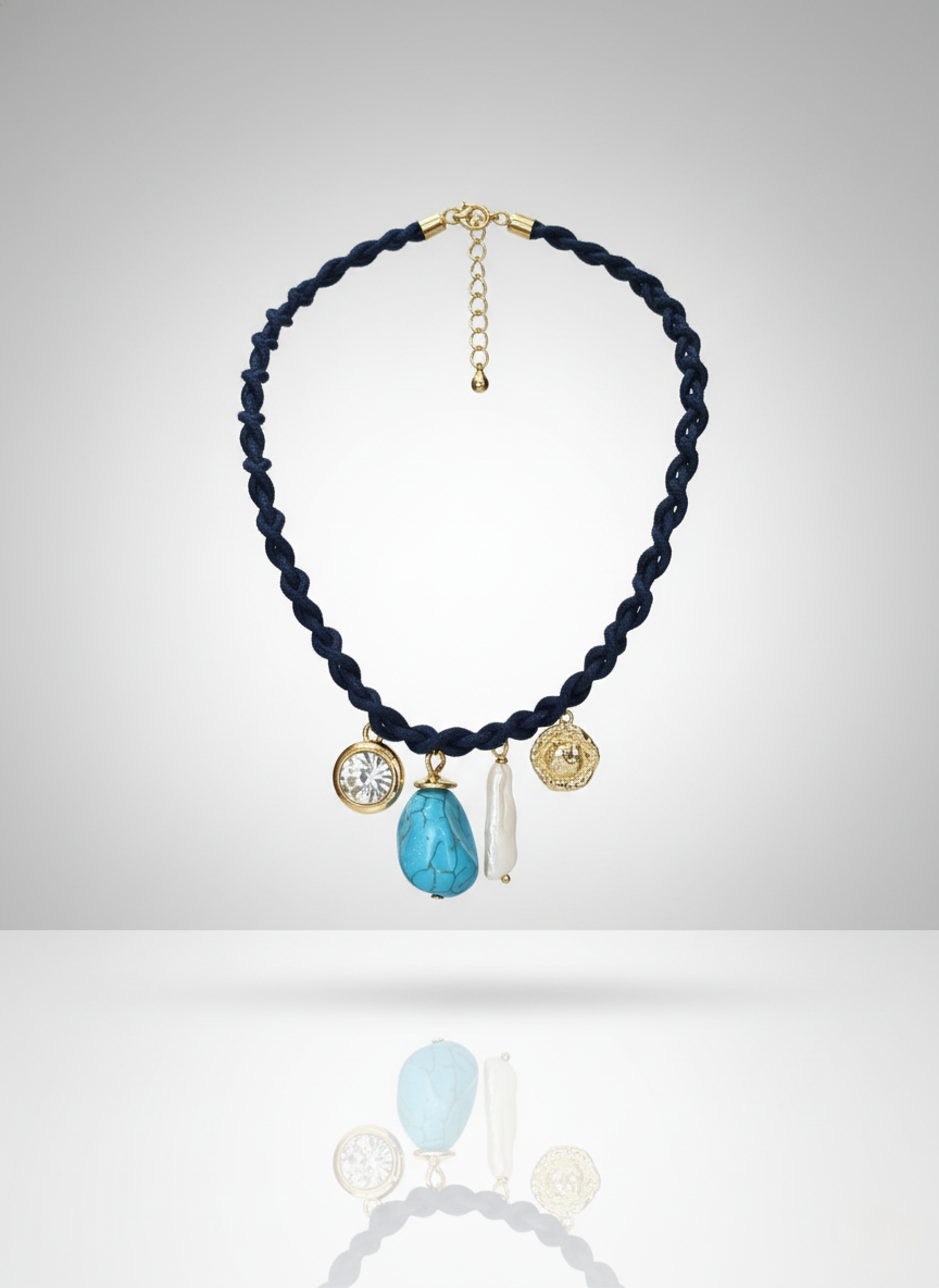 Este colar de fio azul trançado é uma peça cheia de personalidade, charme e um toque artesanal sofisticado ✨. O trançado em azul marinho cria uma base elegante e contemporânea, com textura rica e visual marcante. No centro, os pingentes — um cristal translúcido, uma peça redonda dourada com textura orgânica, um charme em resina branca alongada e uma pedra azul vibrante — formam uma composição encantadora, que mistura brilho, cor e movimento. O resultado é um colar que traz frescor, leveza e modernidade ao look, perfeito para mulheres que adoram acessórios que contam histórias e imprimem estilo sem esforço. O fecho regulável ainda permite ajustar o comprimento, tornando a peça versátil para diferentes decotes e ocasiões.