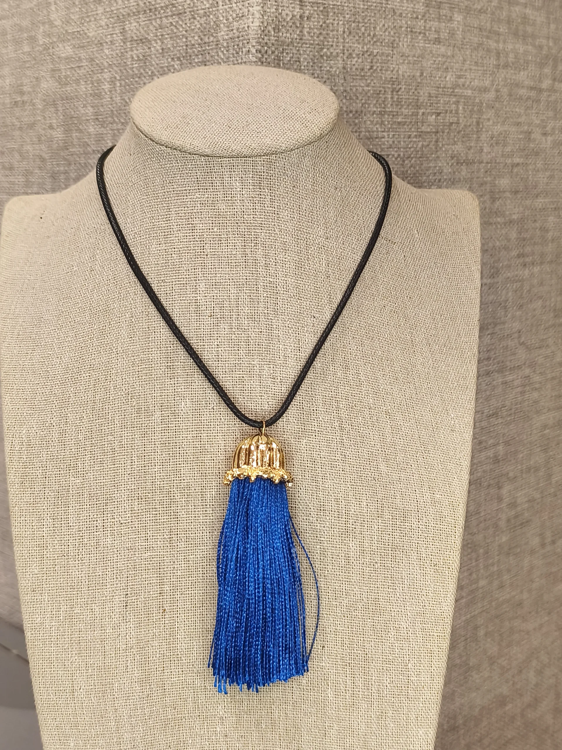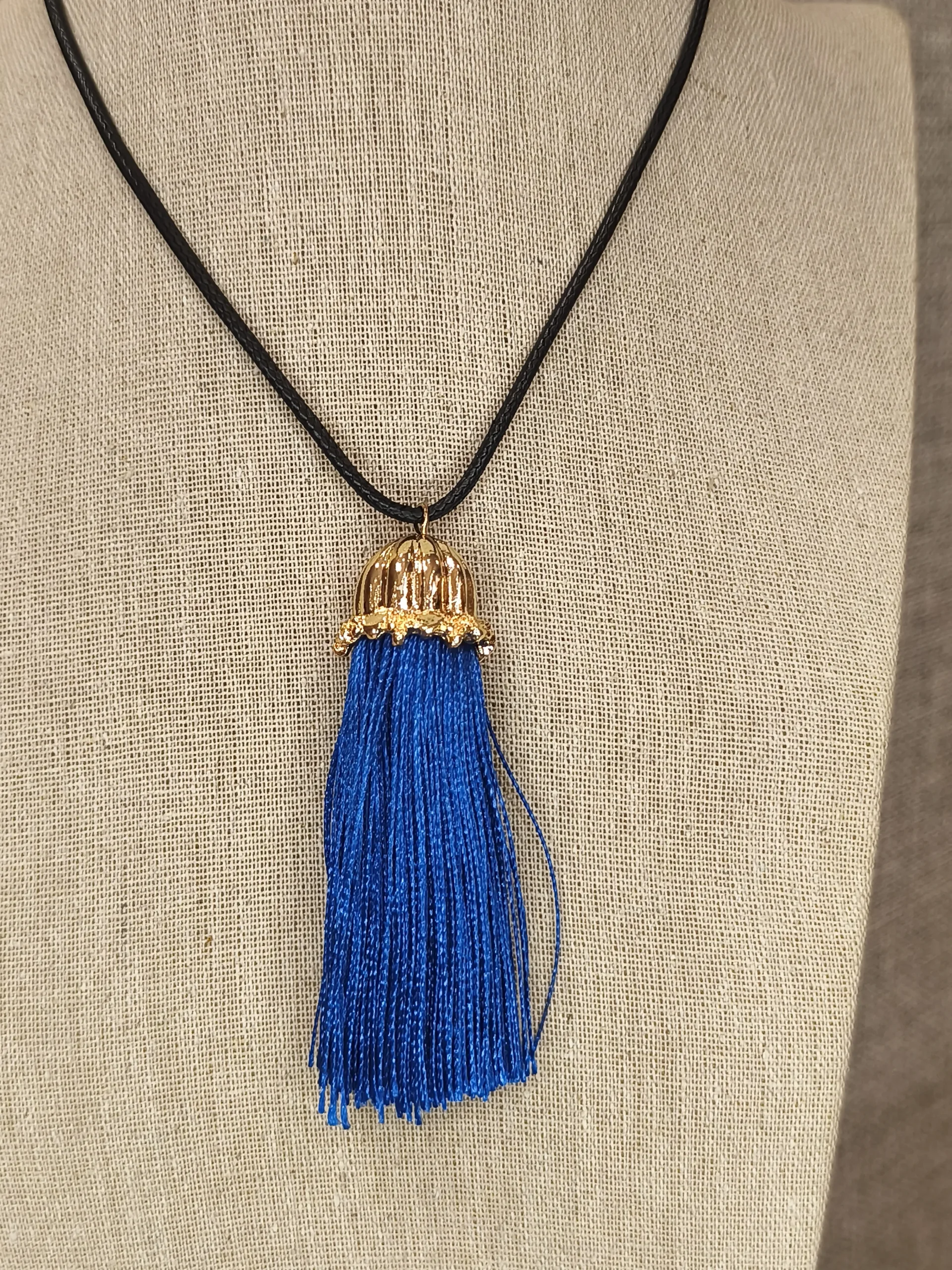 Ficha técnica: peça com cordão preto, tassel em fios azul royal e acabamento metálico dourado, modelagem longa, nas cores preto, azul e dourado, de origem nacional e indicada limpeza com pano macio e seco, evitando contato com água, perfumes ou produtos químicos.