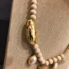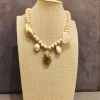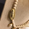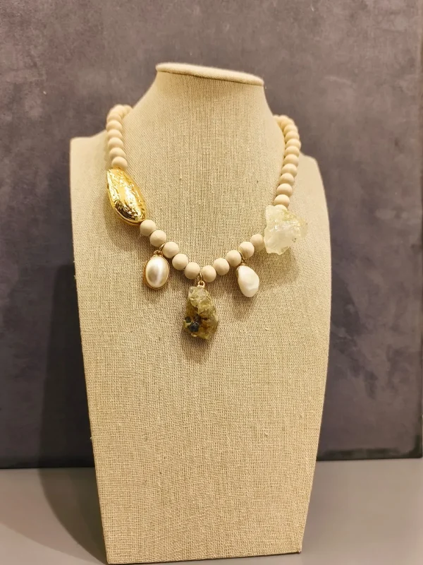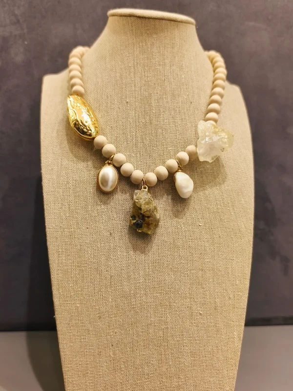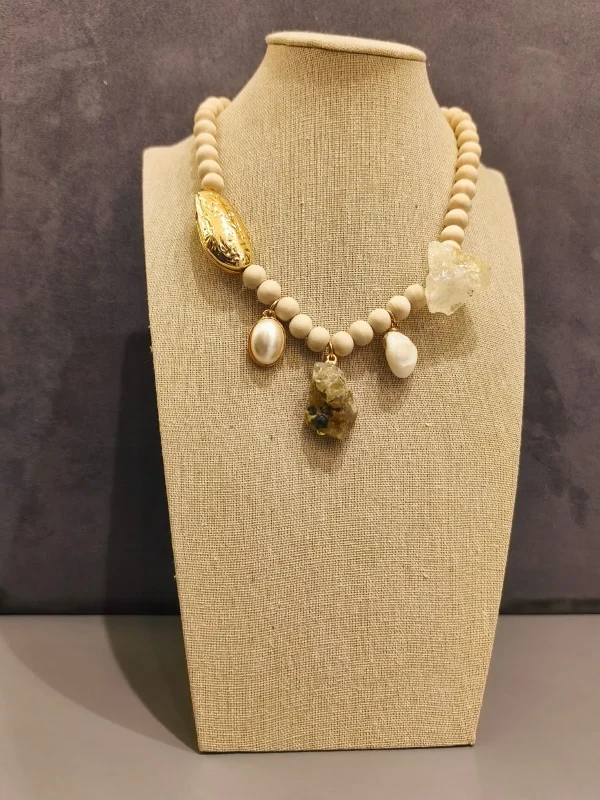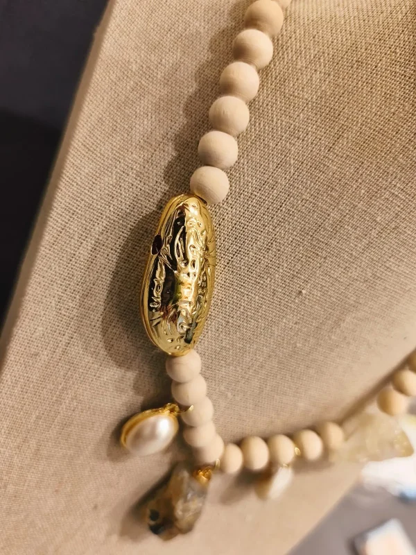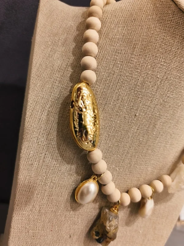 O colar de madeira com detalhes em ABS dourado é uma peça única que mistura naturalidade e sofisticação em perfeita harmonia. As contas arredondadas em tom neutro de madeira trazem um ar orgânico e artesanal, enquanto os pingentes — que combinam pedras brutas, pérolas e um detalhe em dourado metalizado — adicionam personalidade e modernidade ao design. É um acessório que se destaca pela originalidade, ideal para mulheres que apreciam peças exclusivas e cheias de significado. Perfeito para compor tanto produções casuais sofisticadas quanto looks marcantes em ocasiões especiais.