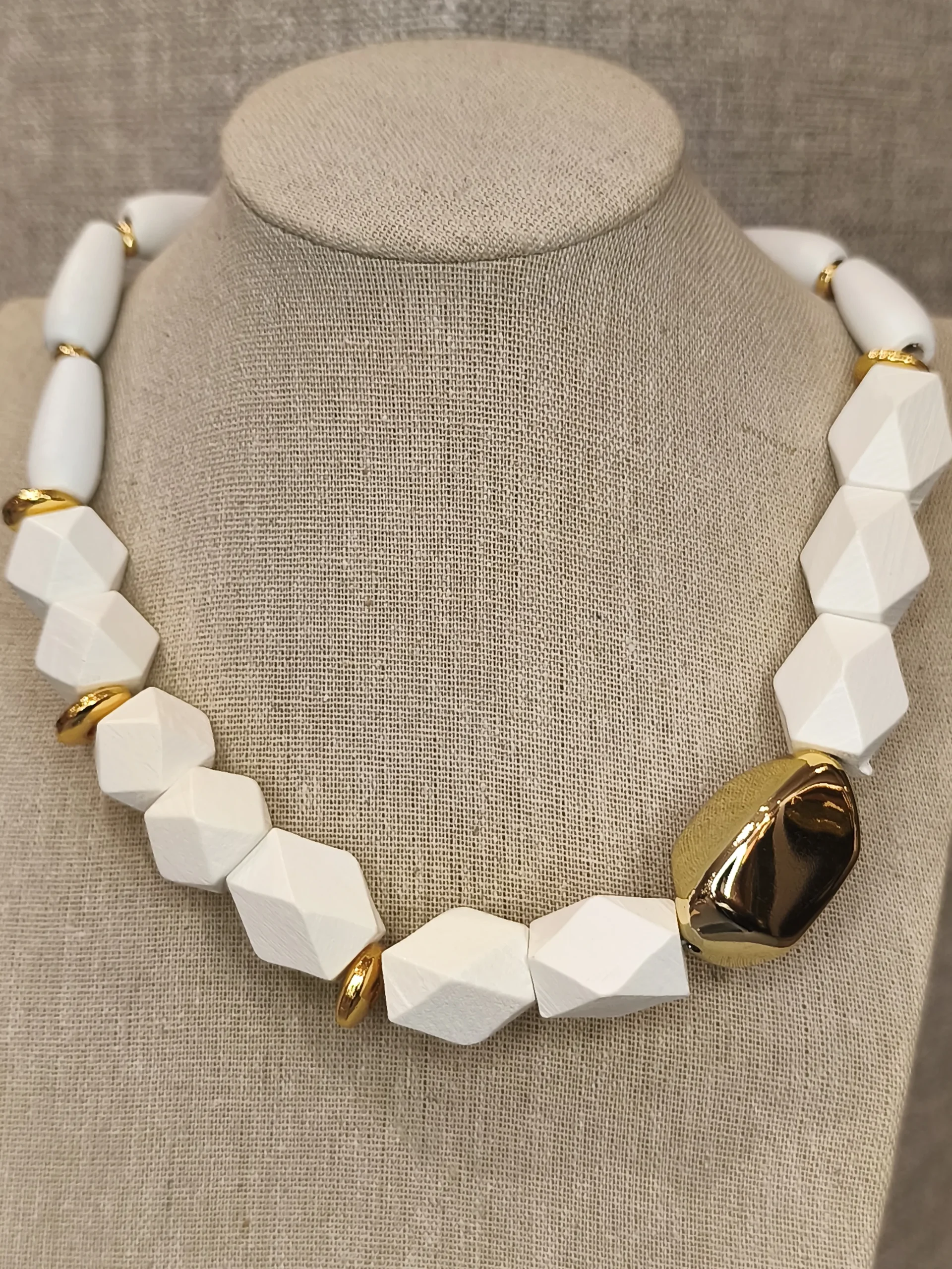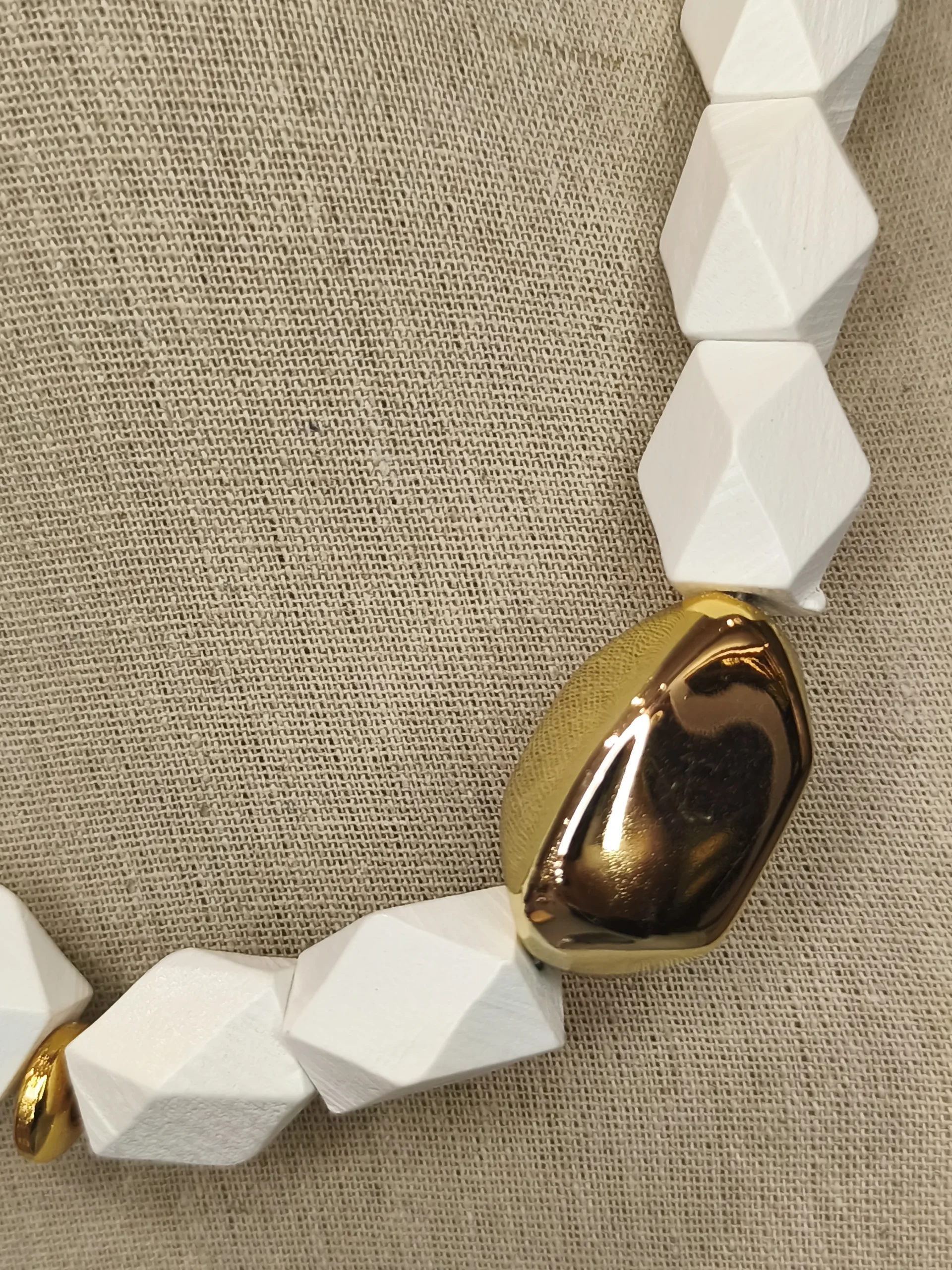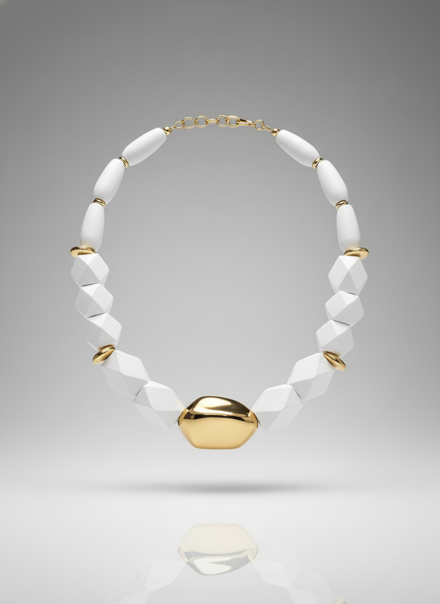 Este colar de madeira branca é uma peça que traduz leveza, modernidade e sofisticação com uma elegância absolutamente natural ✨. Suas contas geométricas em branco, combinadas com detalhes dourados que pontuam o design, criam um ritmo visual contemporâneo e muito refinado. O pingente central, em dourado polido, adiciona um ponto de luz que equilibra perfeitamente a textura fosca da madeira, resultando em um contraste chic e atemporal. É o tipo de acessório ideal para mulheres que buscam peças marcantes, mas que conversam com diferentes estilos e ocasiões — do look minimalista de trabalho às produções mais elaboradas de fim de semana. O colar desenha o colo com presença e personalidade, elevando qualquer visual com naturalidade.