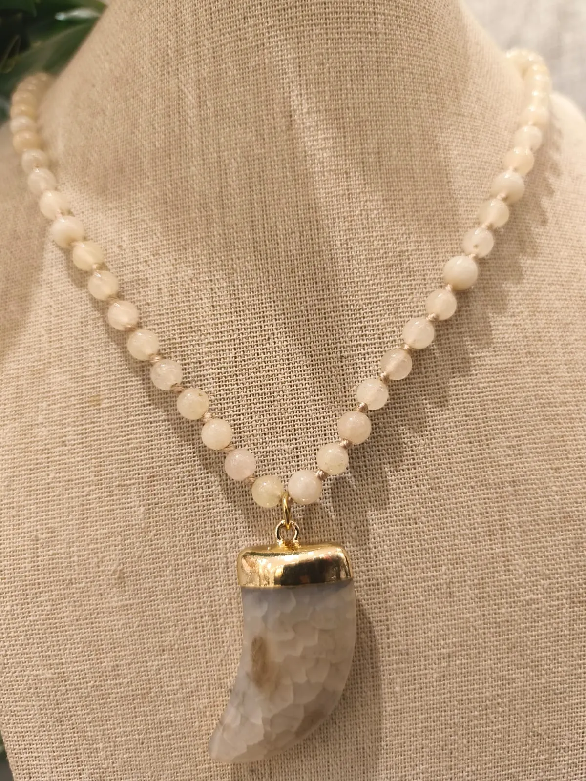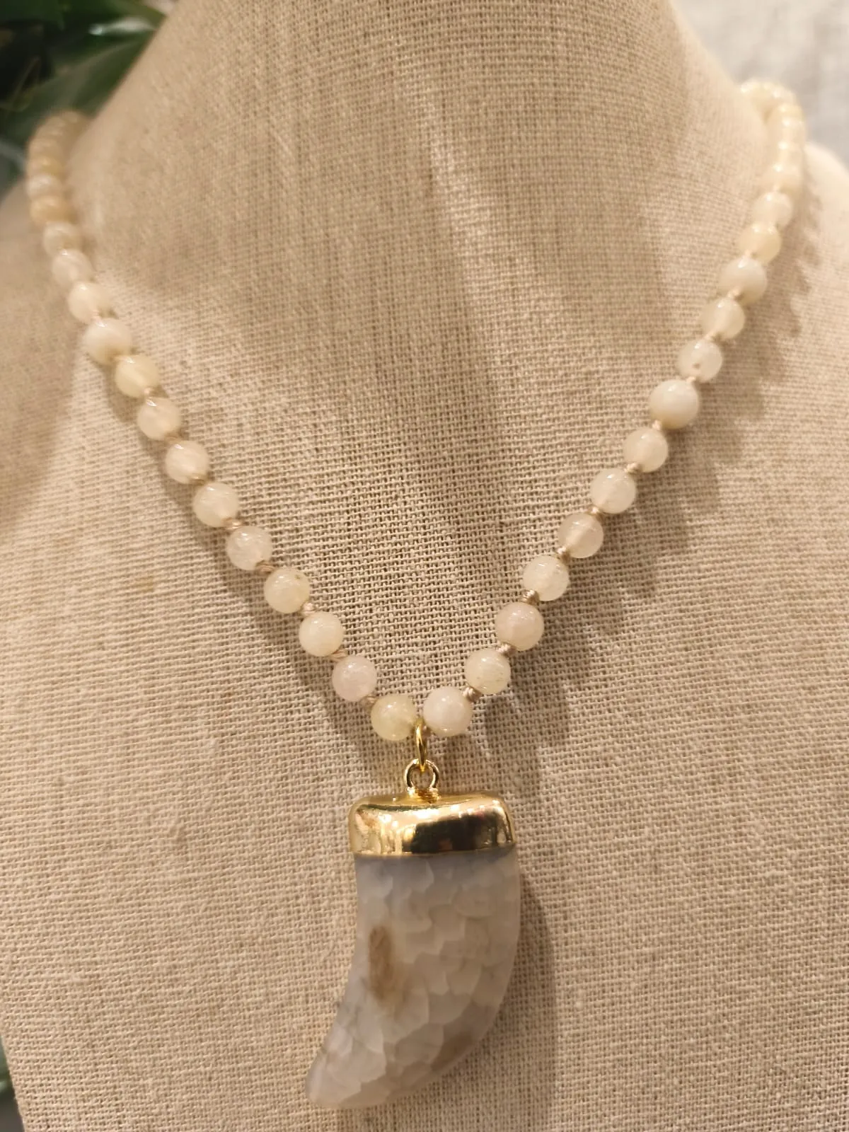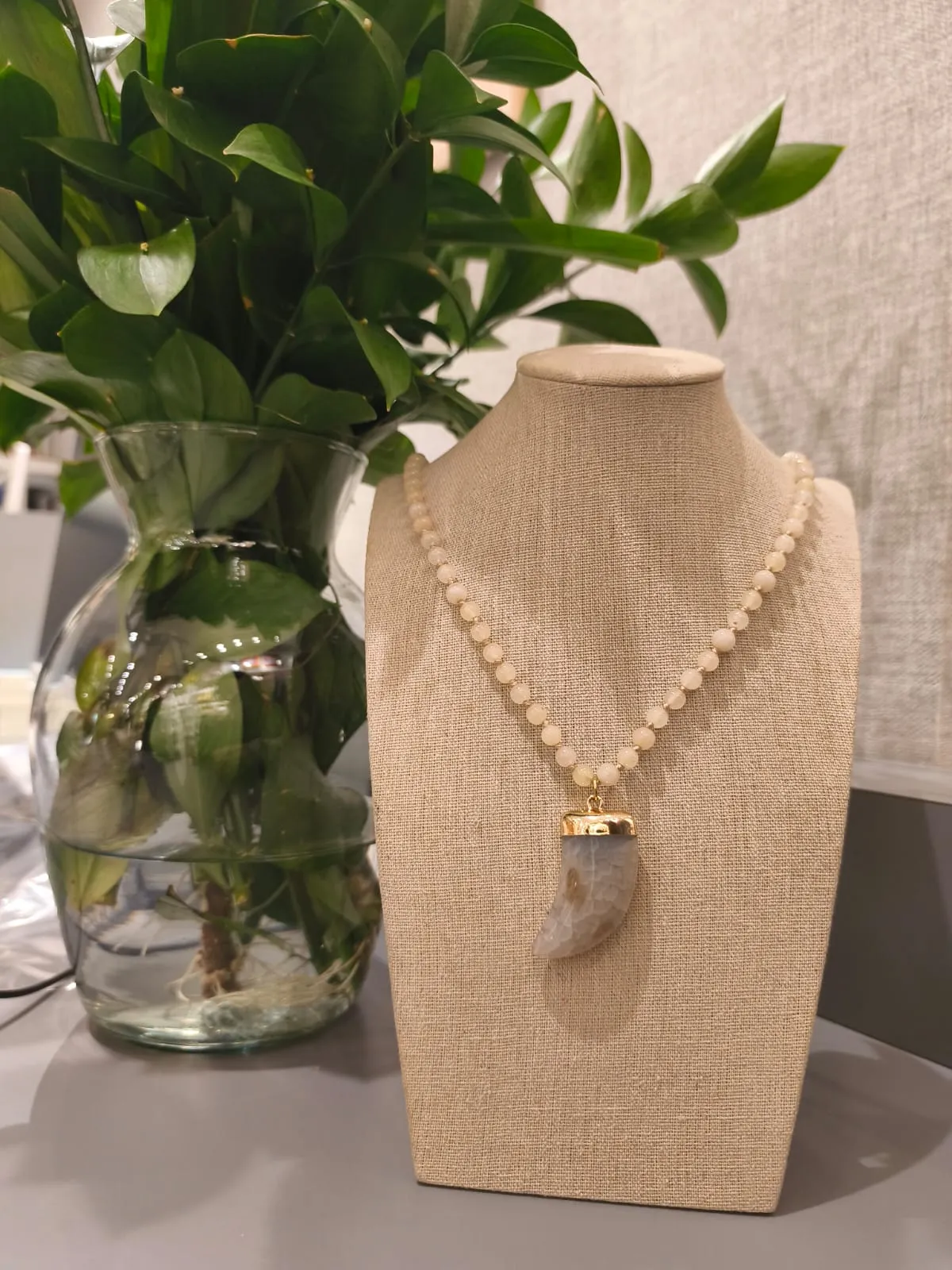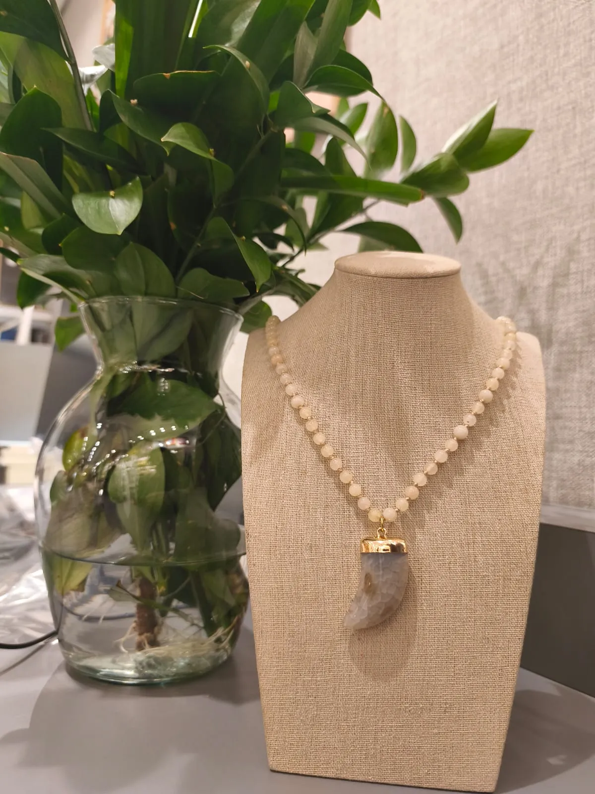 O colar pedras off PG é uma peça marcante e elegante, que une elementos naturais e acabamento sofisticado. Composto por contas arredondadas em tom off white e um pingente em formato de dente com detalhe dourado, ele traz uma estética contemporânea com toque orgânico. O contraste entre o fosco das pedras e o brilho metálico do dourado cria um visual equilibrado e cheio de estilo.
