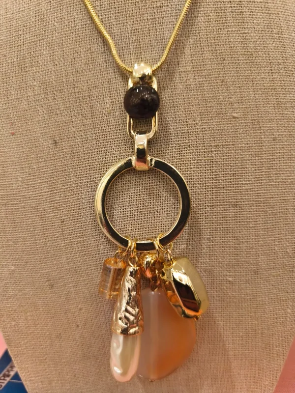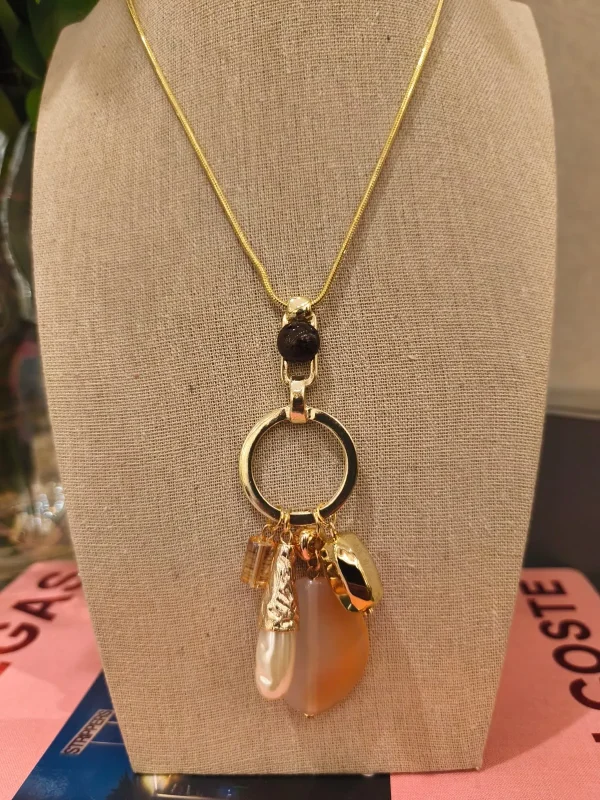 Ficha técnica: colar longo com corrente dourada, aro central em metal com banho dourado, pingentes de resina âmbar, pérola barroca alongada e metais polidos, design contemporâneo, feito à mão no Brasil. Evitar contato com água, perfumes e cremes para preservar brilho e acabamento.