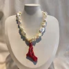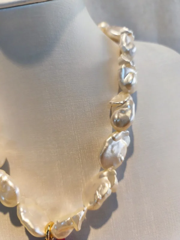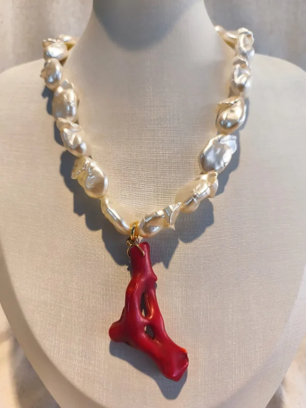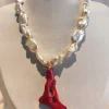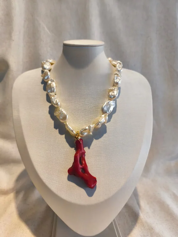 As pérolas irregulares trazem um ar orgânico e elegante, enquanto o pingente vermelho em formato de coral adiciona ousadia e modernidade, criando uma peça única e cheia de personalidade.