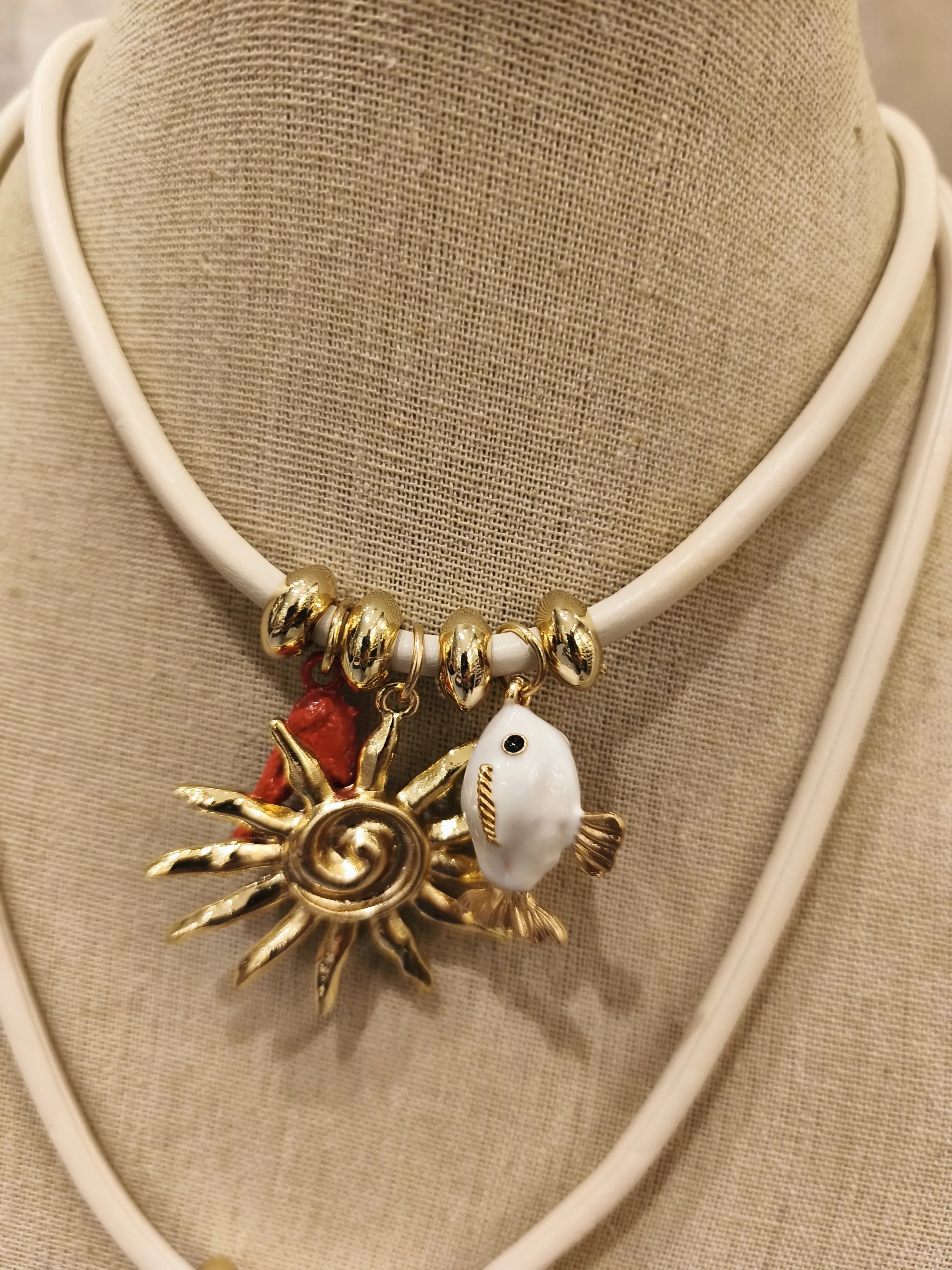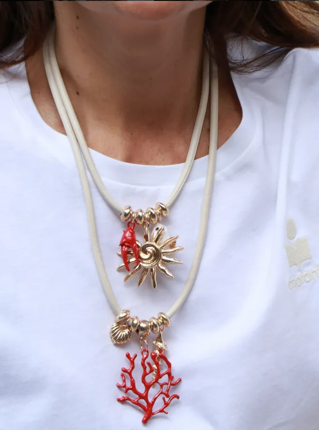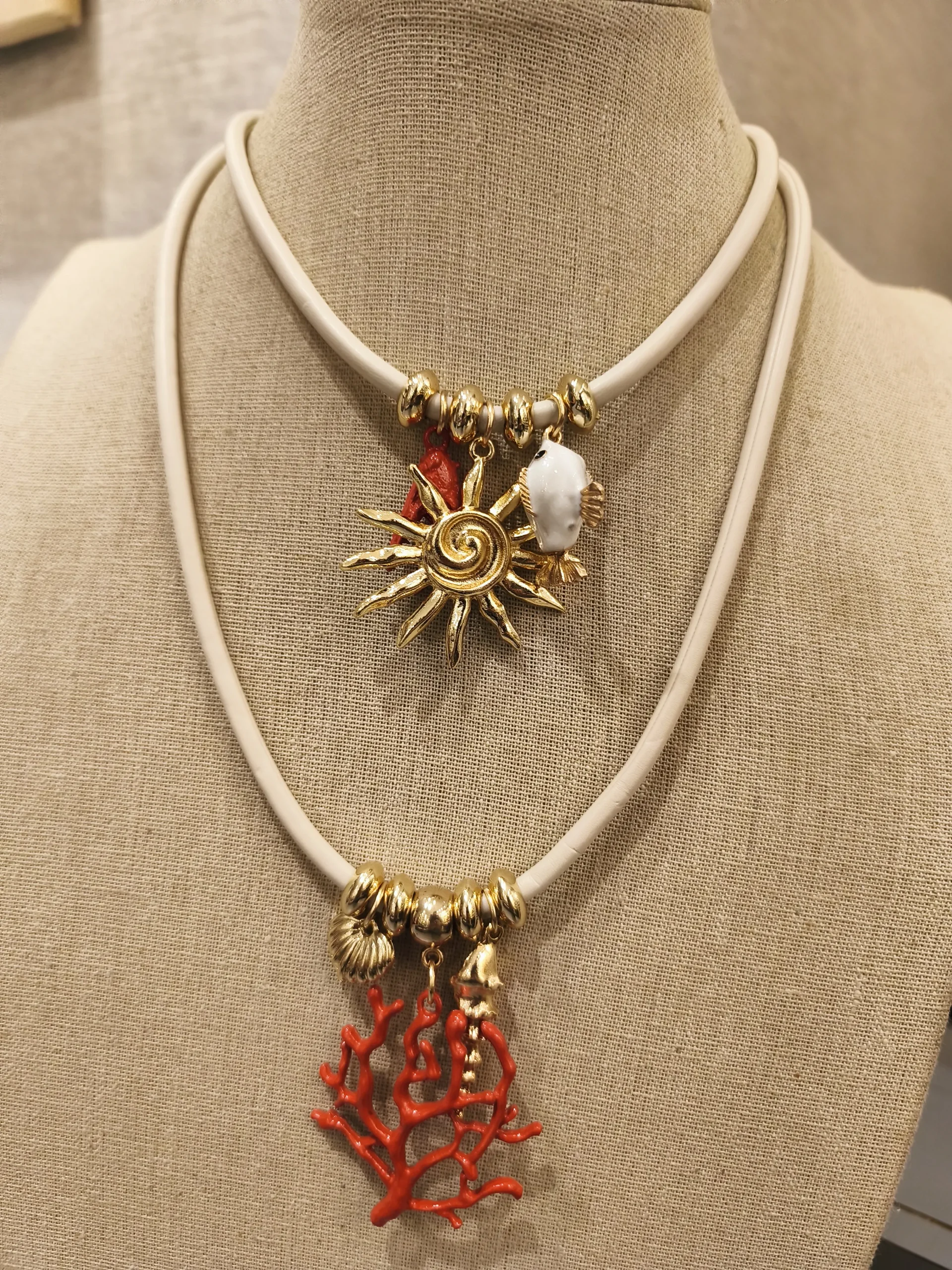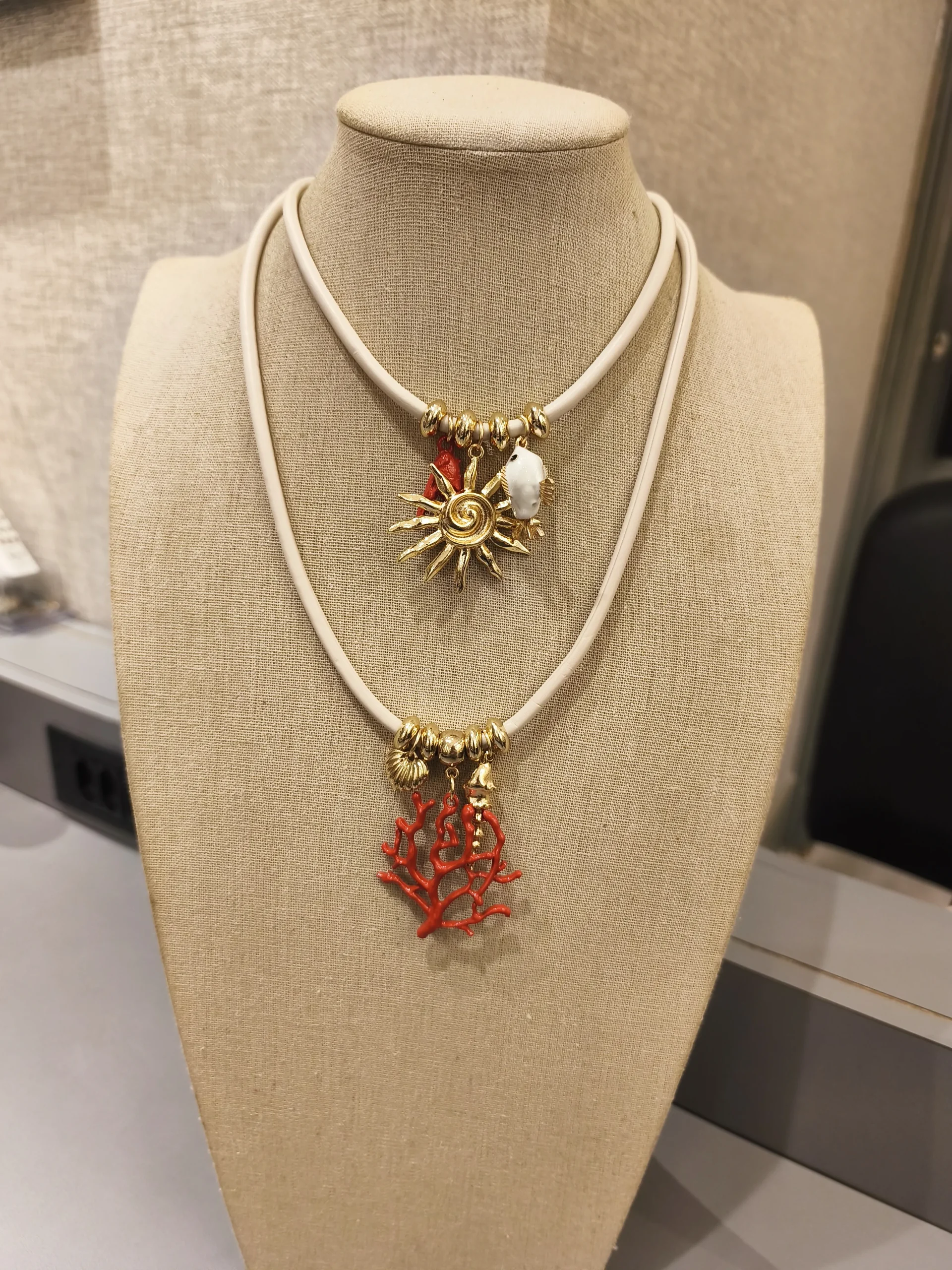 Este colar duplo 🌞✨ é uma verdadeira celebração da energia solar e da elegância natural. Com cordões em tom cru, que trazem suavidade e versatilidade, ele ganha vida com os detalhes em dourado e os pingentes marcantes — o sol radiante ☀️, símbolo de luz e vitalidade, e o coral vermelho 🍂, que remete à força e à proteção. O toque da pérola delicada 🤍 adiciona equilíbrio e feminilidade, criando um contraste lindo entre o rústico e o sofisticado. Cada elemento parece contar uma história: o dourado aquece, o coral vibra, e o neutro acolhe. É uma peça que transborda personalidade, perfeita para mulheres que gostam de acessórios com significado e presença.