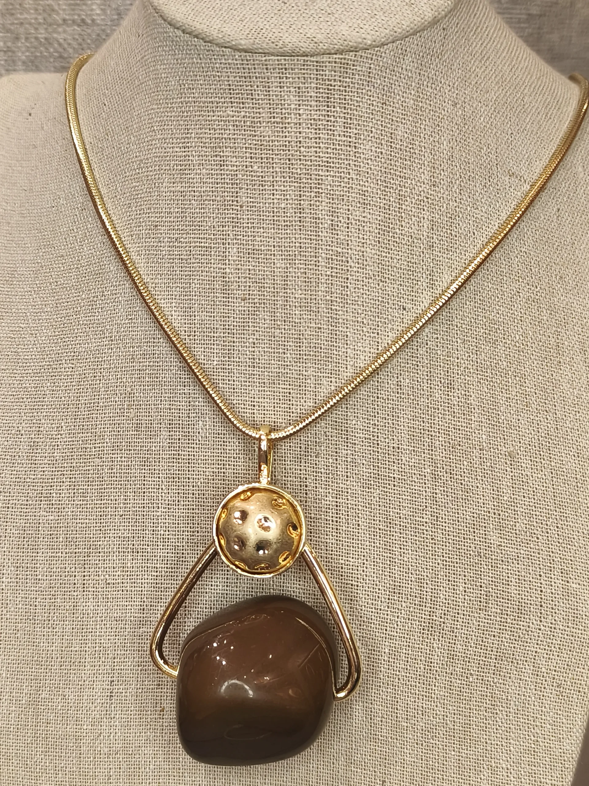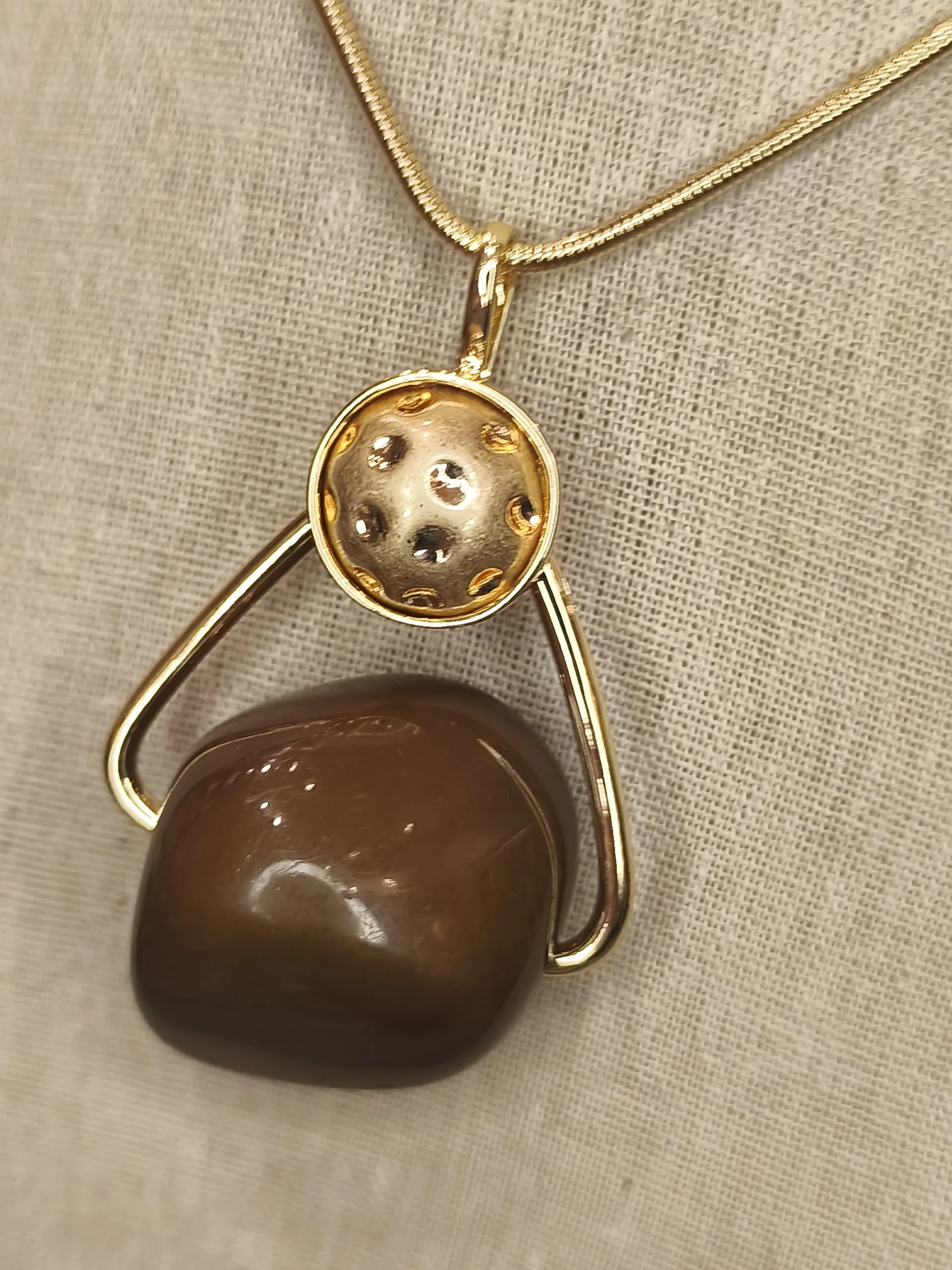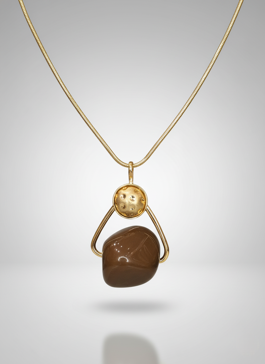Este colar dourado com pingente em resina é uma peça que combina arte, modernidade e elegância com uma naturalidade irresistível ✨. A corrente fina e polida cria uma linha suave que conduz o olhar diretamente ao pingente escultural: uma esfera dourada levemente texturizada que se une a uma pedra em resina marrom, de superfície lisa e brilho sutil. O resultado é um design contemporâneo, quase arquitetônico, que conversa com mulheres que buscam acessórios cheios de personalidade, mas que ainda assim se mantêm sofisticados e fáceis de usar no dia a dia. O dourado quente ilumina a pele, enquanto o tom terroso da resina adiciona profundidade e um ar orgânico ao visual.