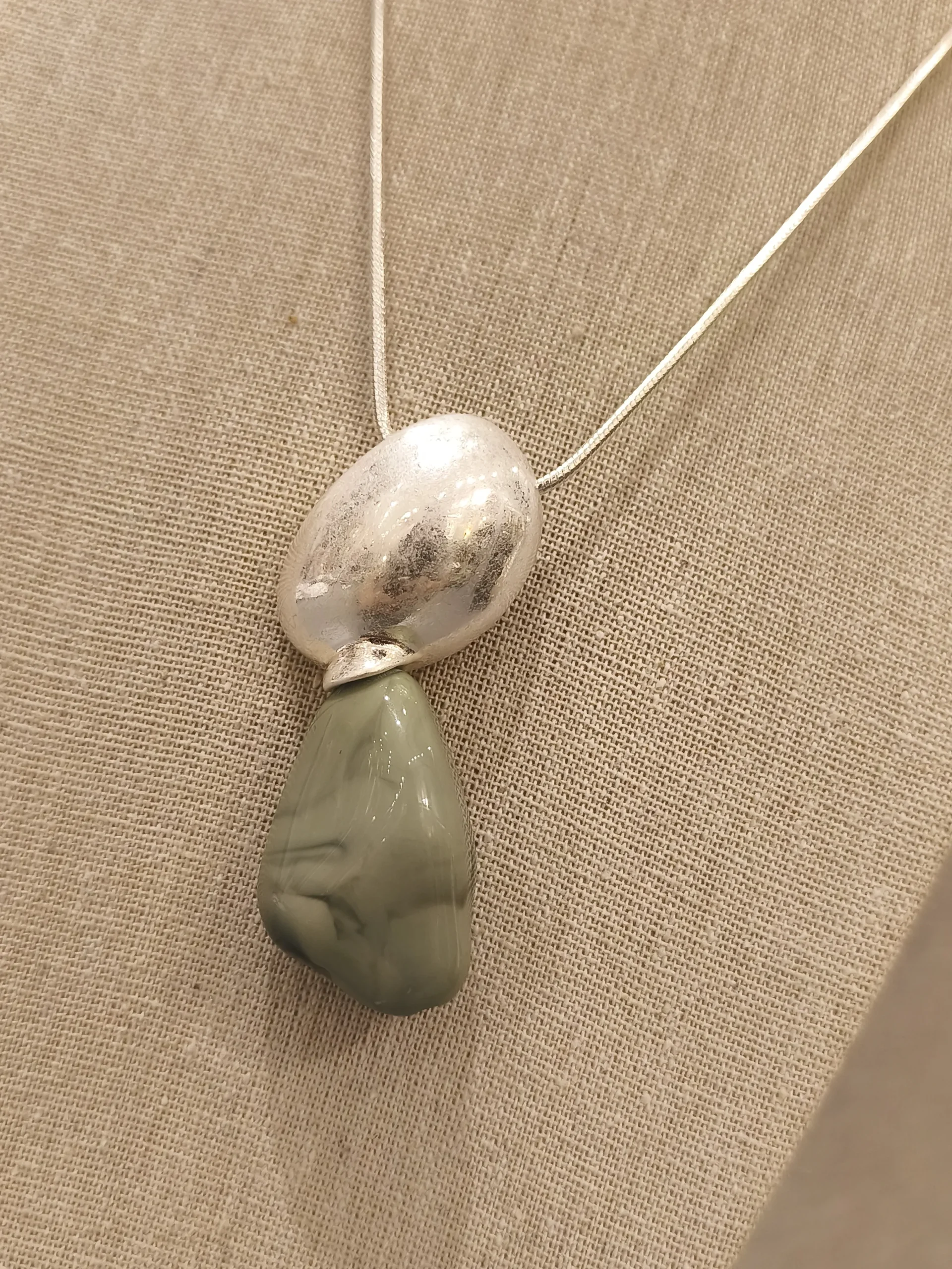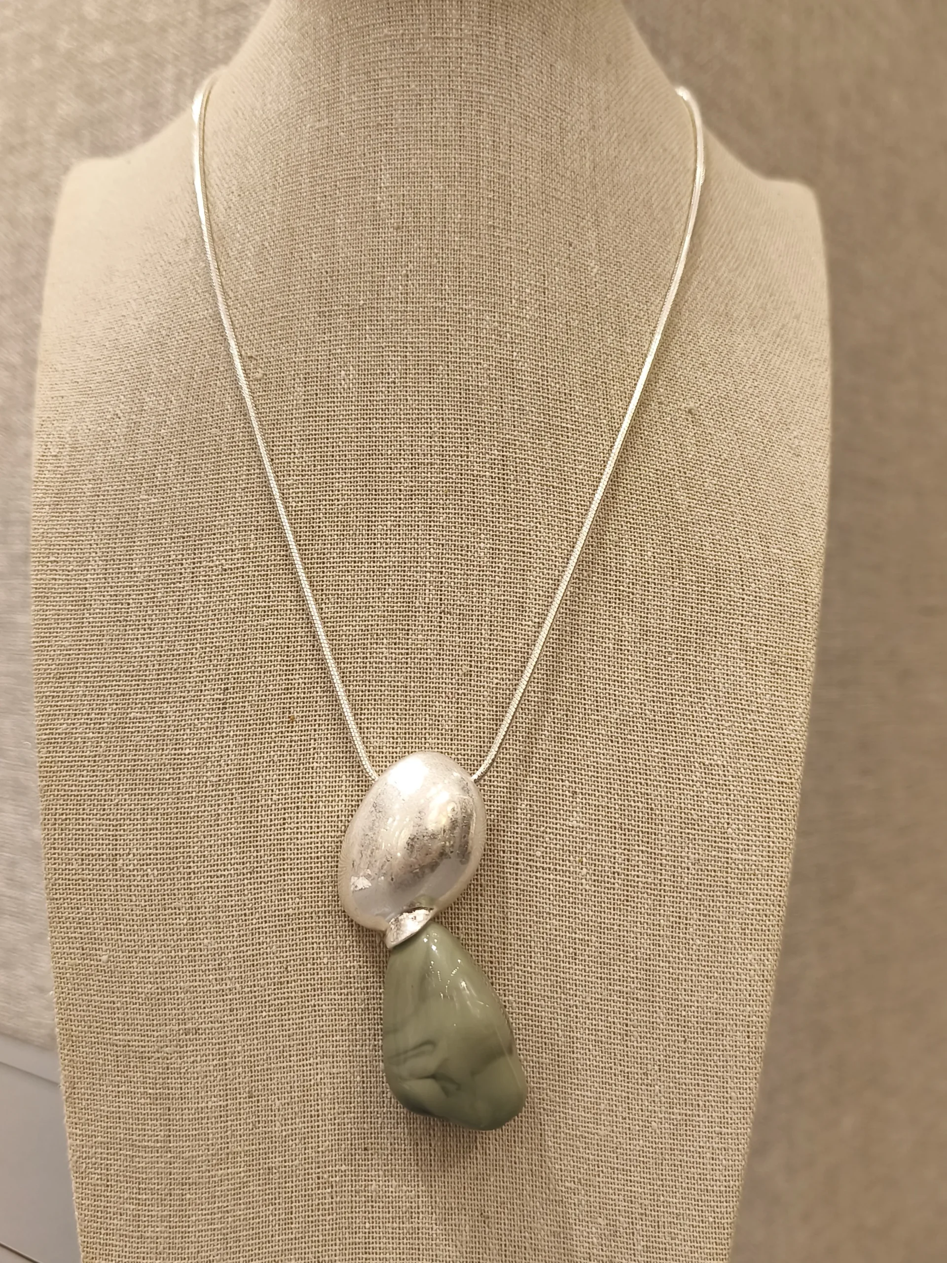 Para variar o uso, experimente combiná-lo com uma blusa de gola alta em tom bege ou terracota, criando um contraste elegante que destaca ainda mais o verde da resina e o acabamento fosco da prata 🤎.