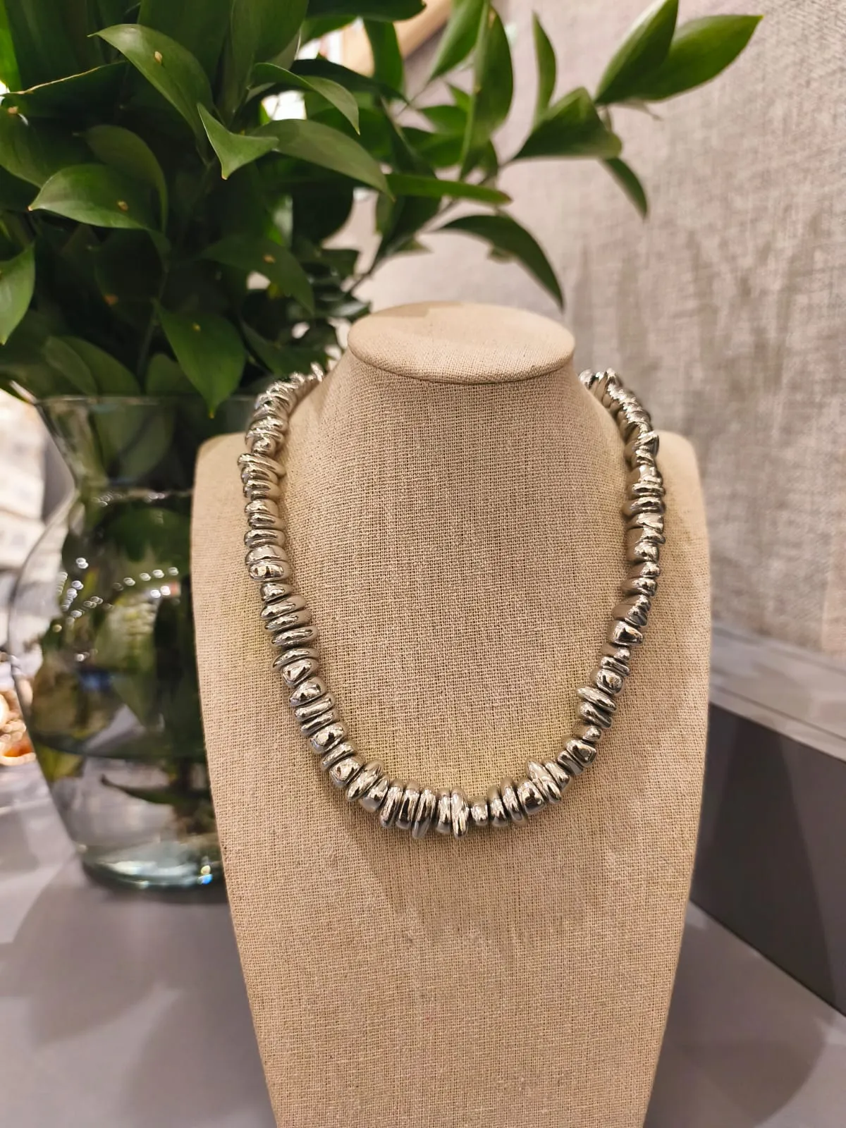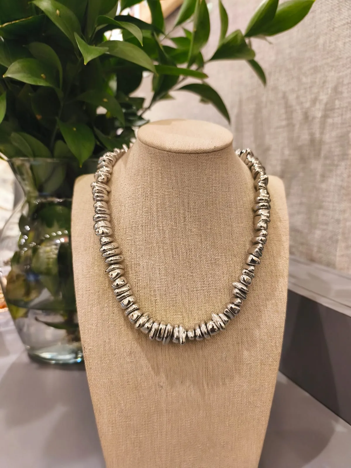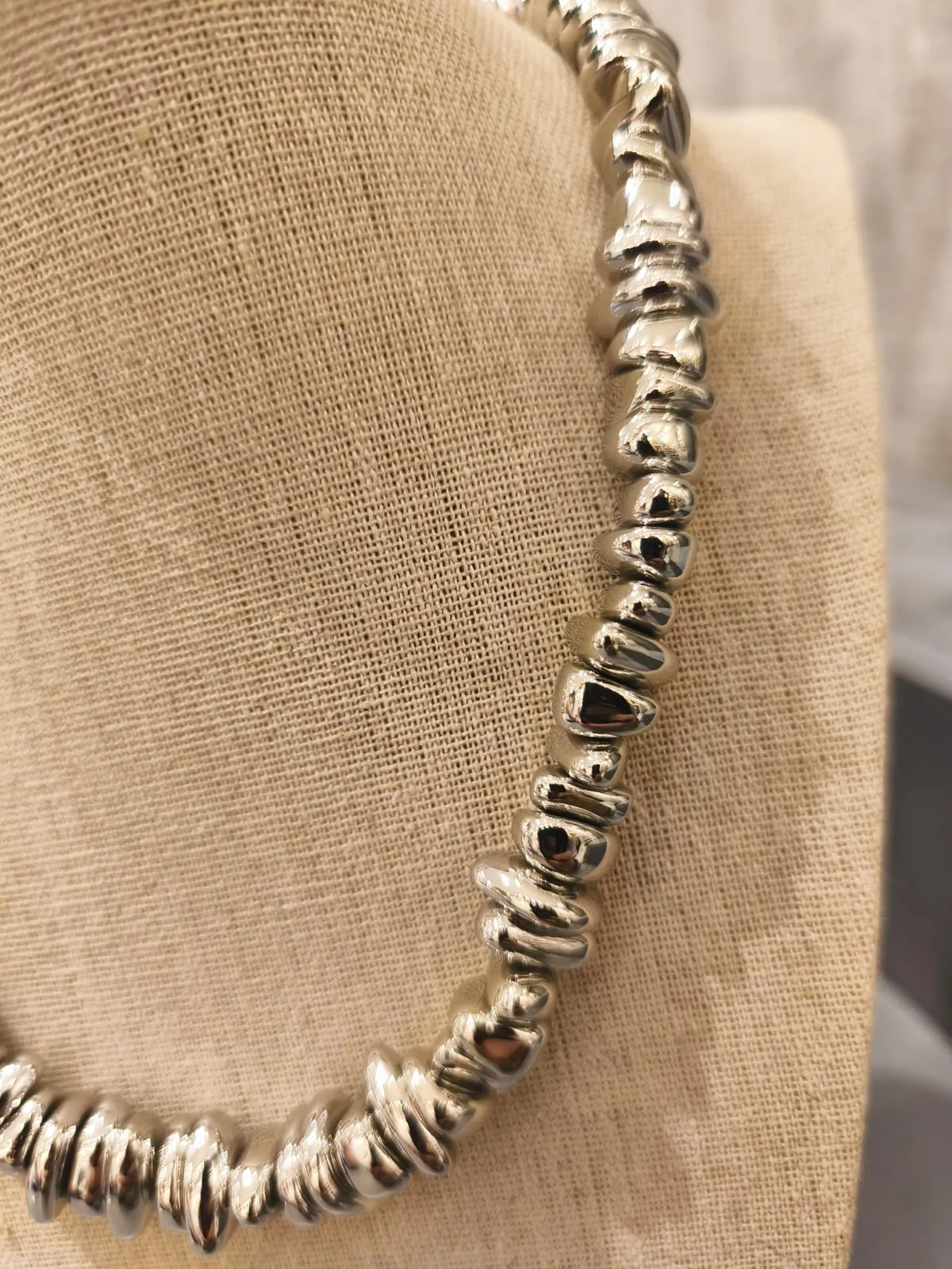 Dica de estilo: use o colar prateado cascalho com uma blusa de gola alta preta ou um vestido fluido em tons neutros. Para um toque extra de estilo, combine-o com brincos pequenos de prata fosca — o resultado é um visual harmônico, sofisticado e cheio de personalidade.
