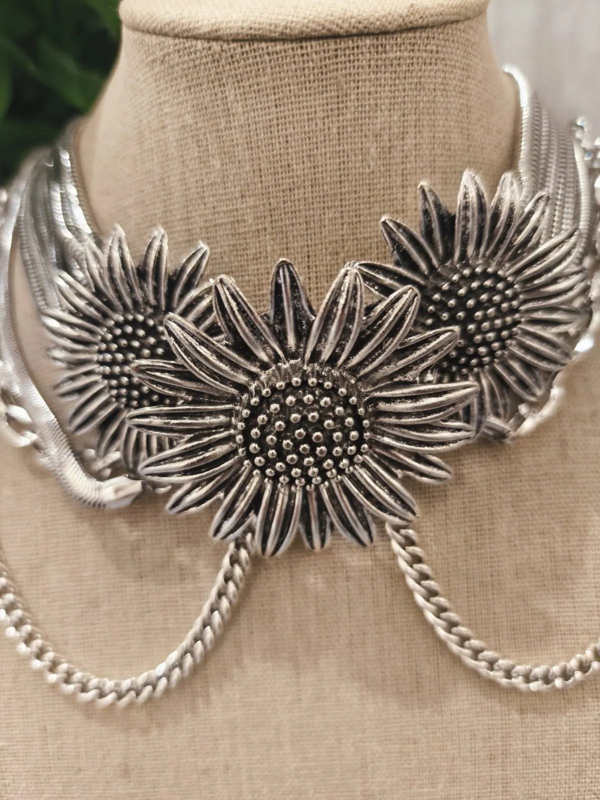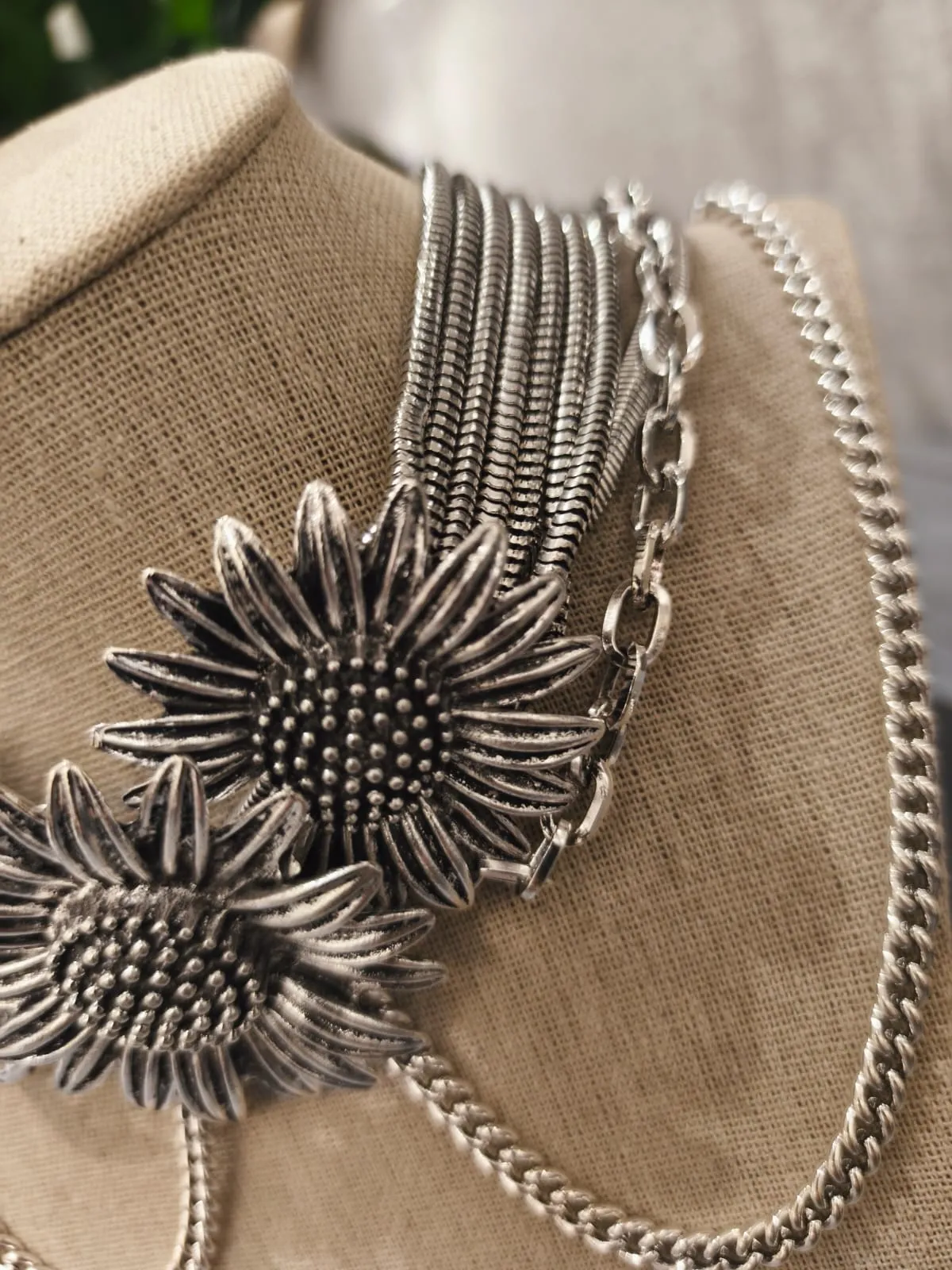 O colar prateado fios com flores é uma joia statement que combina força, feminilidade e arte em um único design. Suas correntes em diferentes texturas se entrelaçam com harmonia, criando movimento e volume, enquanto as flores centrais esculpidas em metal trazem um toque romântico e exuberante. O banho prateado com acabamento envelhecido confere personalidade e um ar sofisticadamente boho, ideal para mulheres que amam acessórios com presença e significado. É uma peça que transforma qualquer produção em algo único e memorável.