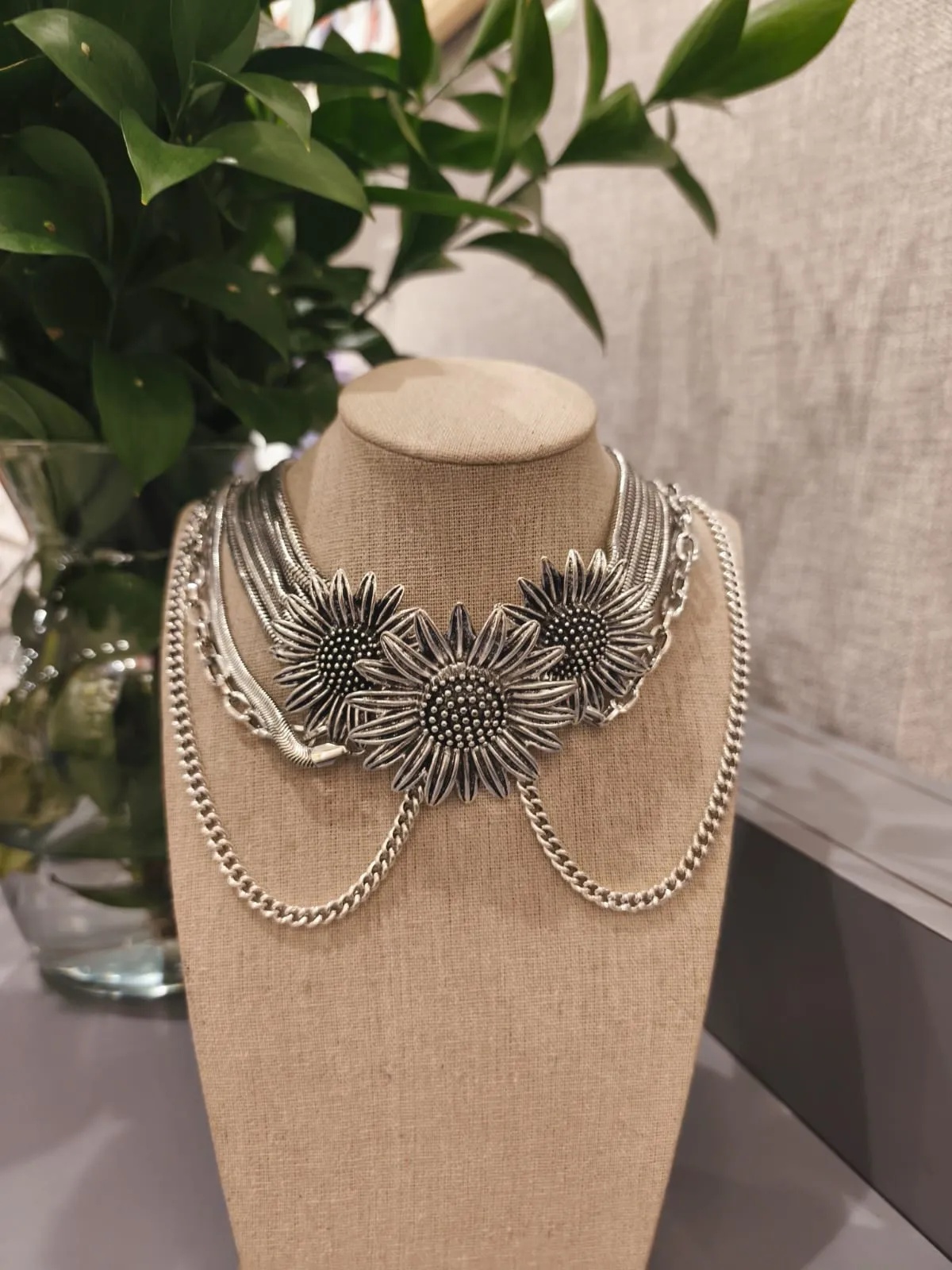 Dica de estilo: use o colar prateado fios com flores sobre uma camisa branca de gola aberta ou com um vestido fluido em tons neutros. Para um look mais ousado e contemporâneo, combine-o com jaqueta de couro e cabelo preso — o contraste entre o metal e o tecido cria um visual poderoso e cheio de atitude.