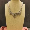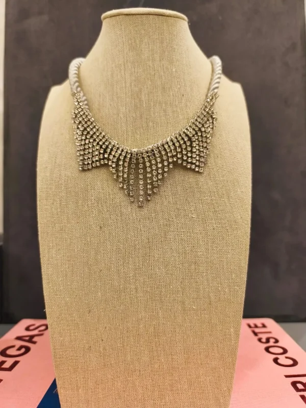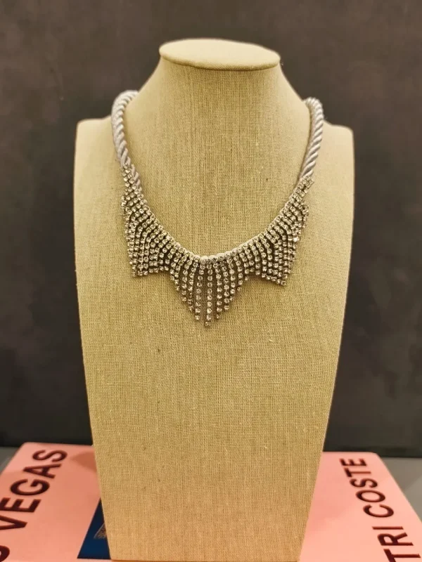 Palavras-chave: colar prateado, colar de strass, colar com franjas, colar glamouroso, colar elegante, colar de festa, acessório sofisticado.