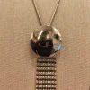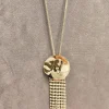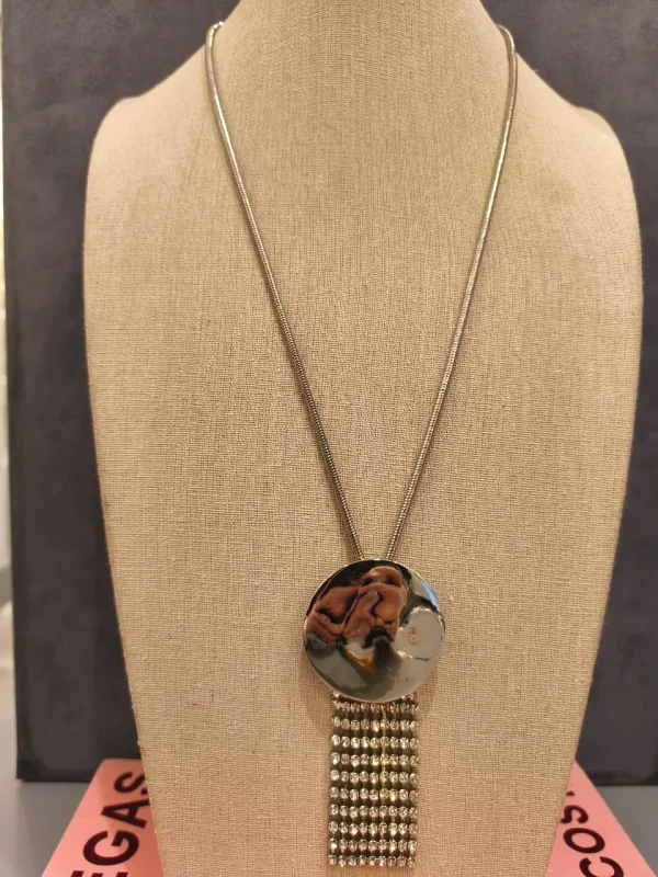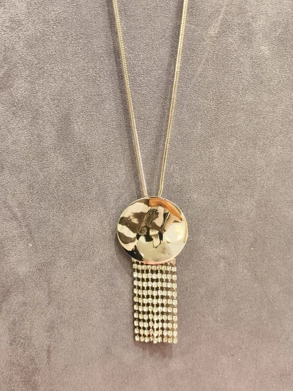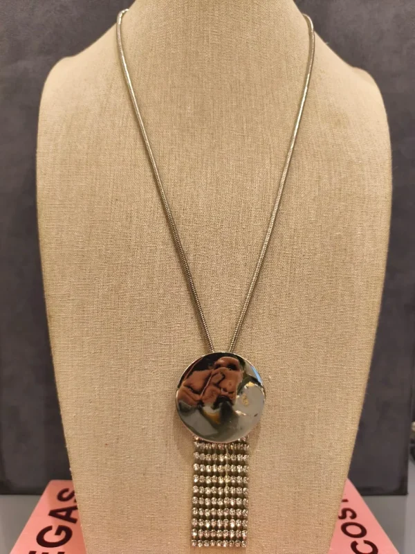 Palavras-chave: colar prateado, colar longo, colar com pingente, colar com franjas, colar elegante, colar sofisticado, colar de strass.