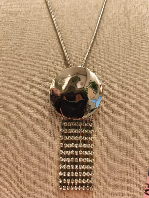 O colar prateado com placa metalizada é uma peça moderna e elegante que imprime estilo de forma imediata. Sua corrente longa e delicada destaca o pingente redondo em metal polido, que reflete a luz com sofisticação. A aplicação de franjas em strass na parte inferior do pingente adiciona movimento e brilho sutil, criando um contraste perfeito entre minimalismo e glamour. É o tipo de acessório que se adapta facilmente a diferentes ocasiões, do look de trabalho ao visual noturno, sempre trazendo um toque refinado e contemporâneo.
