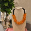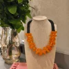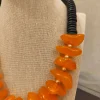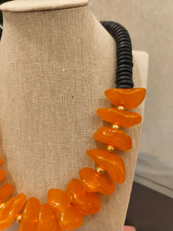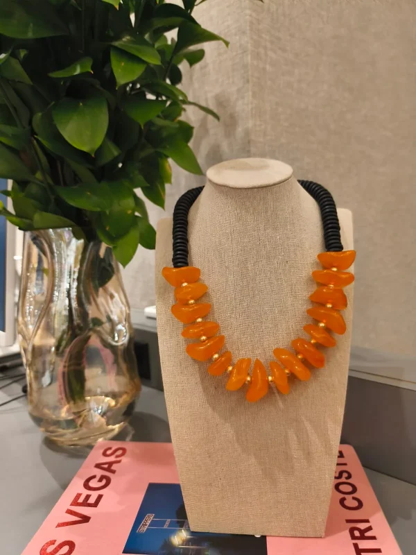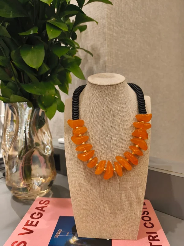 Ficha técnica: colar confeccionado em resina de alta qualidade, com discos em tom laranja vibrante e acabamento em contas pretas. Fecho metálico seguro. Origem nacional. Para melhor conservação, evite contato com perfumes, água ou superfícies abrasivas.