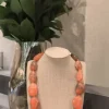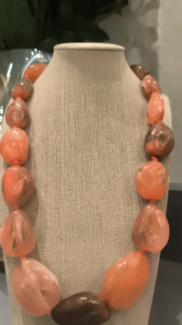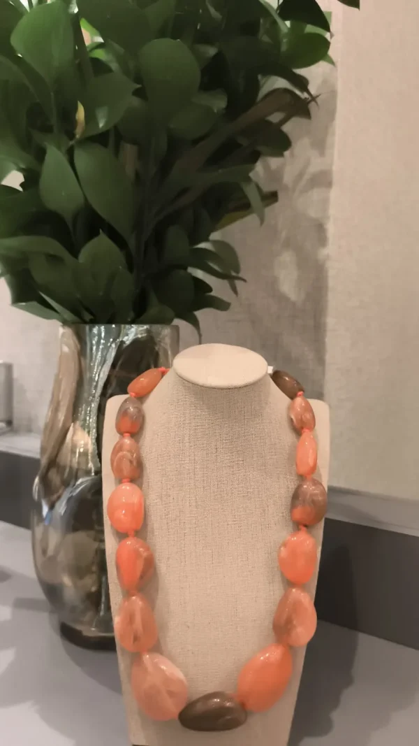 Colar longo com contas irregulares em resina laranja e tons terrosos, trazendo uma proposta natural e vibrante ao visual. 🌿🌅