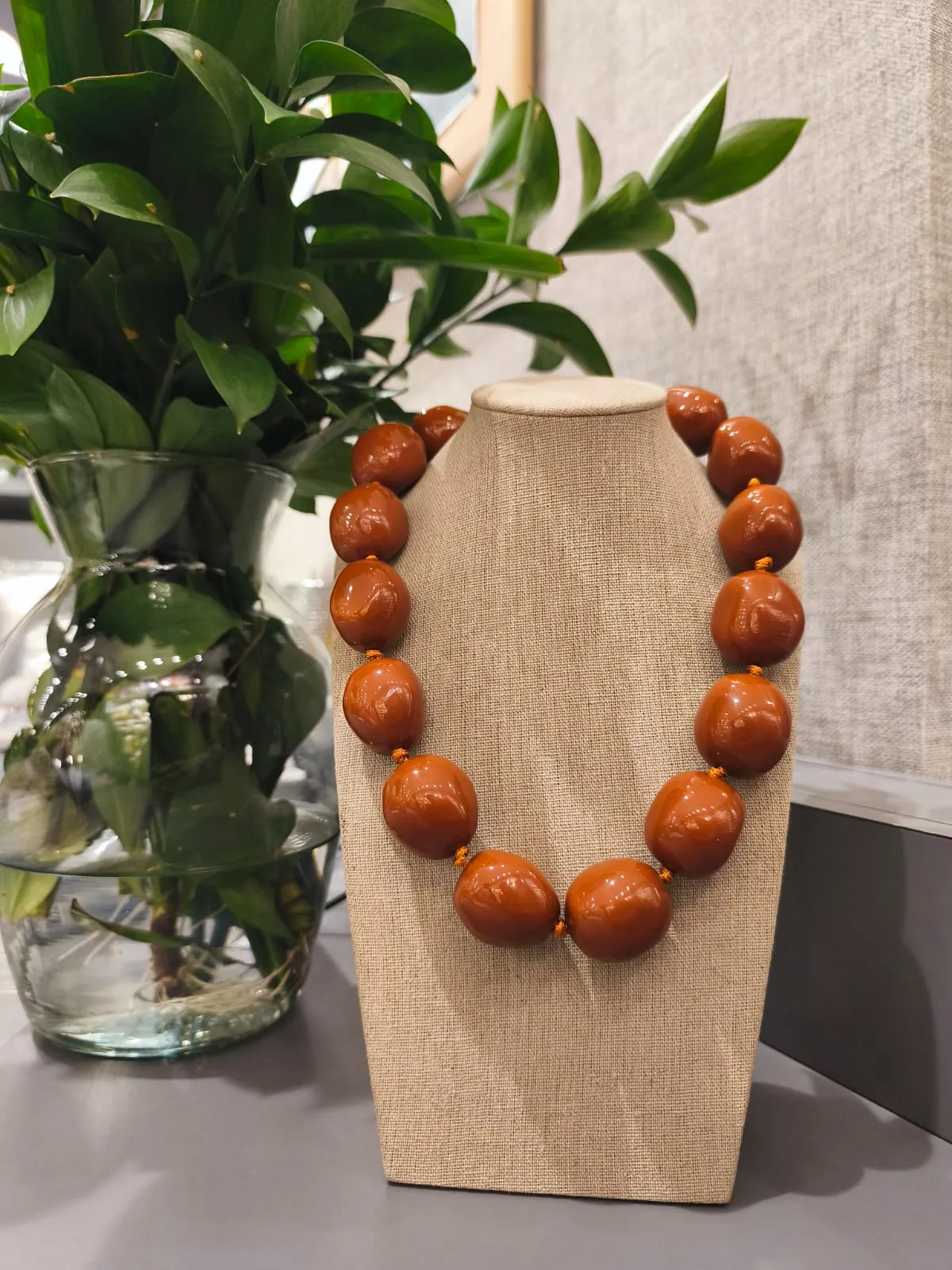 Dica de estilo: o colar resina marrom é ideal para looks de inspiração terrosa ou natural. Combine com peças em linho, algodão ou seda, em tons neutros como bege, caramelo, off white ou verde-oliva. Ele também se destaca em produções monocromáticas, adicionando textura e elegância ao visual.