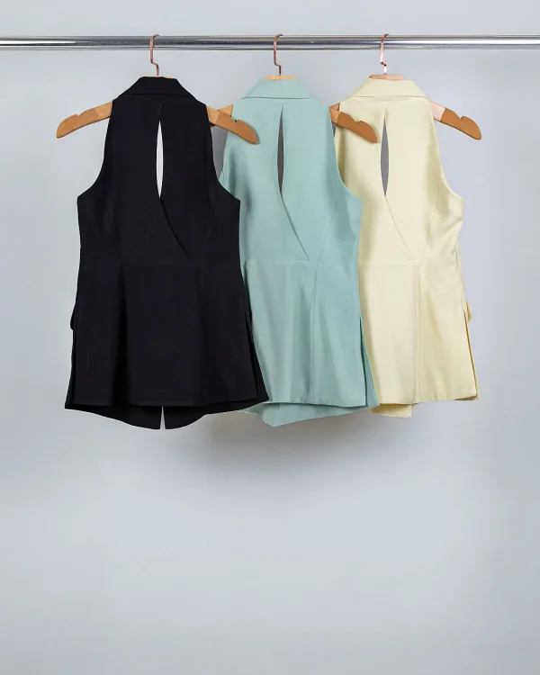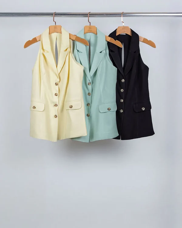 Um colete que é puro estilo e versatilidade. Em alfaiataria de viscose, ele tem a leveza que o tecido proporciona e a elegância da gola de blazer, criando um visual moderno e cheio de personalidade. Os botões e a pala com bolsos frontais trazem sofisticação, enquanto a abertura nas costas garante movimento e frescor. É aquela peça que transforma qualquer look em algo especial.
