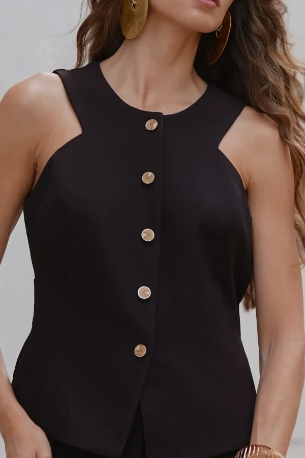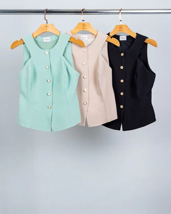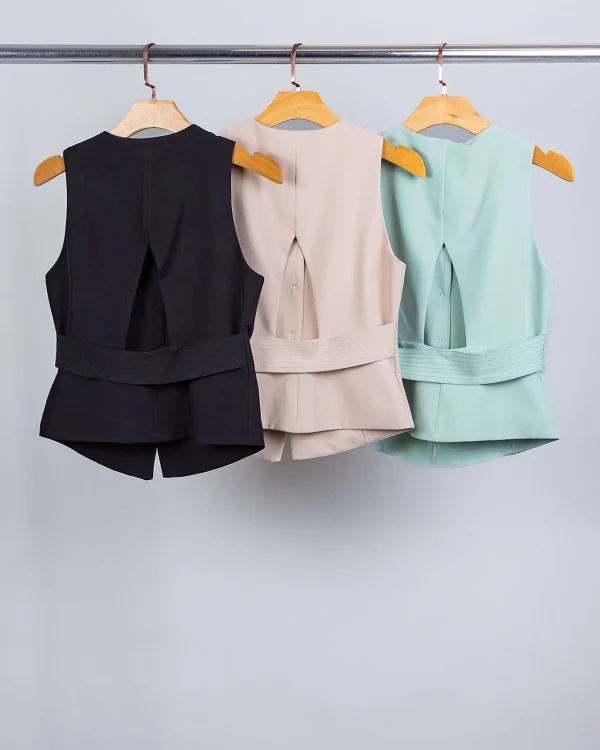Esse colete é o tipo de peça que transforma qualquer look sem esforço. A alfaiataria impecável com cava americana valoriza os ombros e traz aquela postura elegante, mas de um jeito moderno e nada careta. Os botões frontais dão um ar sofisticado e a faixa pespontada nas costas surpreende no detalhe – é aquele acabamento que entrega bom gosto de longe.