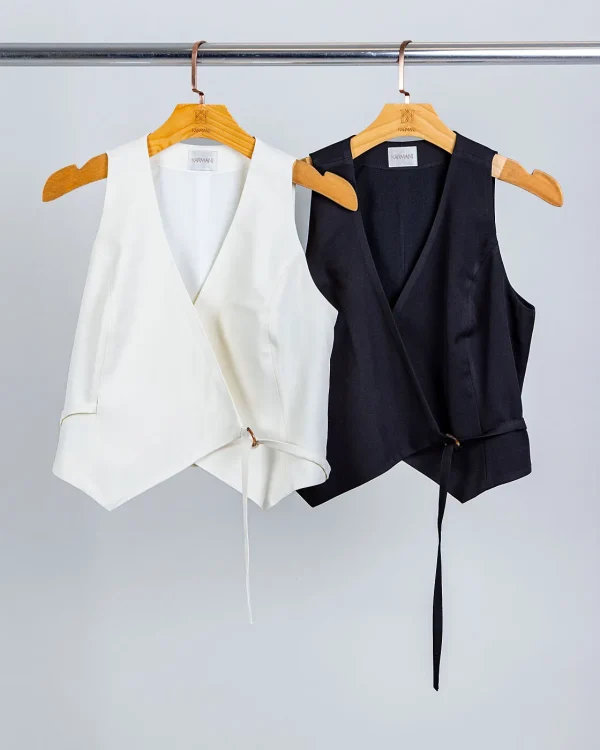 O colete que transforma qualquer look em sinônimo de estilo. Feito em alfaiataria estruturada, ele traz o charme do transpasse frontal com fechamento por argola e faixa para amarração, garantindo um caimento impecável e ajustado ao corpo. Uma peça que mistura sofisticação e modernidade, perfeita para atualizar produções do dia a dia ou criar composições poderosas.