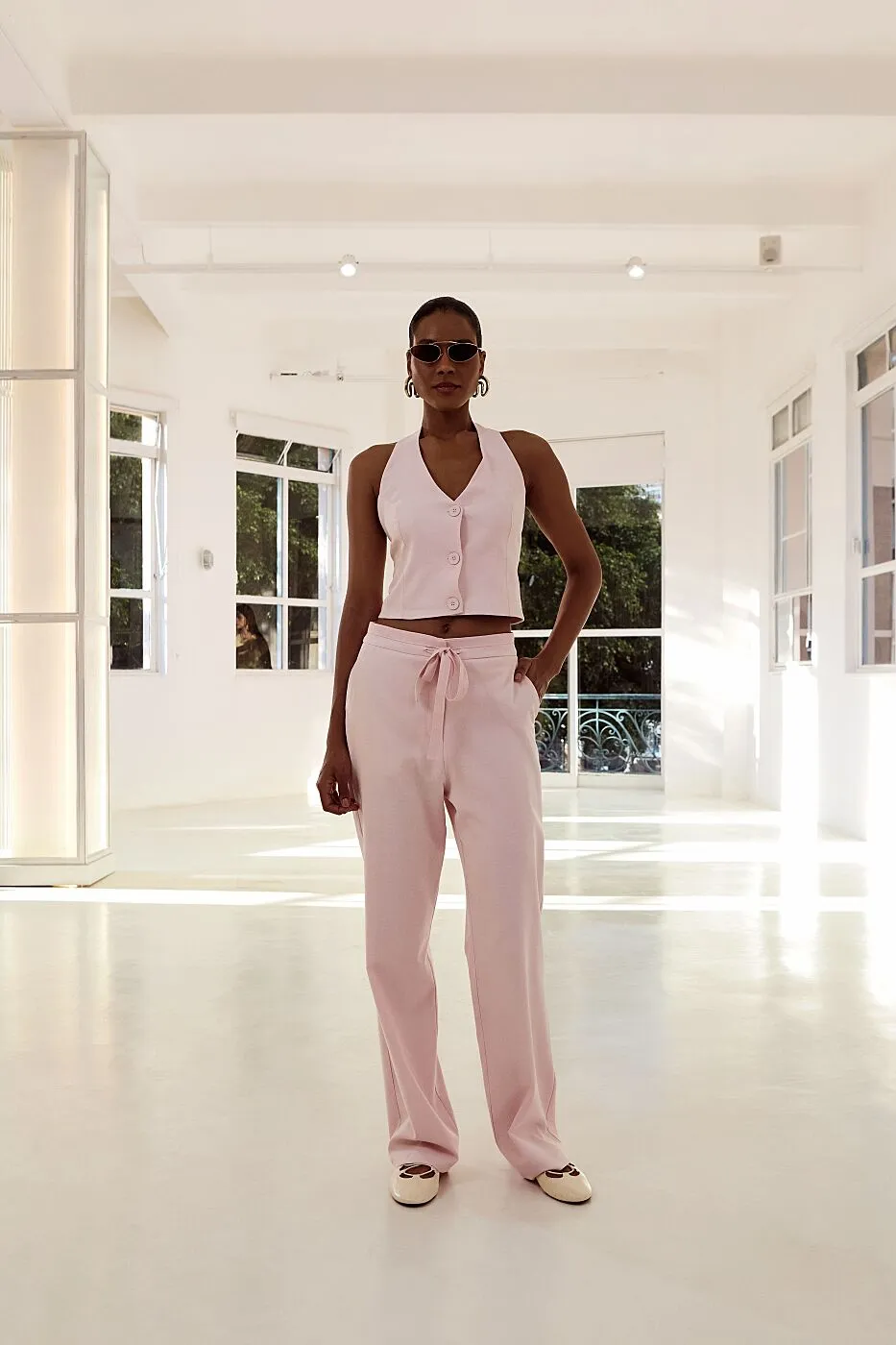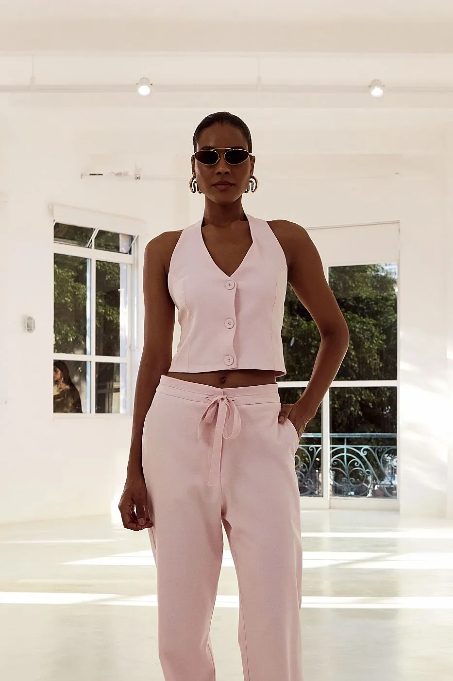 O colete de alfaiataria é uma peça que une estrutura e suavidade, criando um visual contemporâneo e extremamente elegante. Confeccionado em tecido de viscose com poliamida e elastano, ele tem toque macio, caimento impecável e um leve stretch que garante conforto e liberdade de movimento. A modelagem acinturada valoriza a silhueta com delicadeza, enquanto o decote em “V” e os botões frontais trazem um ar clássico e atemporal. O tom rosa claro adiciona feminilidade e frescor à produção, tornando o colete ideal tanto para looks de trabalho quanto para ocasiões mais casuais em que o estilo fala mais alto.