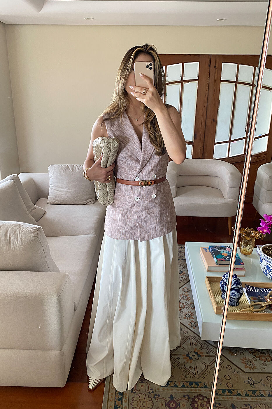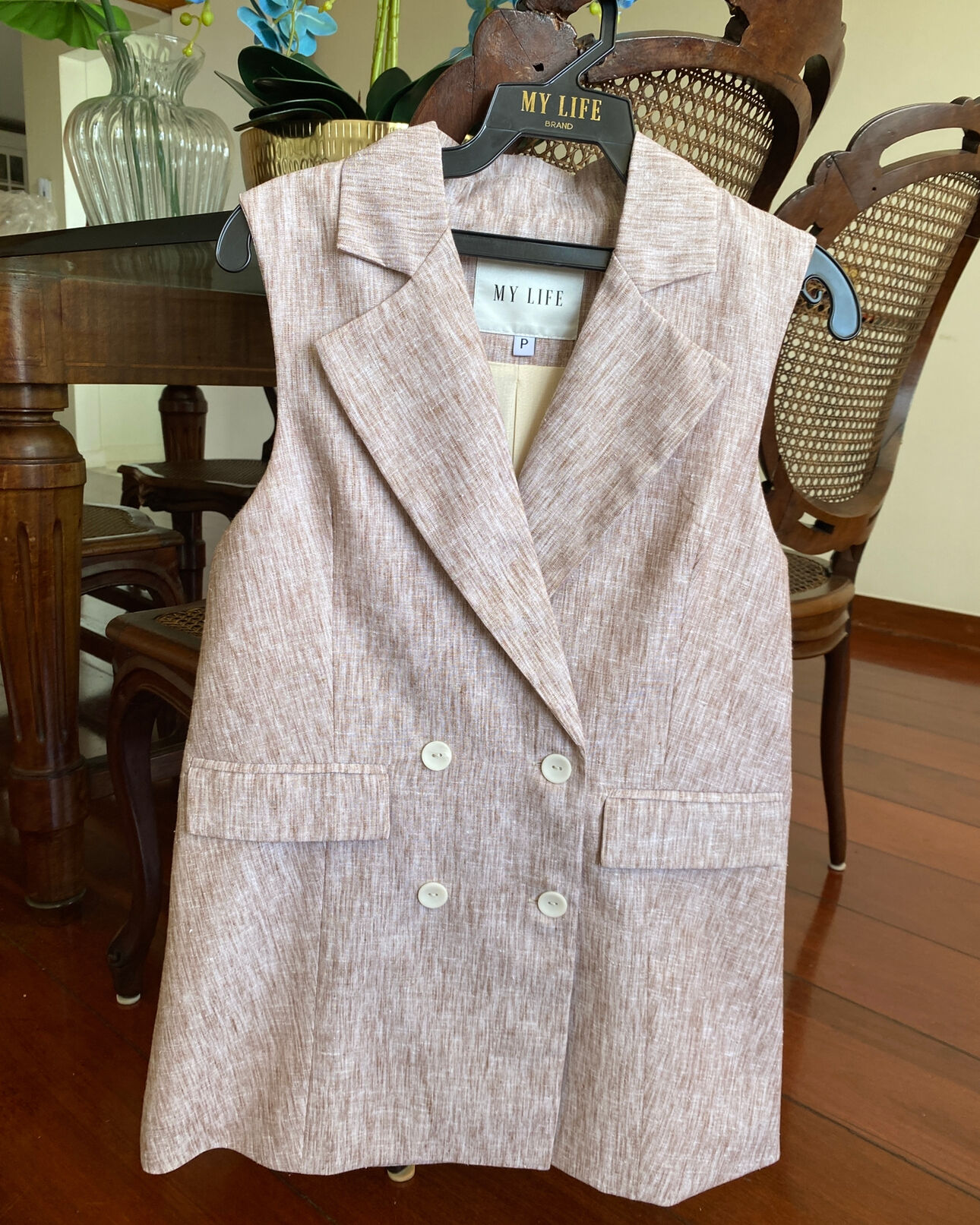 Como dica de estilo 💡, use esse colete de alfaiataria alongado com a calça pantalona do mesmo tecido para um conjunto sofisticado e poderoso, ou combine com uma saia midi fluida e sandálias de salto médio para um look elegante e contemporâneo, perfeito para eventos diurnos ou reuniões importantes.