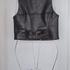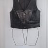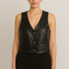 Colete em couro preto, peça moderna e sofisticada que garante estrutura e um caimento impecável. O design conta com decote em V profundo, abotoamento frontal metálico e bolsos decorativos, detalhes que trazem estilo e personalidade.
