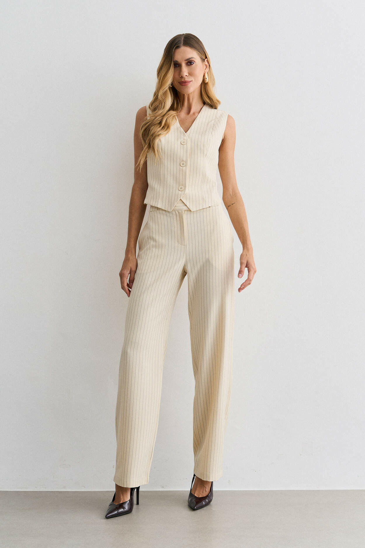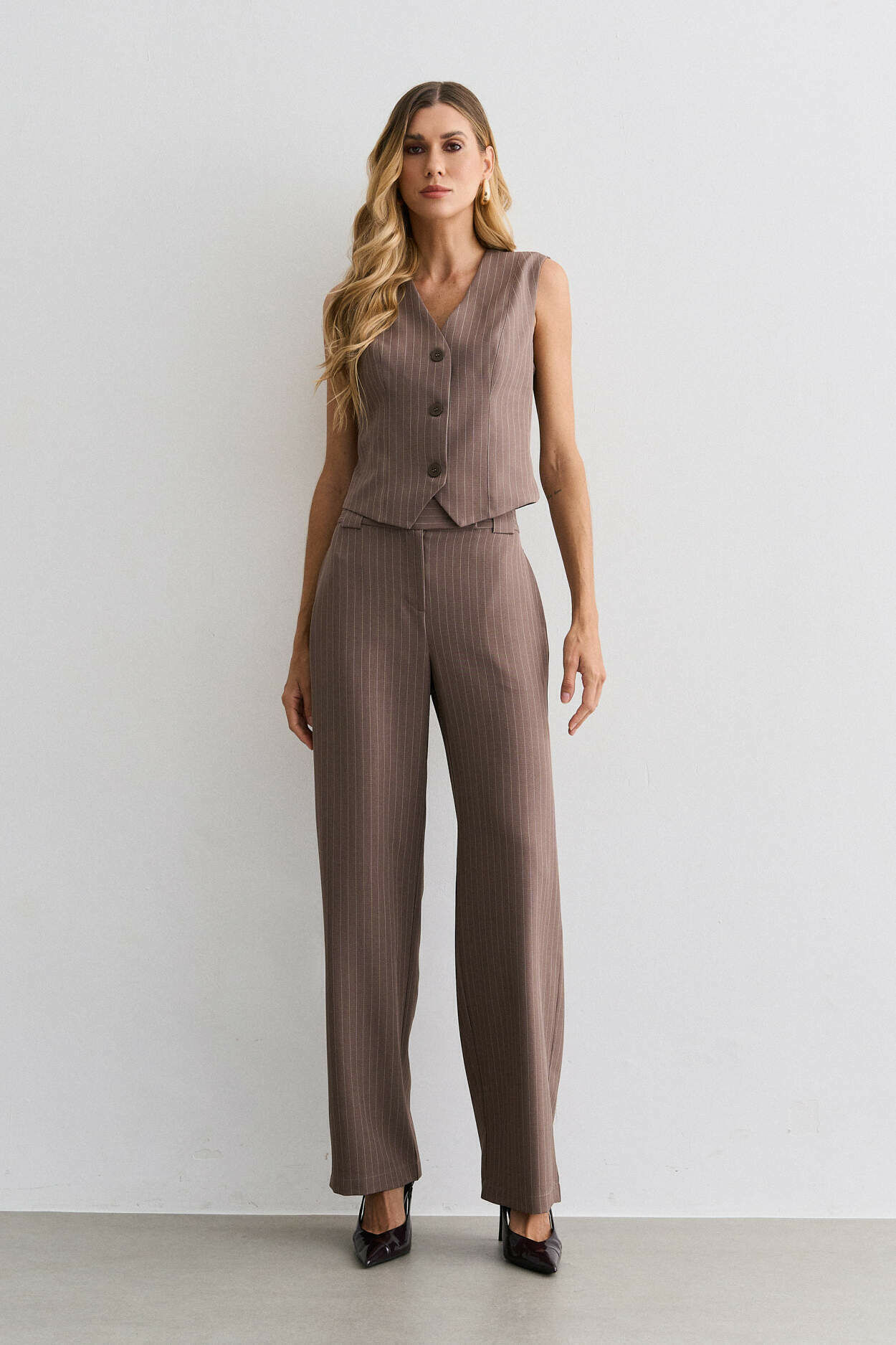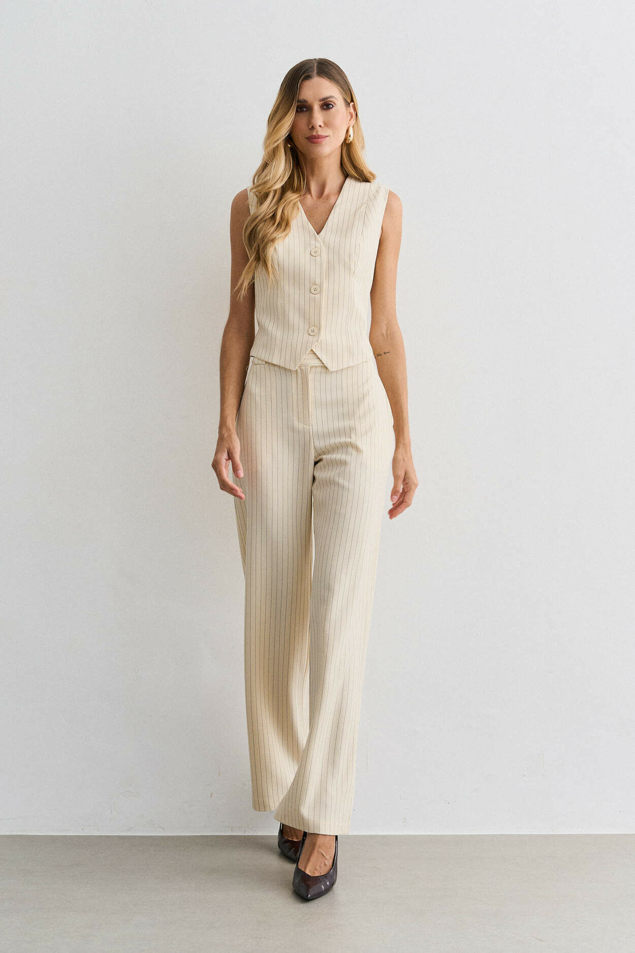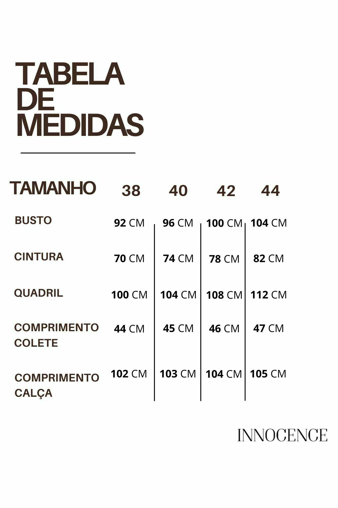 Conjunto alfaiataria risca de giz. Colete com ajuste costas. Calça pantalona com bolso nas laterais. 95% Poliéster 3% Elastano 2% Viscose | Forro: 97% Poliéster 3% Elastano