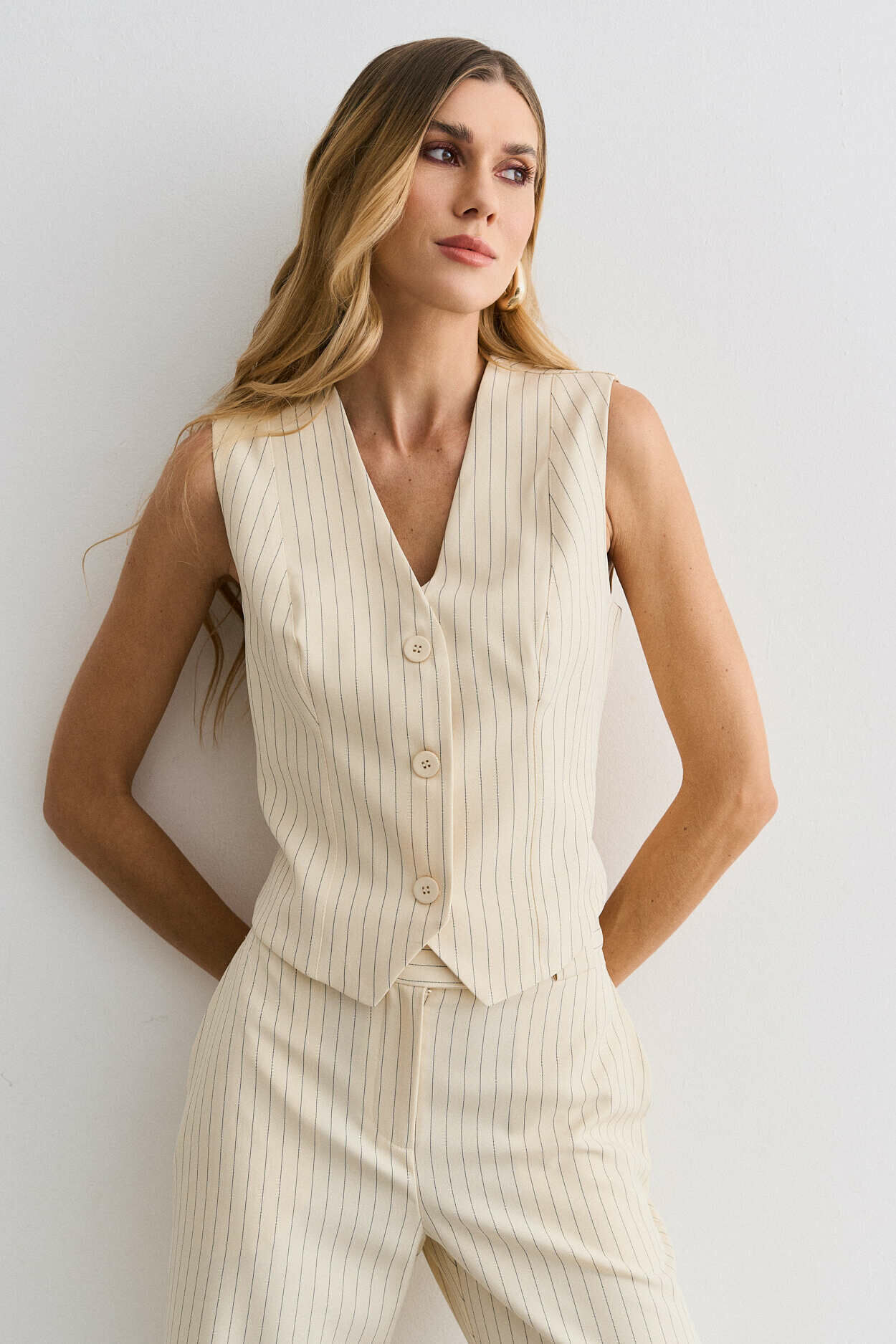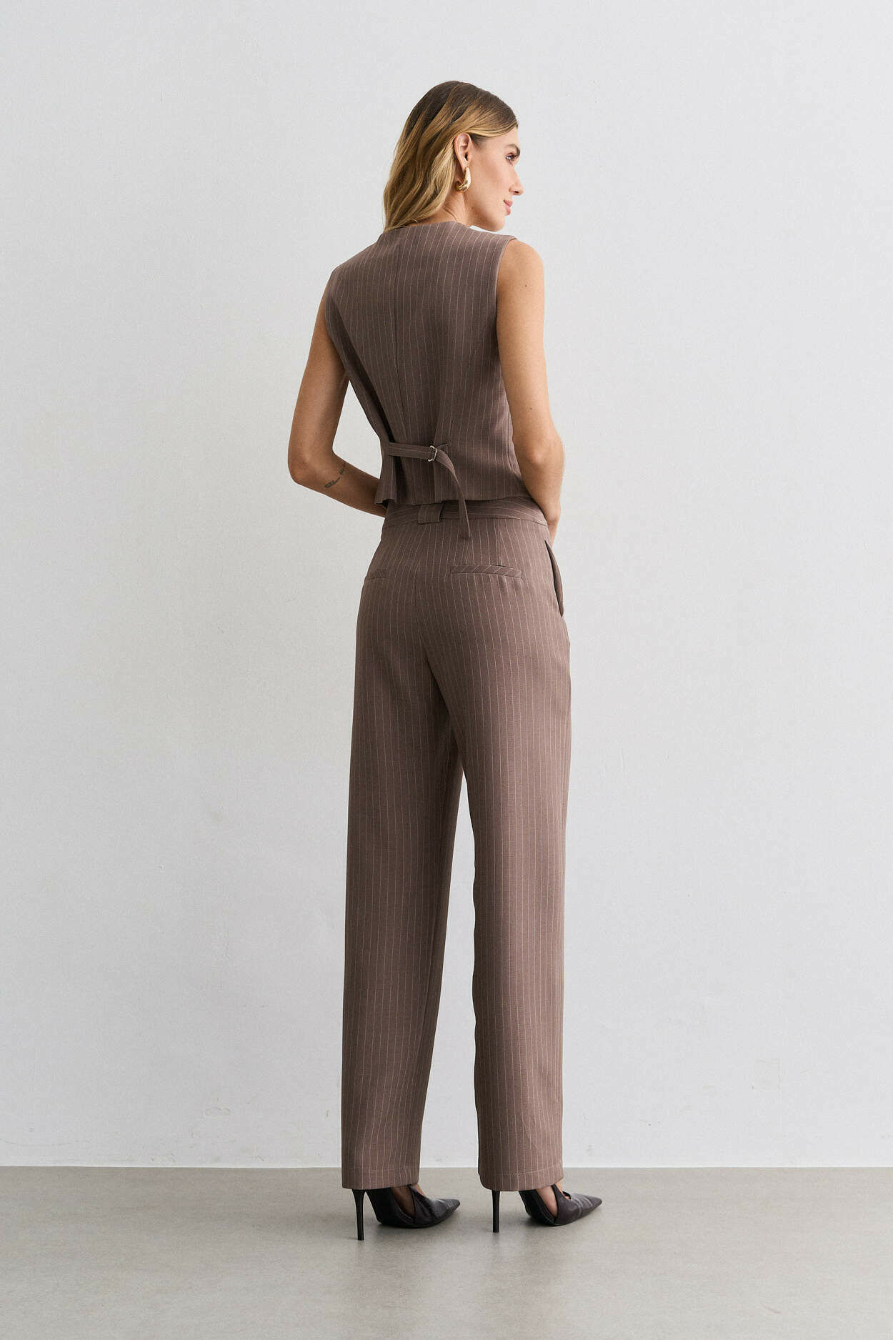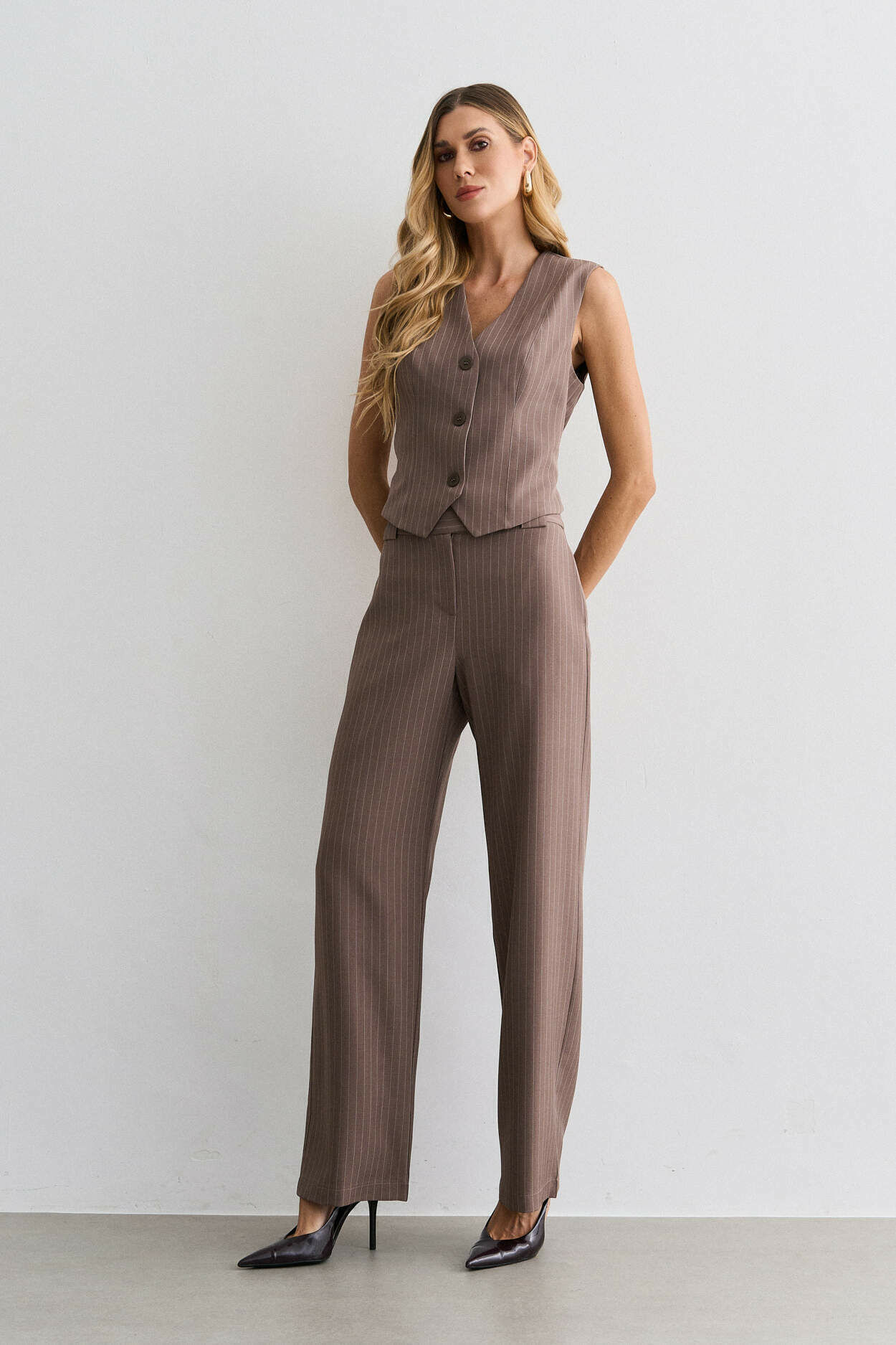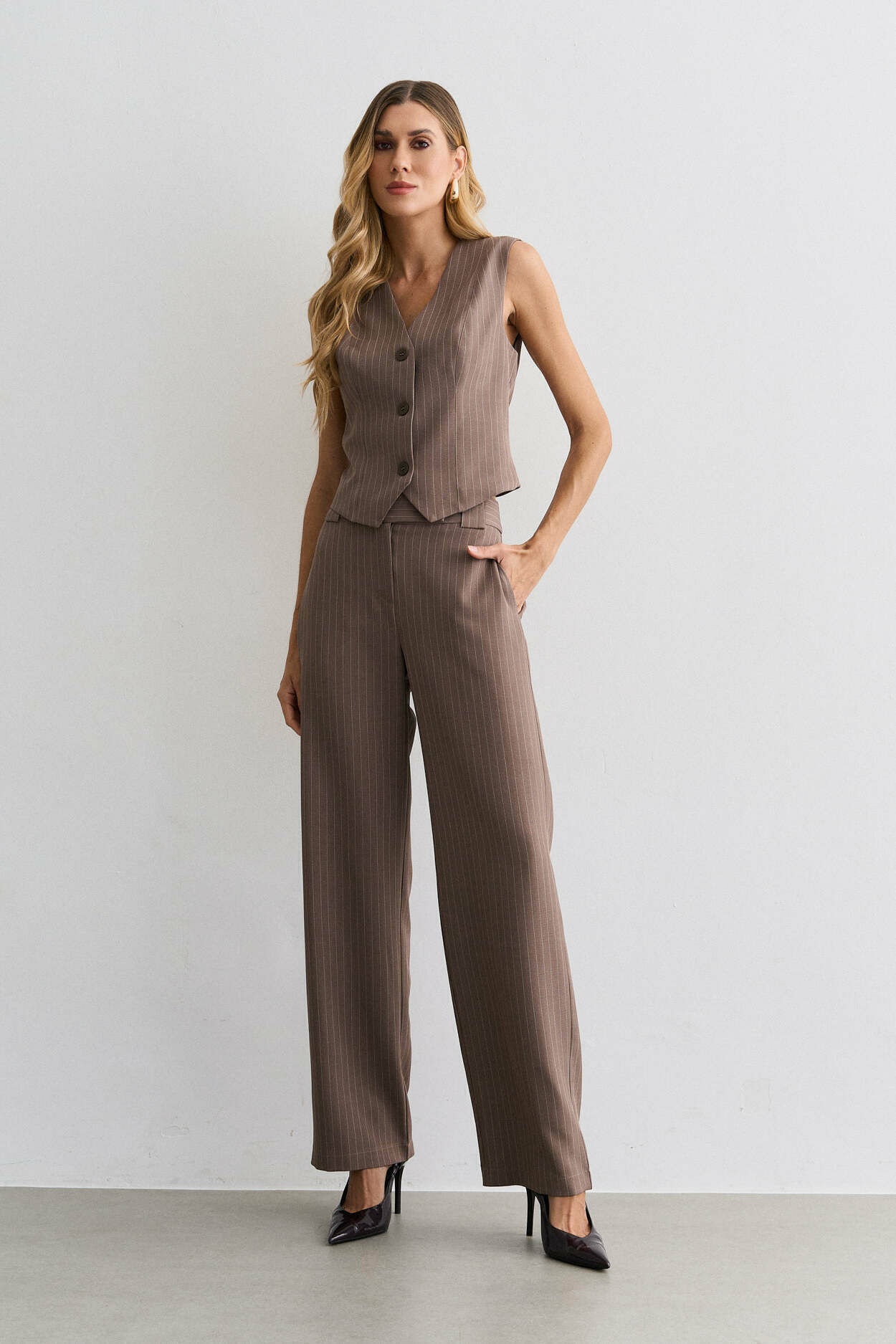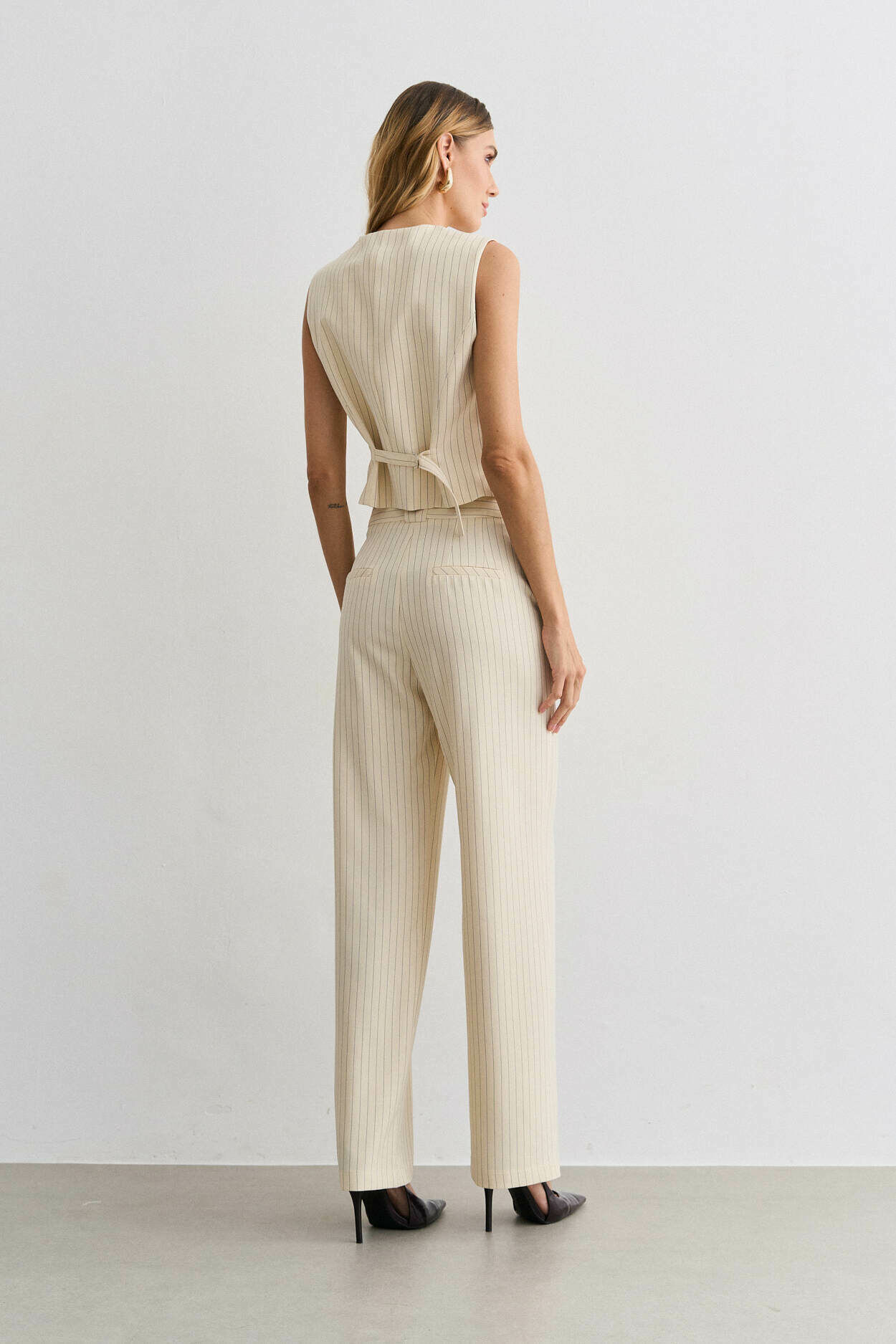 Conjunto alfaiataria risca de giz. Colete com ajuste costas. Calça pantalona com bolso nas laterais. 95% Poliéster 3% Elastano 2% Viscose | Forro: 97% Poliéster 3% Elastano