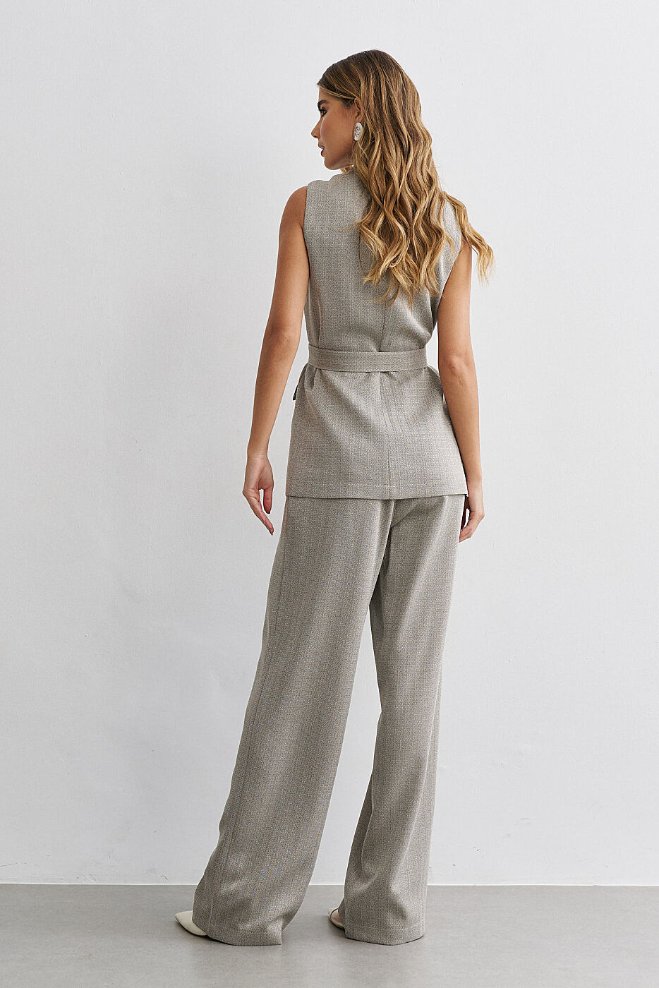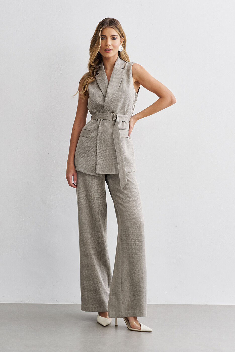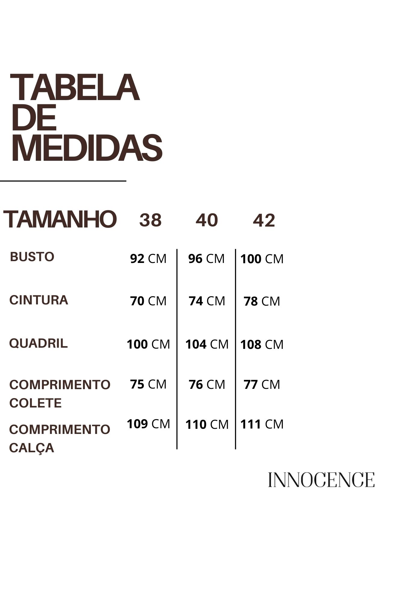 Conjunto alfaitaria textura. Colete acompanha faixa com fivela. Calça pantalona com bolso nas laterais.96% Poliéster 4% Elastano | 97% Poliéster 3% Elastano