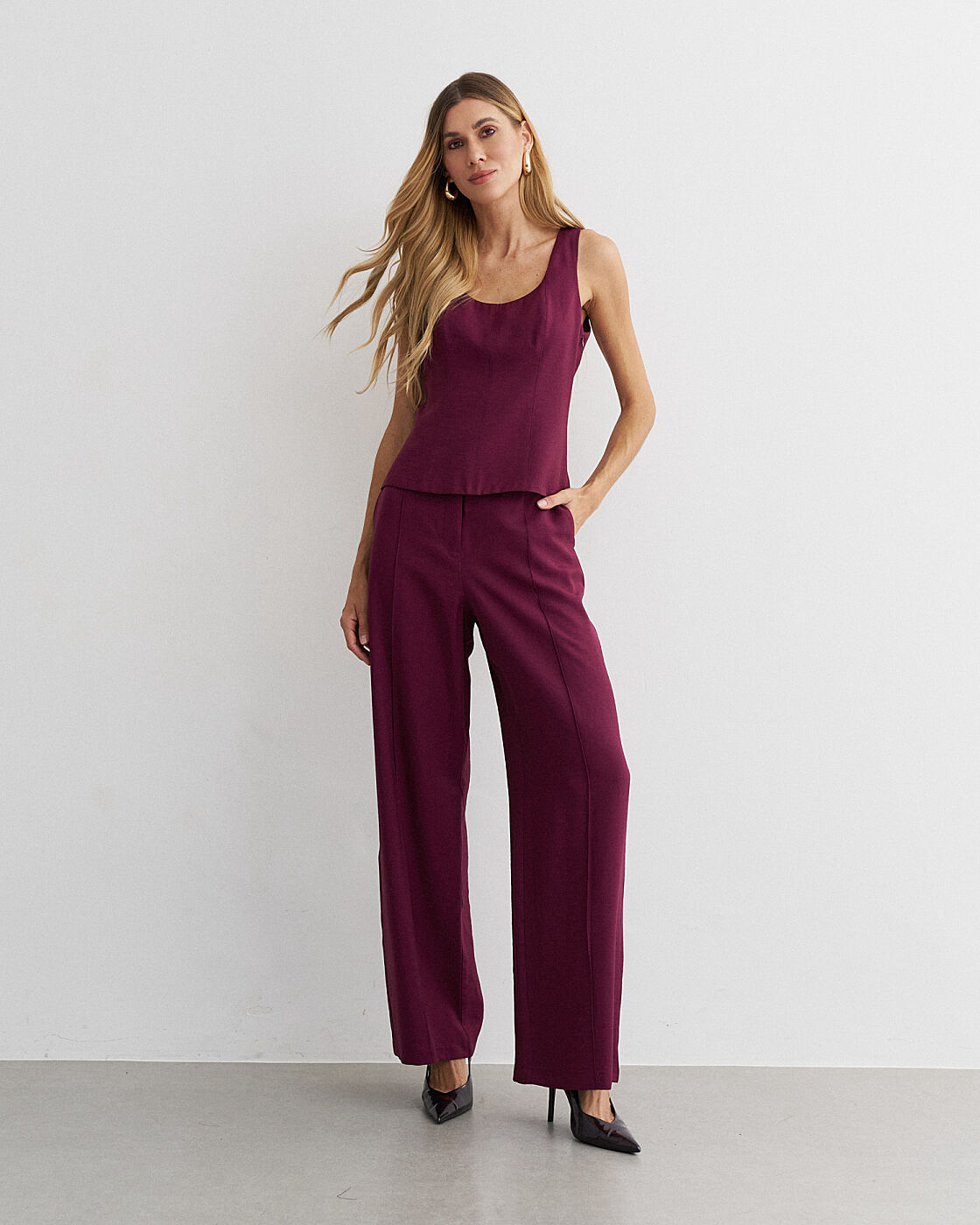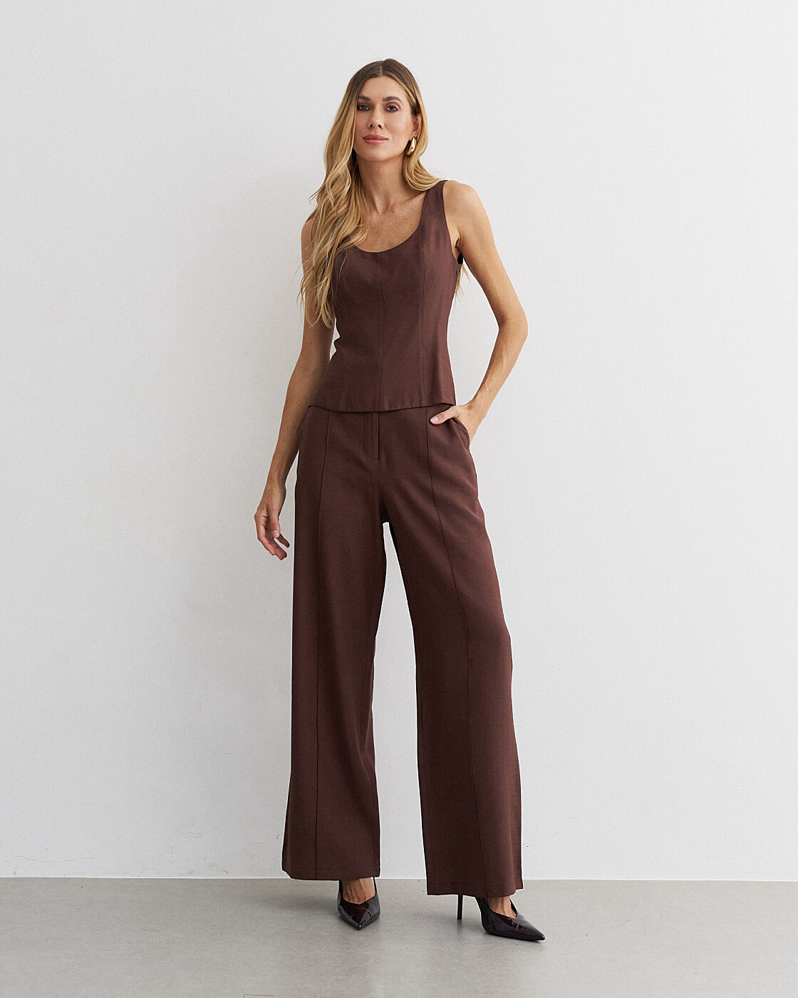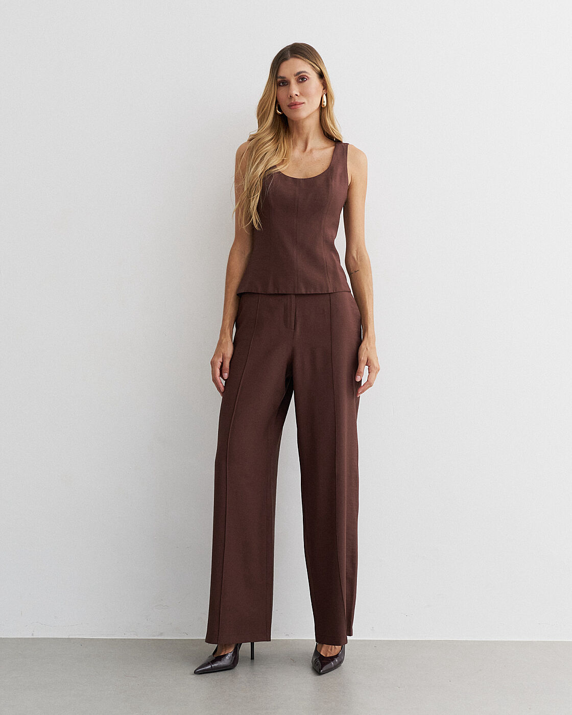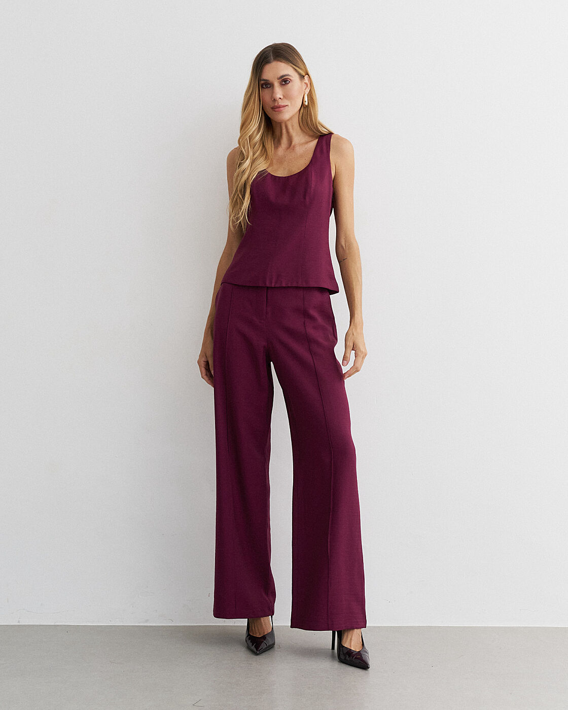 Conjunto alfaiataria viscose. Blusa recorte frontal. Calça pantalona com nervura.
