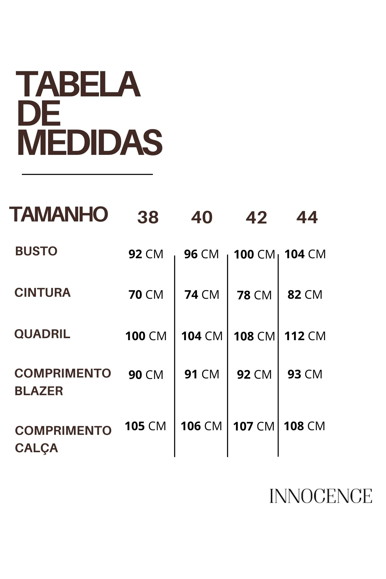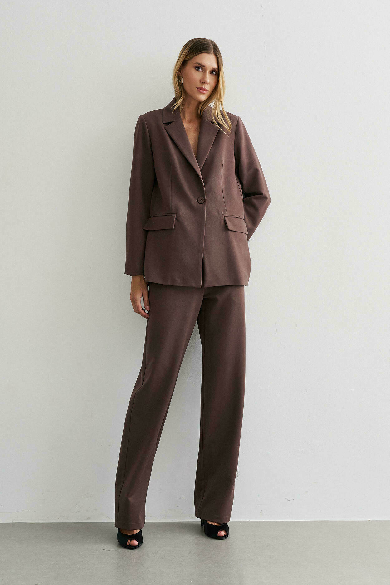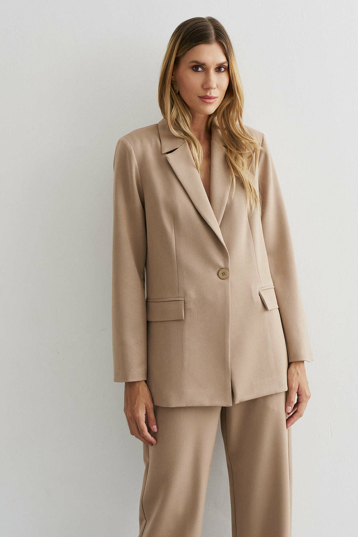 Conjunto com blazer estruturado, lapela e detalhe de bolso falso. Calça de modelagem reta com cós largo transpassado, bolsos laterais e bolso falso nas costas.