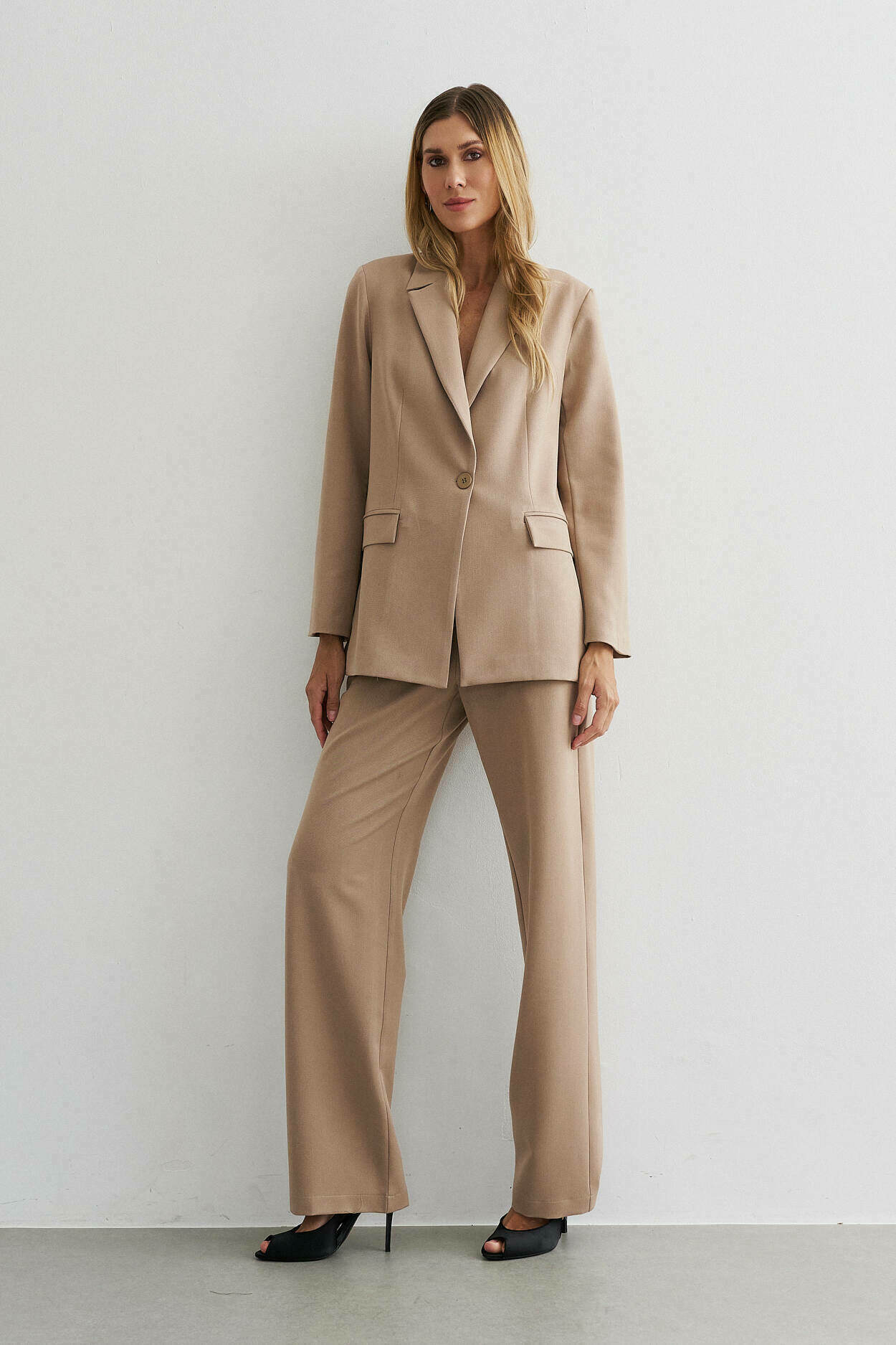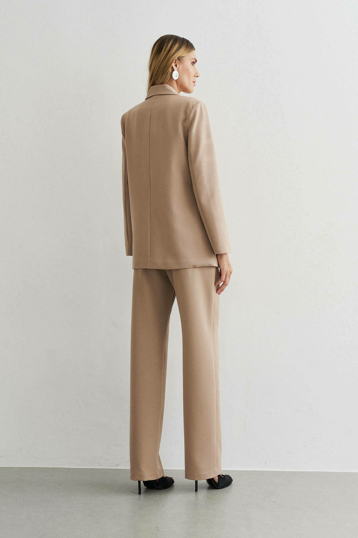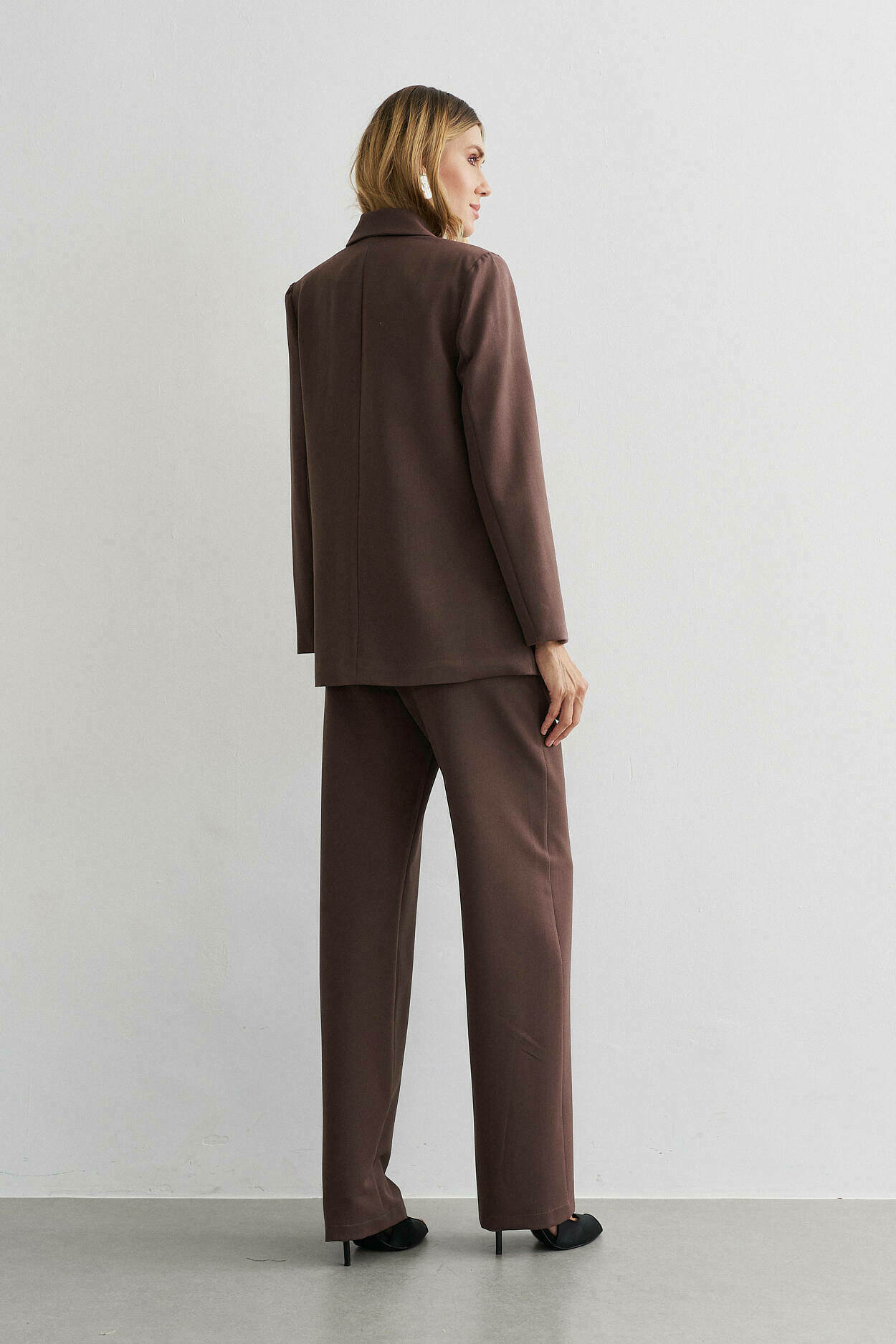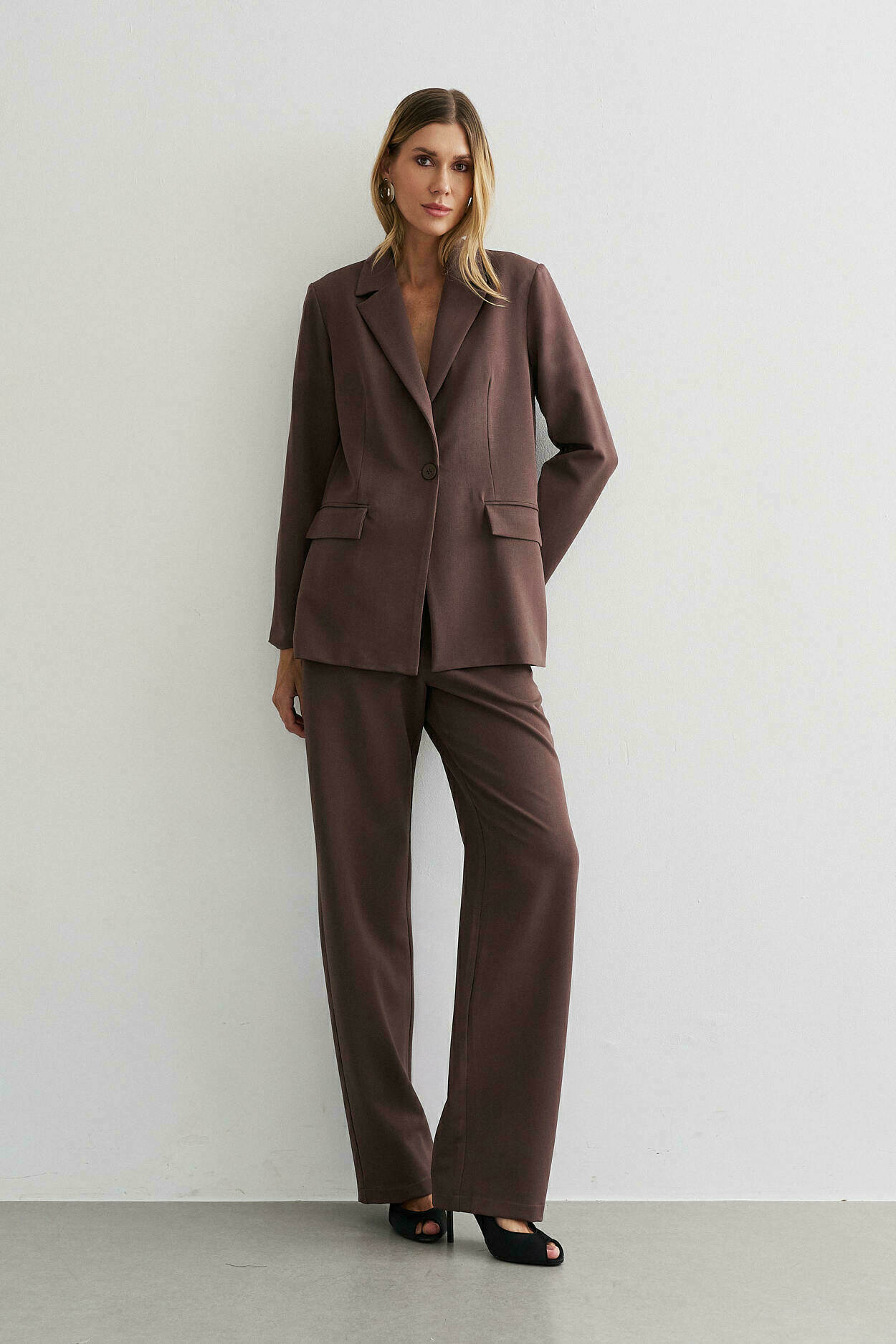 Conjunto com blazer estruturado, lapela e detalhe de bolso falso. Calça de modelagem reta com cós largo transpassado, bolsos laterais e bolso falso nas costas.