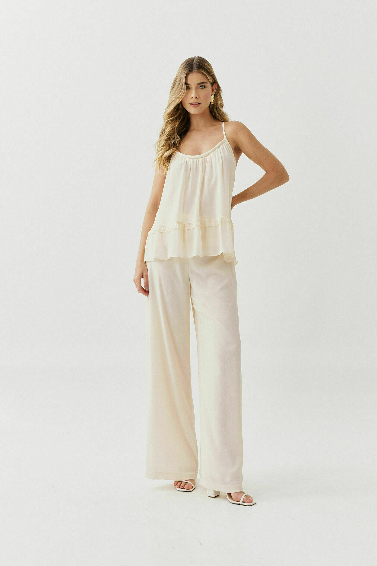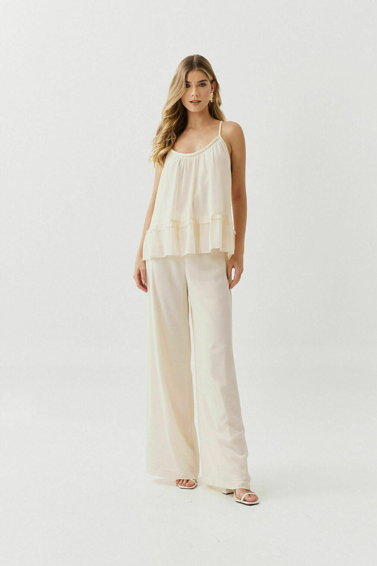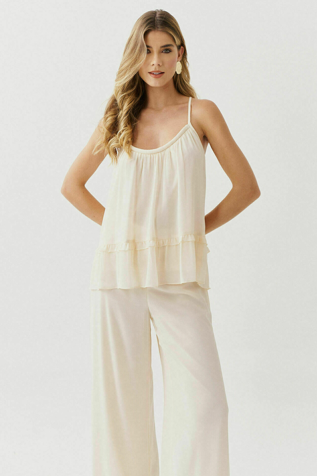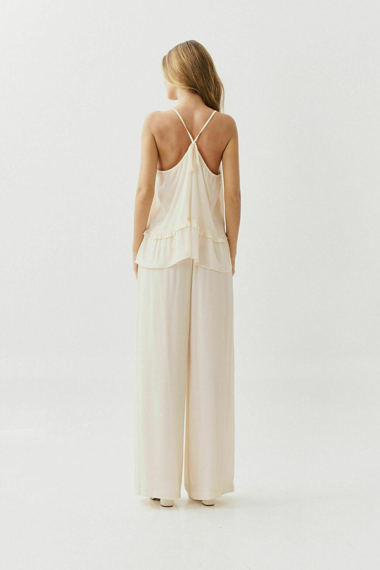 Conjunto Chiffon Yoriu com blusa de cordão no decote, fechamento por amarração nas costas e detalhe franzido na barra. Calça de modelagem reta com bolsos nas laterais.