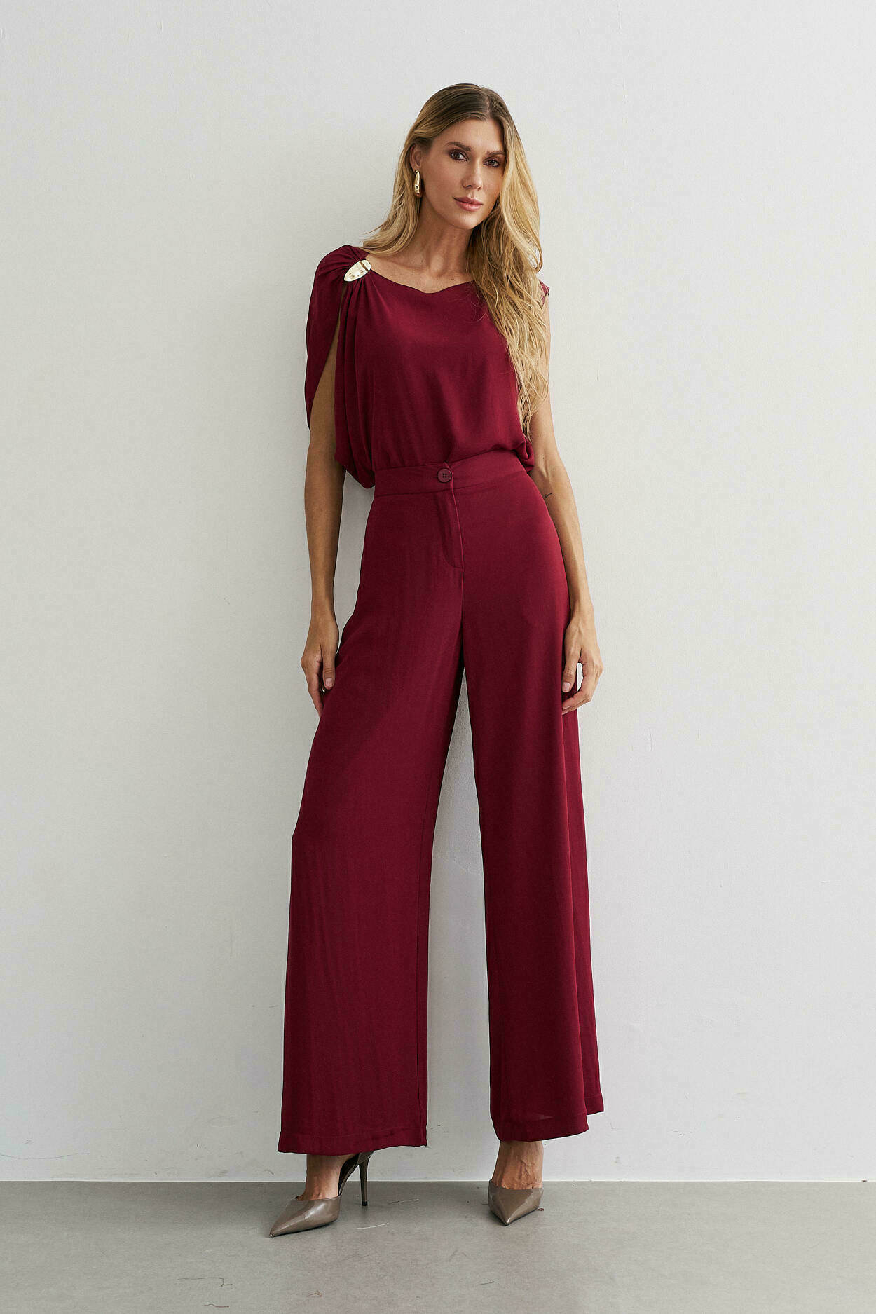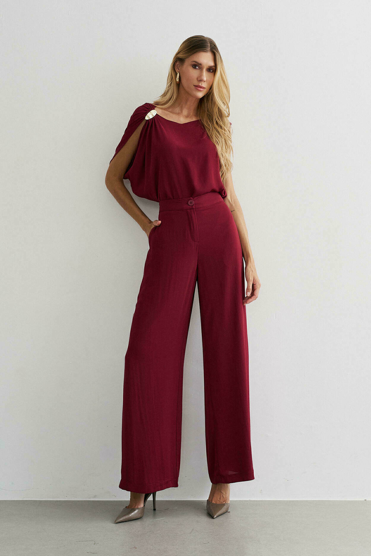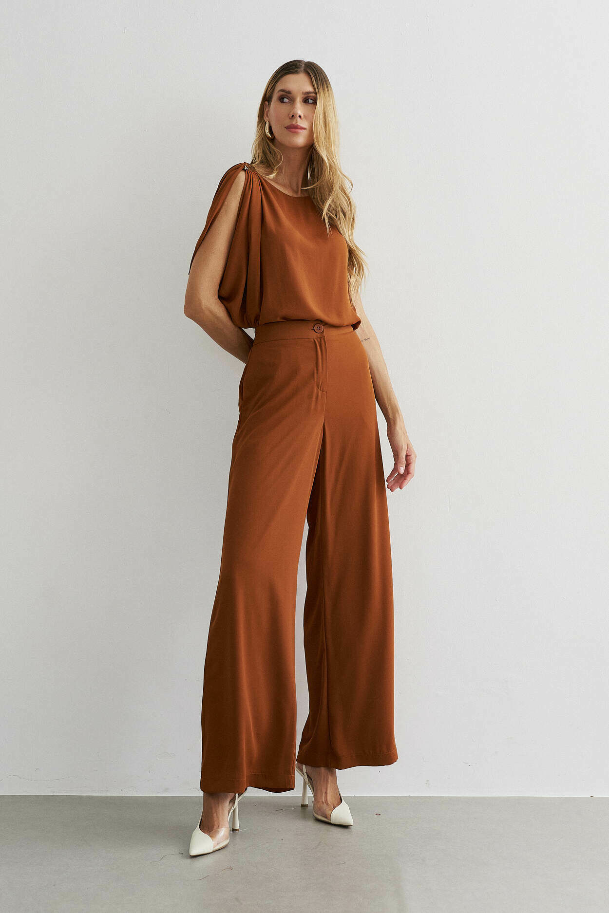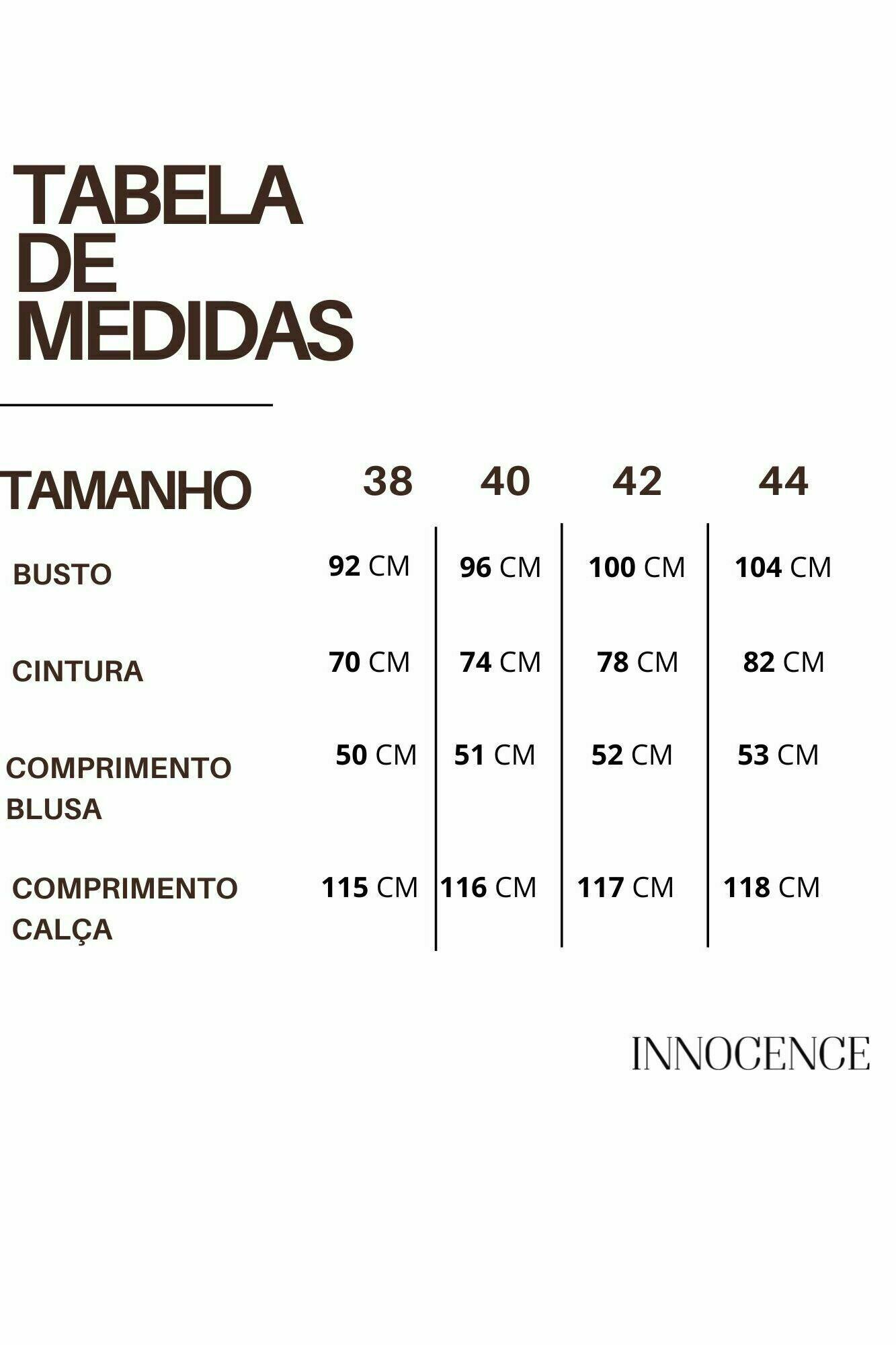 Conjunto crepe. Blusa com manga ampla, detalhe no ombro. Calça pantalona, bolso nas laterais, elástico cós costas.100% Poliéste