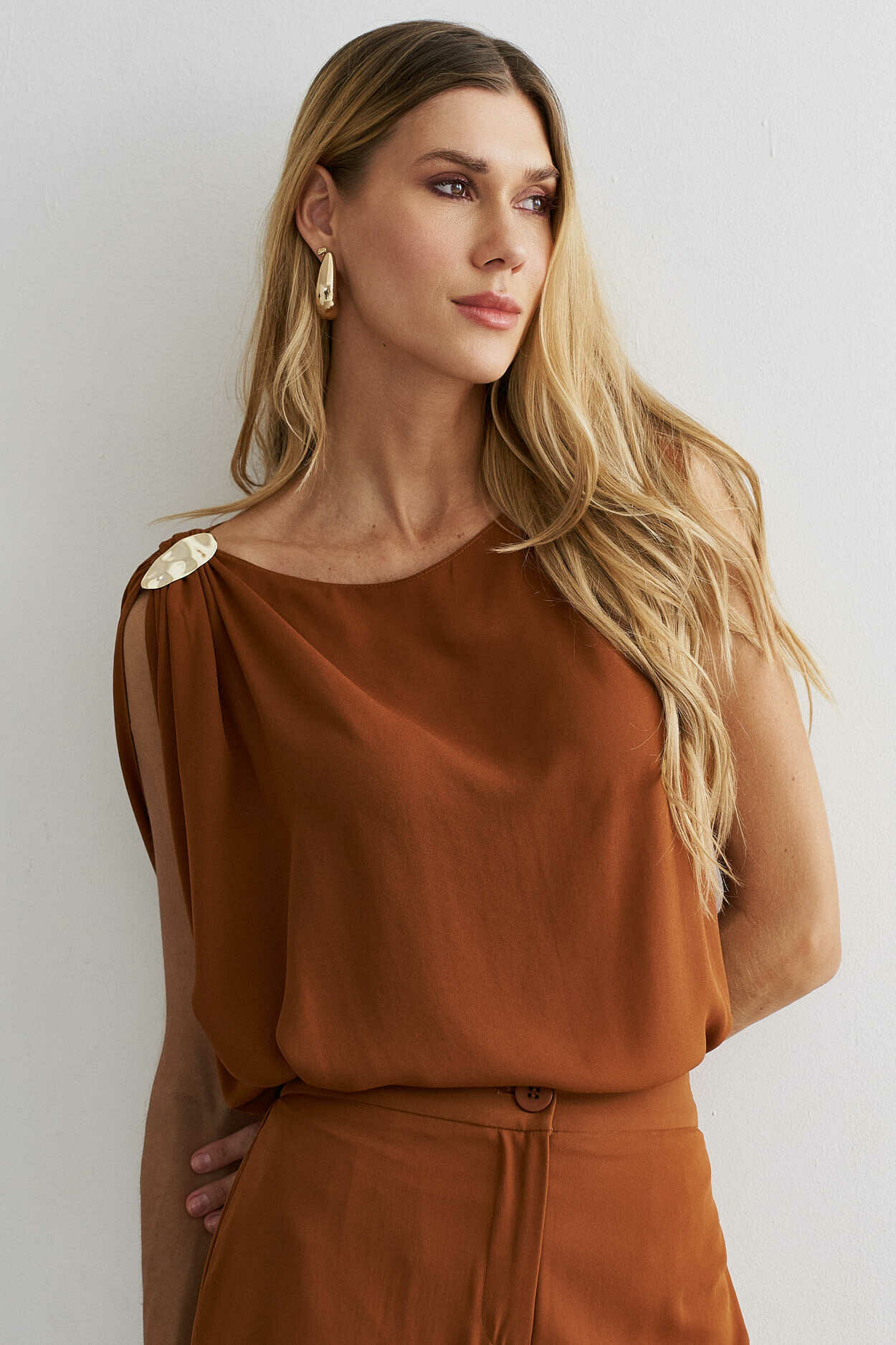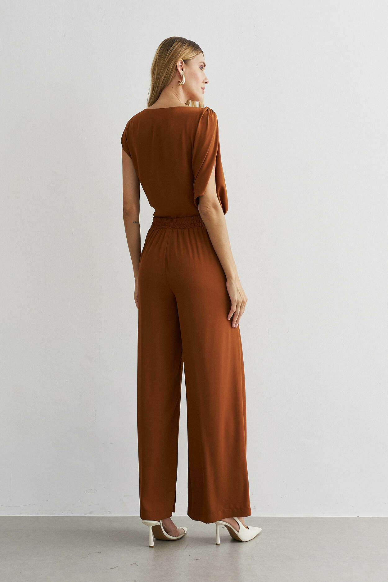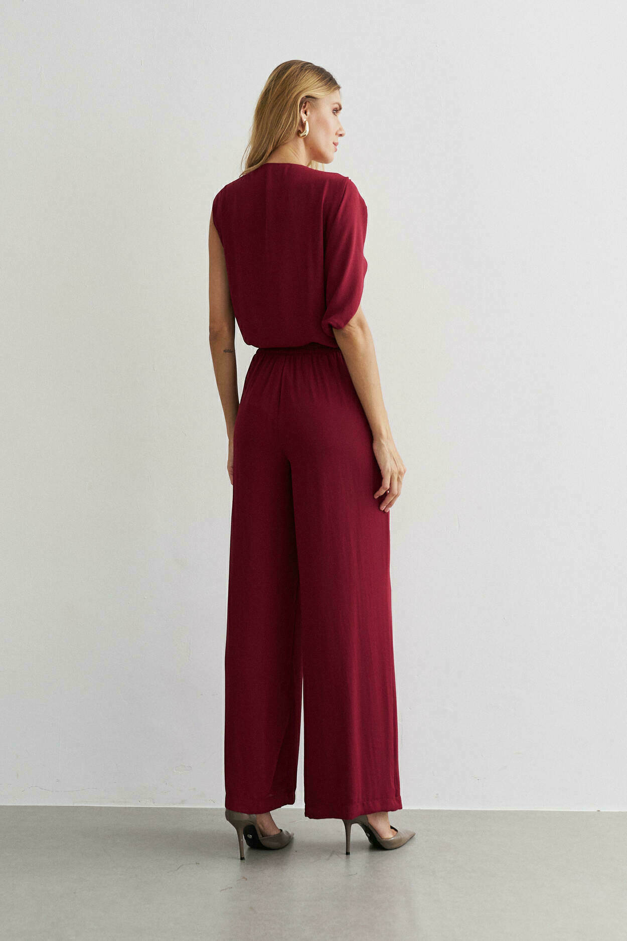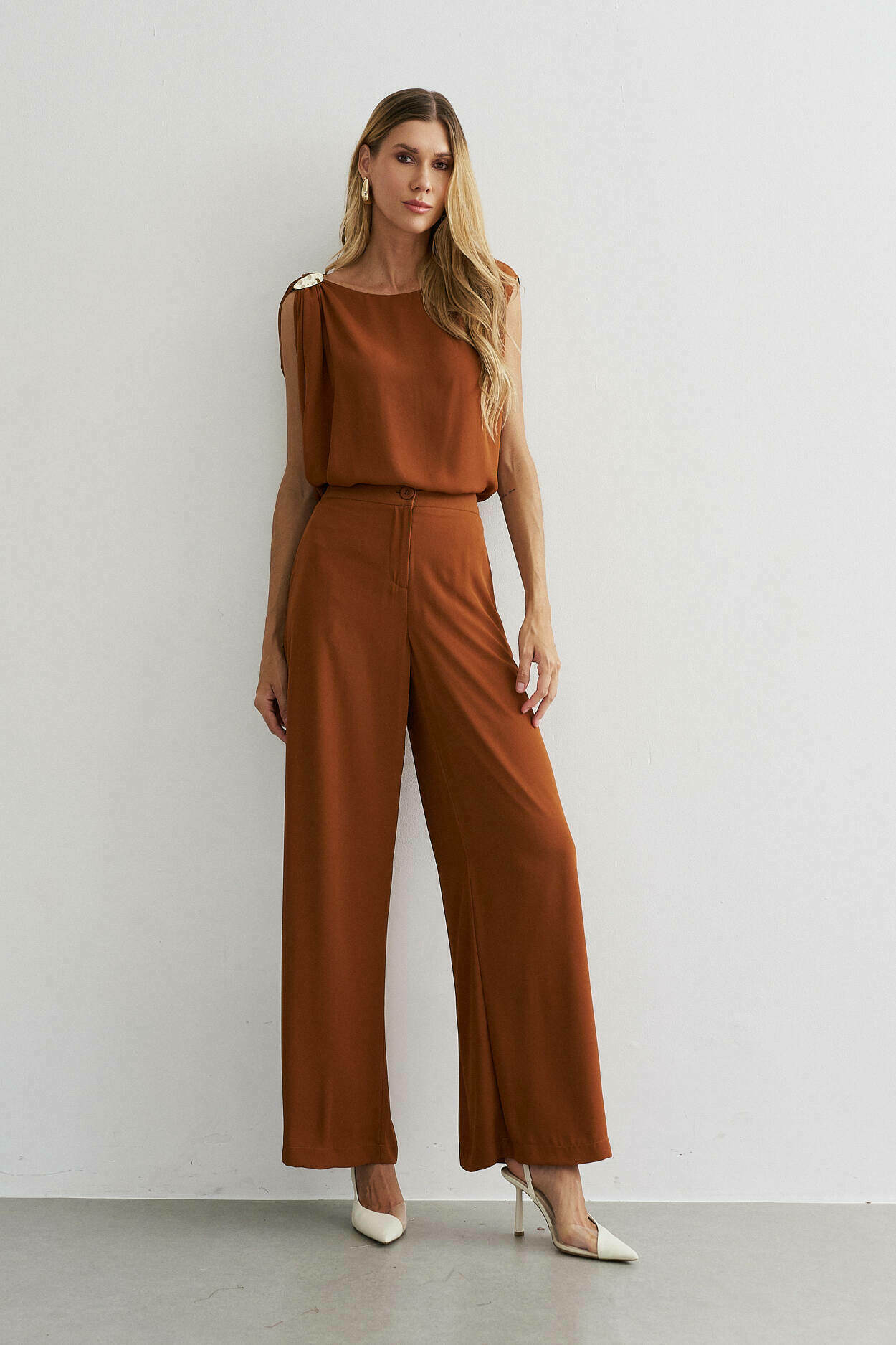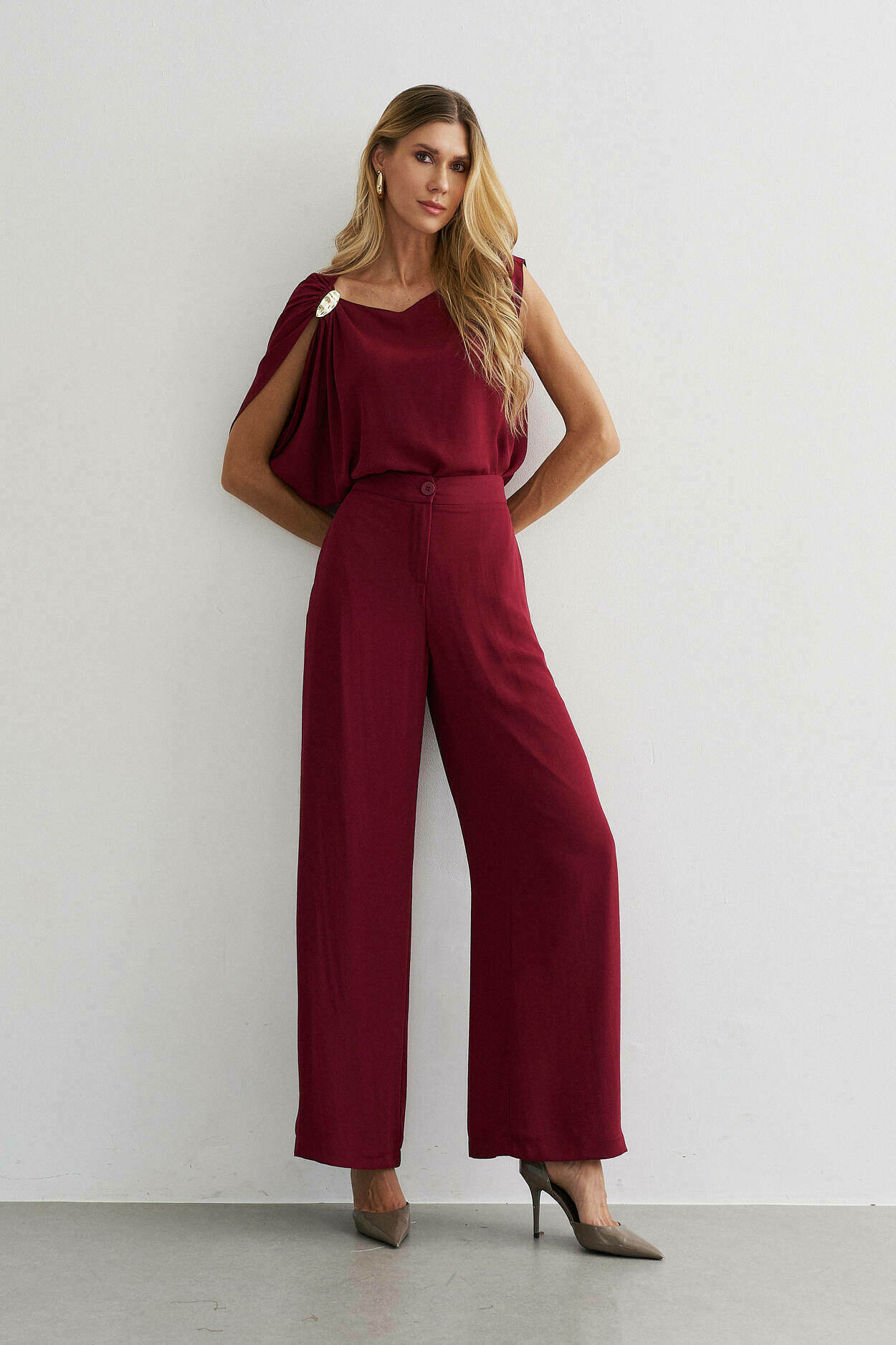 Conjunto crepe. Blusa com manga ampla, detalhe no ombro. Calça pantalona, bolso nas laterais, elástico cós costas.100% Poliéste