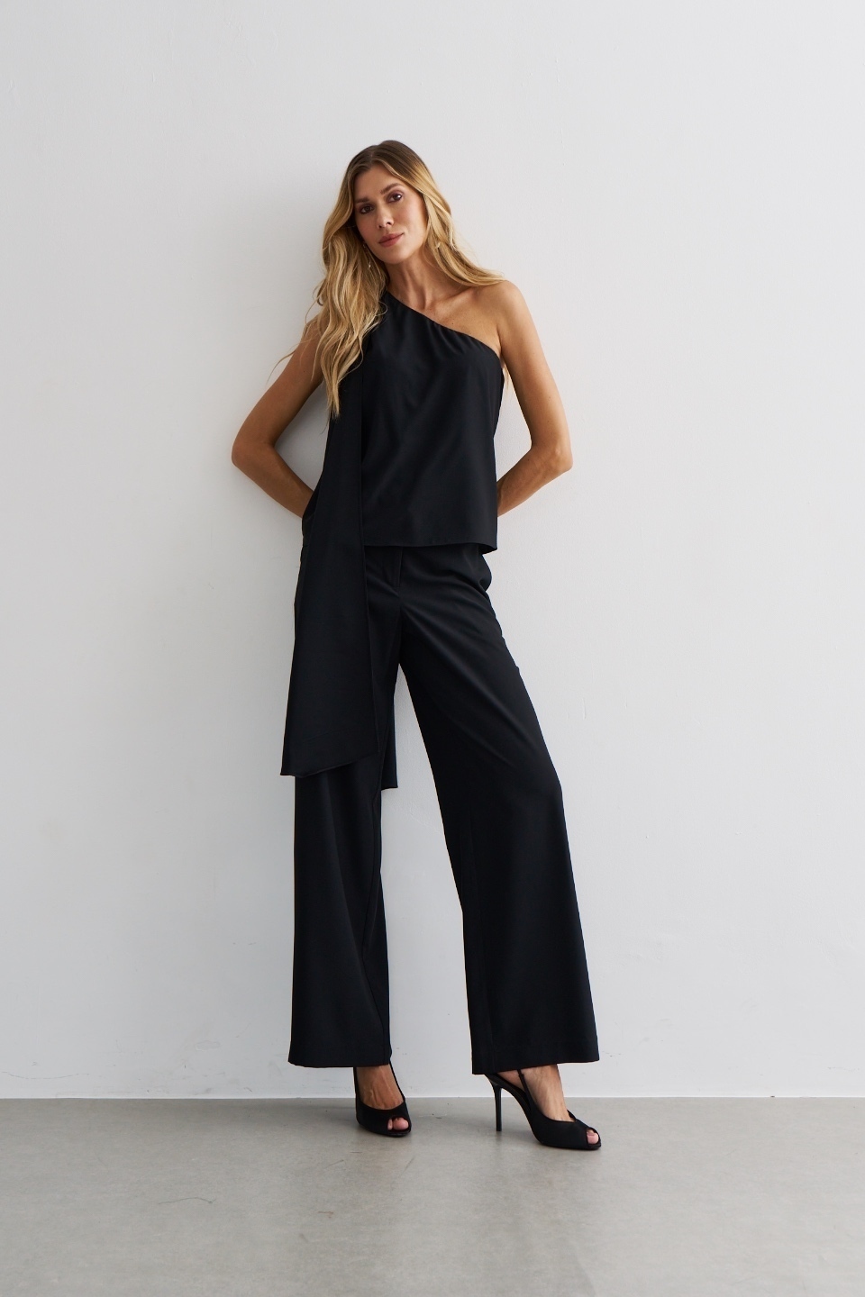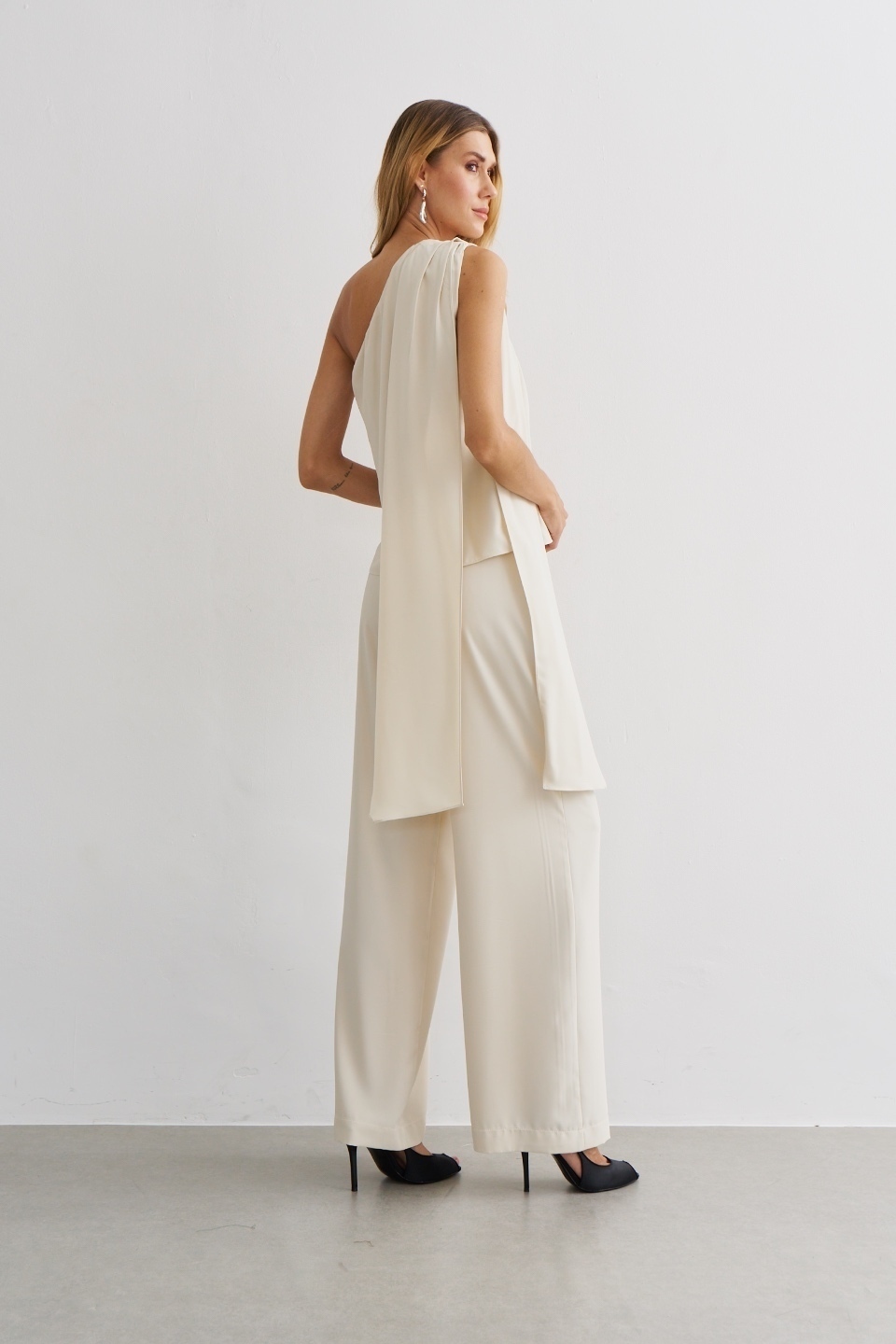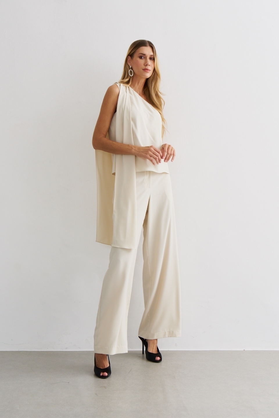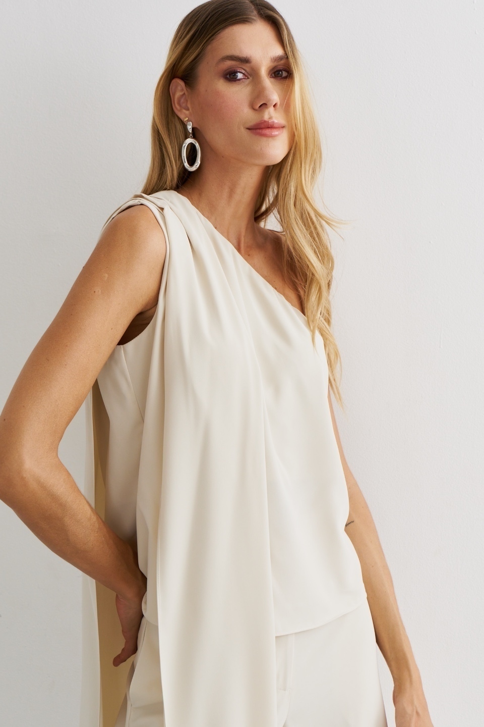 💡 Dica de estilo: use com sandália de salto fino e acessórios metalizados para destacar o design da blusa, ou aposte em cabelo preso e clutch estruturada para valorizar o detalhe do laço e o recorte assimétrico 🌙.