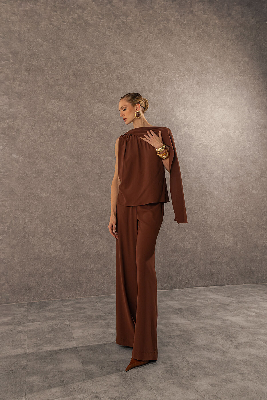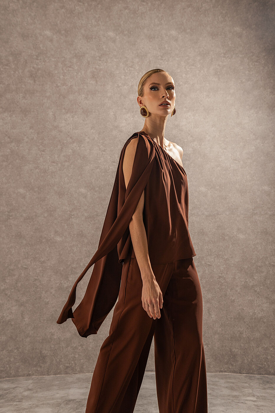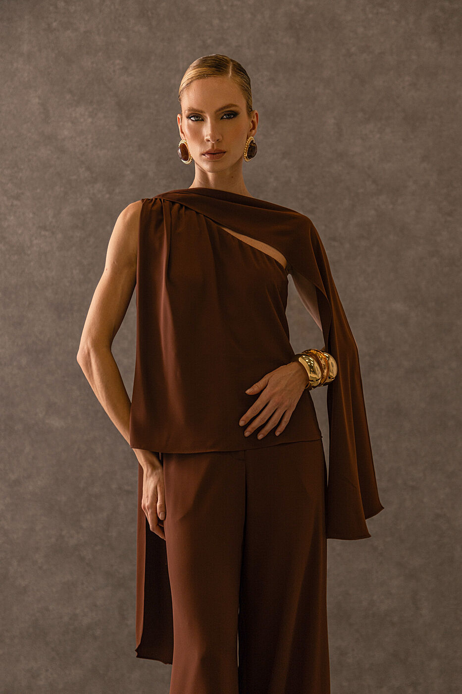 Ficha técnica: confeccionado em crepe de alta qualidade, com composição sugerida em poliéster, conjunto composto por blusa de um ombro só com laço decorativo e calça de modelagem reta e alongada, sem forro, acabamento refinado, cor marrom terroso, origem nacional, lavagem à mão ou em ciclo delicado, não usar alvejante, secar à sombra e passar em temperatura baixa para preservar o caimento e a estrutura do tecido 🤍.