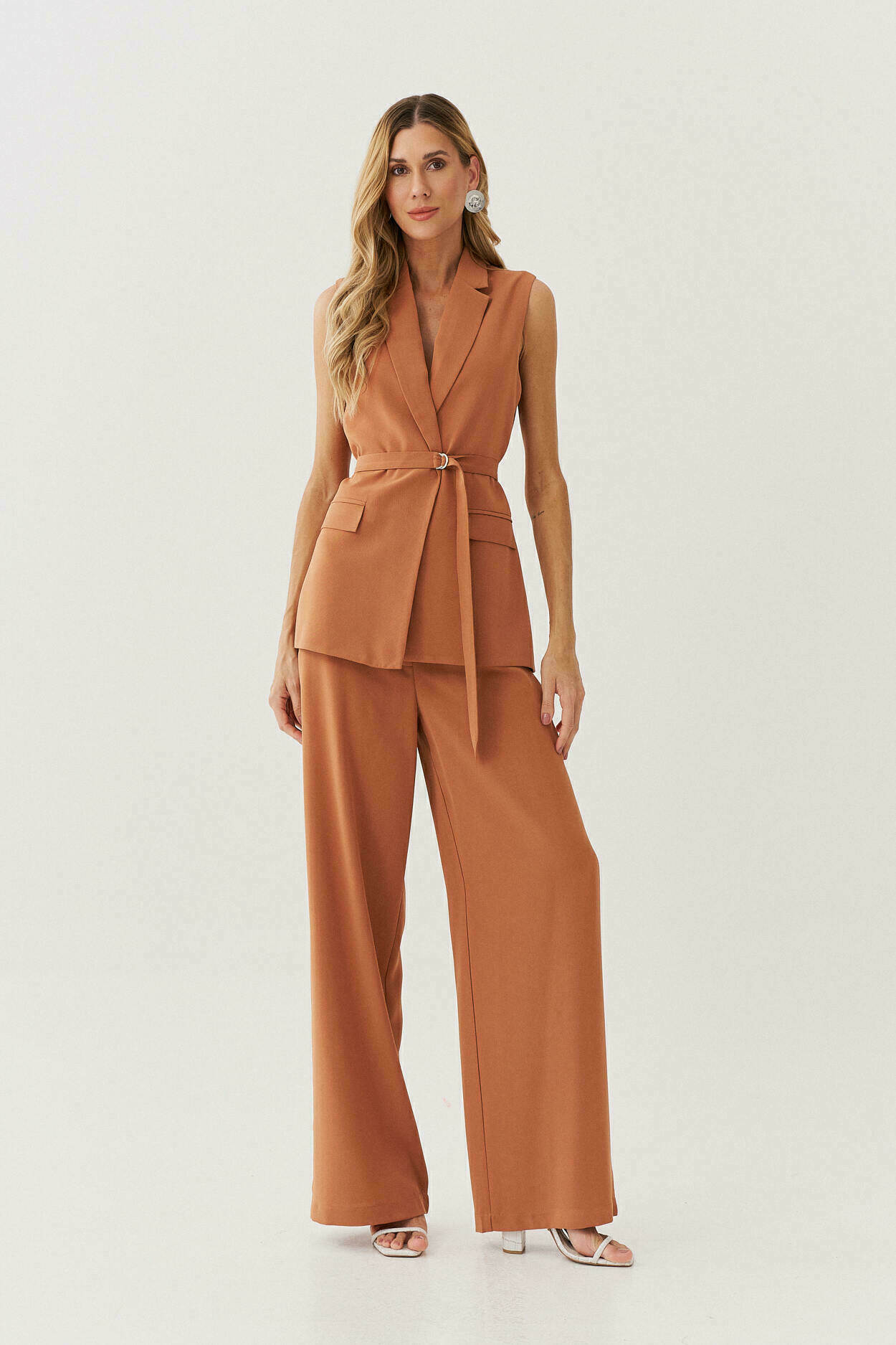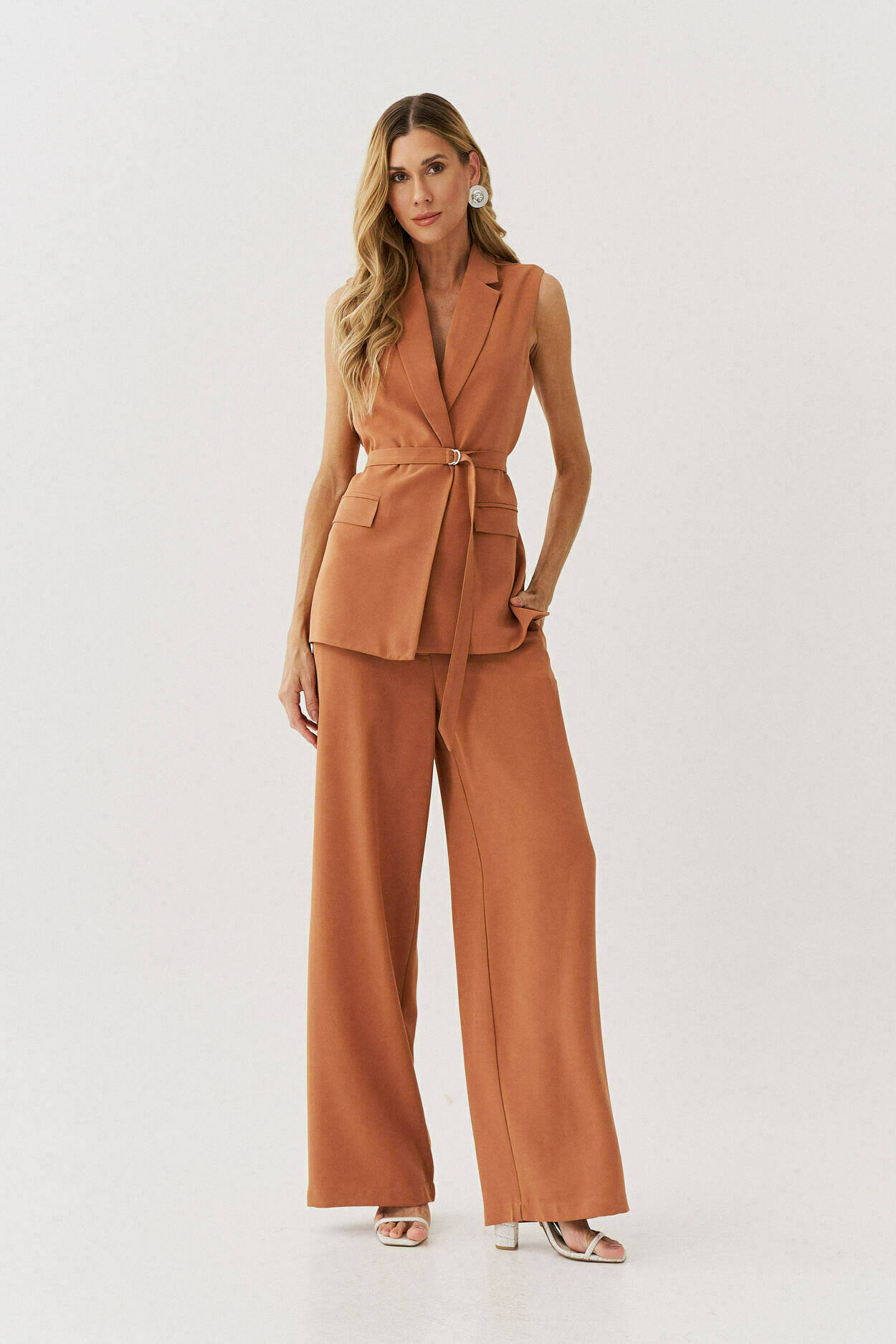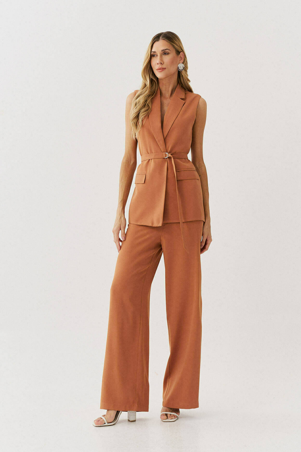 Conjunto crepe. Colete alongado, acompanha faixa com fivela para ajuste. Calça pantalona com bolso nas laterais.