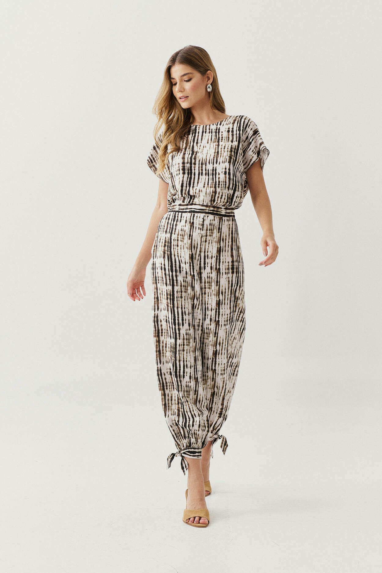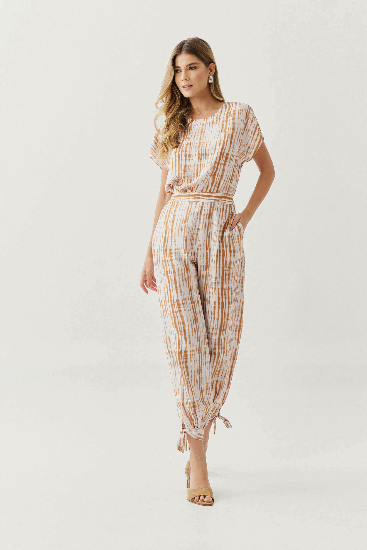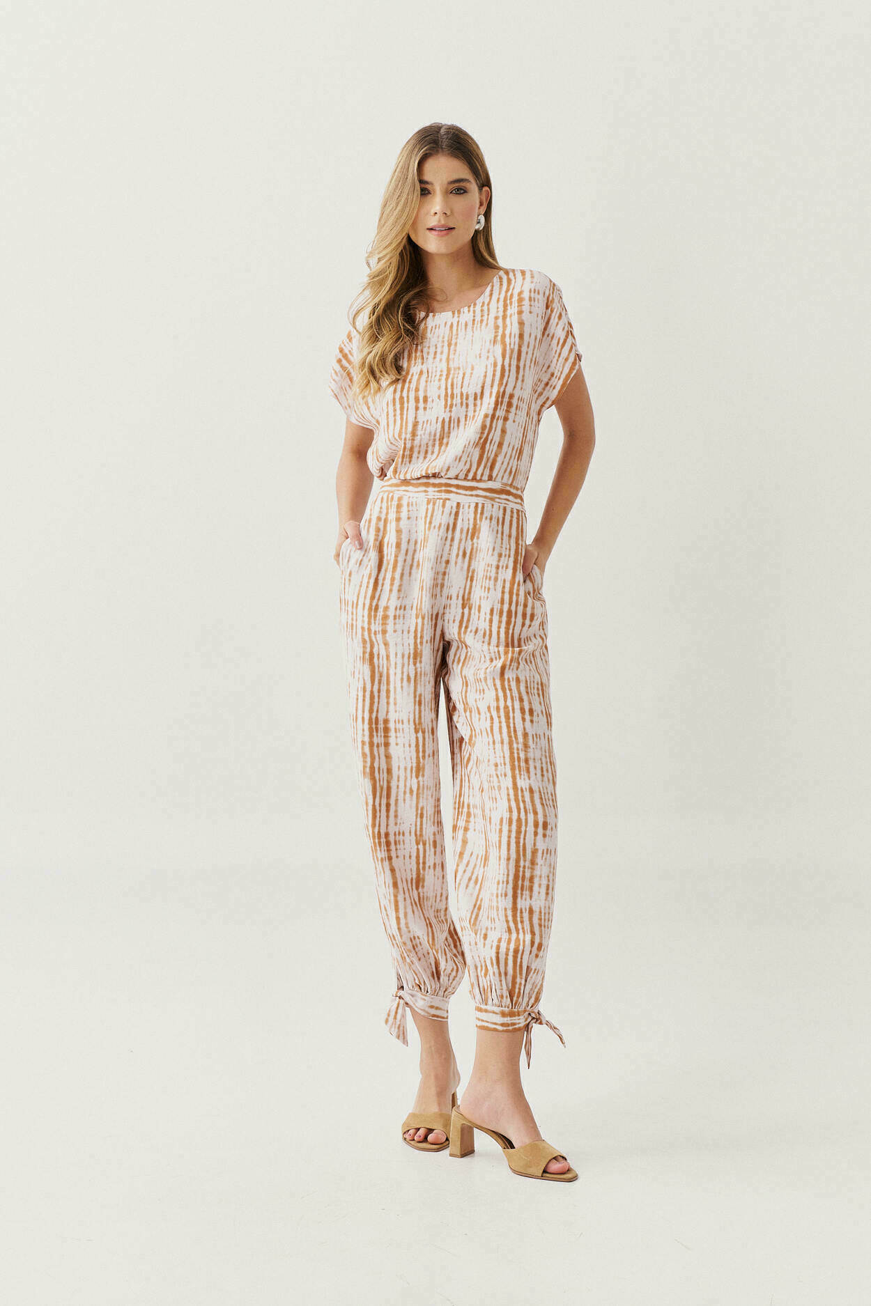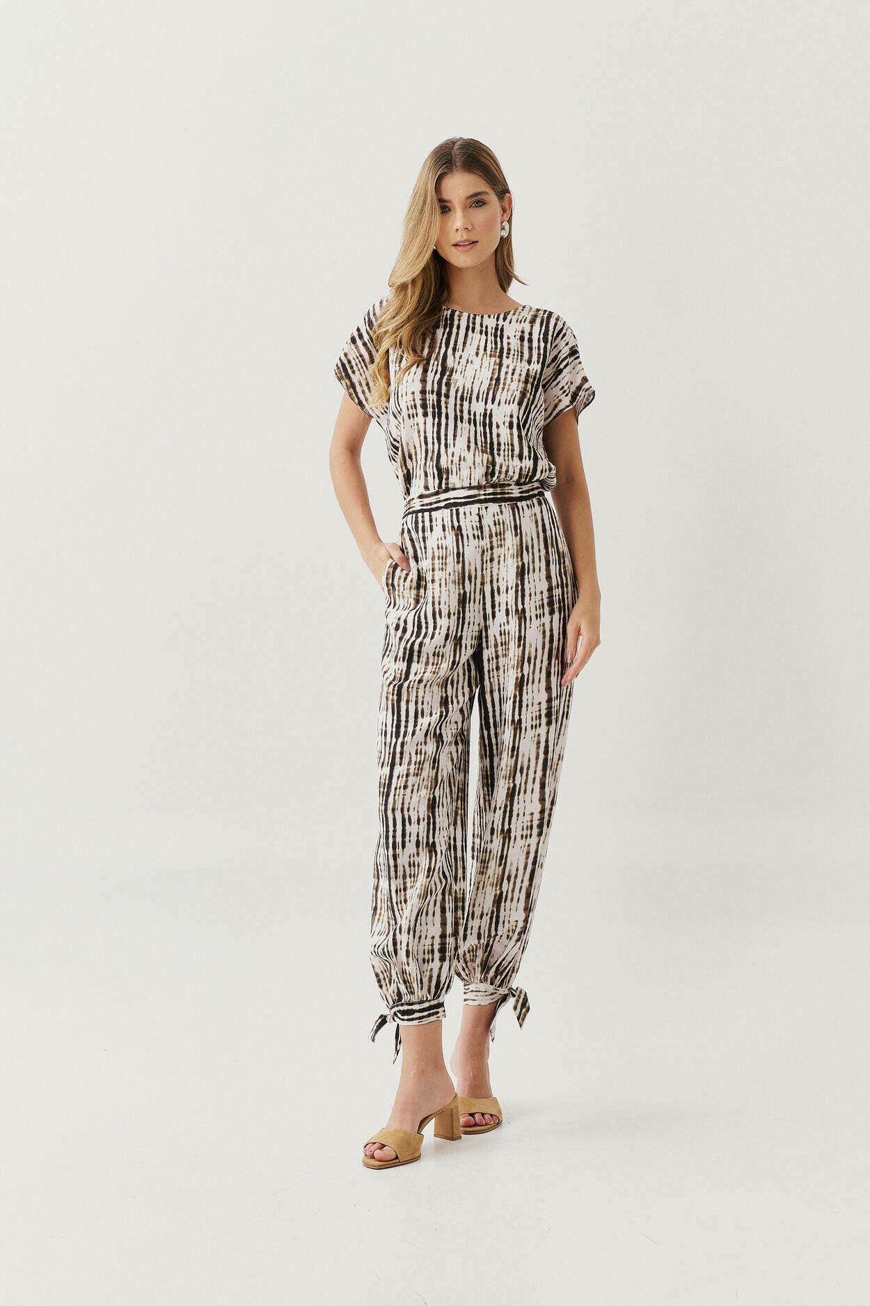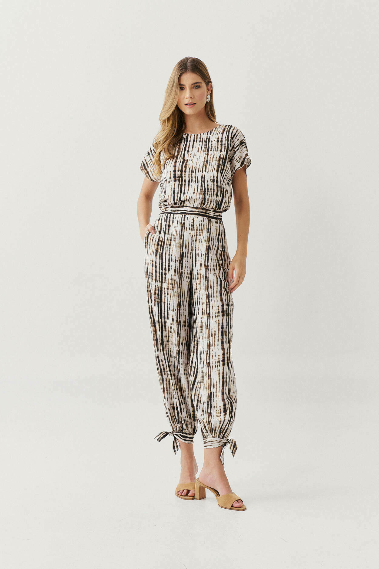Ficha técnica: confeccionado em crepe de alta qualidade, com composição sugerida em poliéster, conjunto composto por blusa de caimento fluido e calça ampla com amarração na barra, sem forro, acabamento delicado, estampa em tons claros e suaves, origem nacional, lavagem à mão ou em ciclo delicado, não usar alvejante, secar à sombra e passar em temperatura baixa para preservar a estampa e o caimento do tecido 🤍.