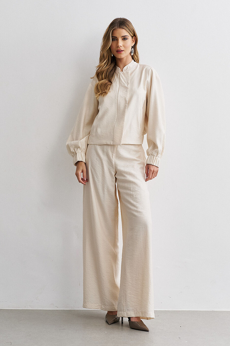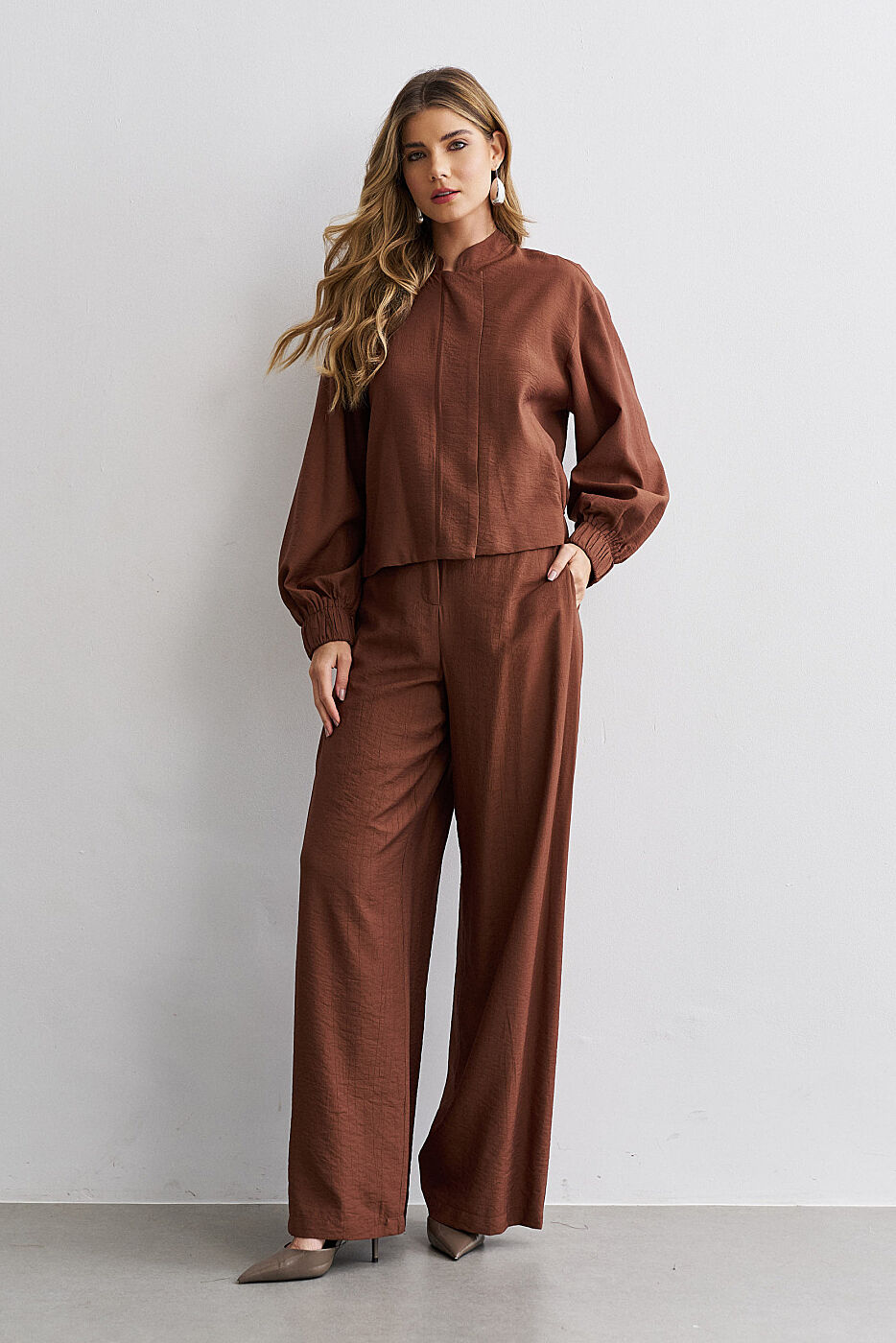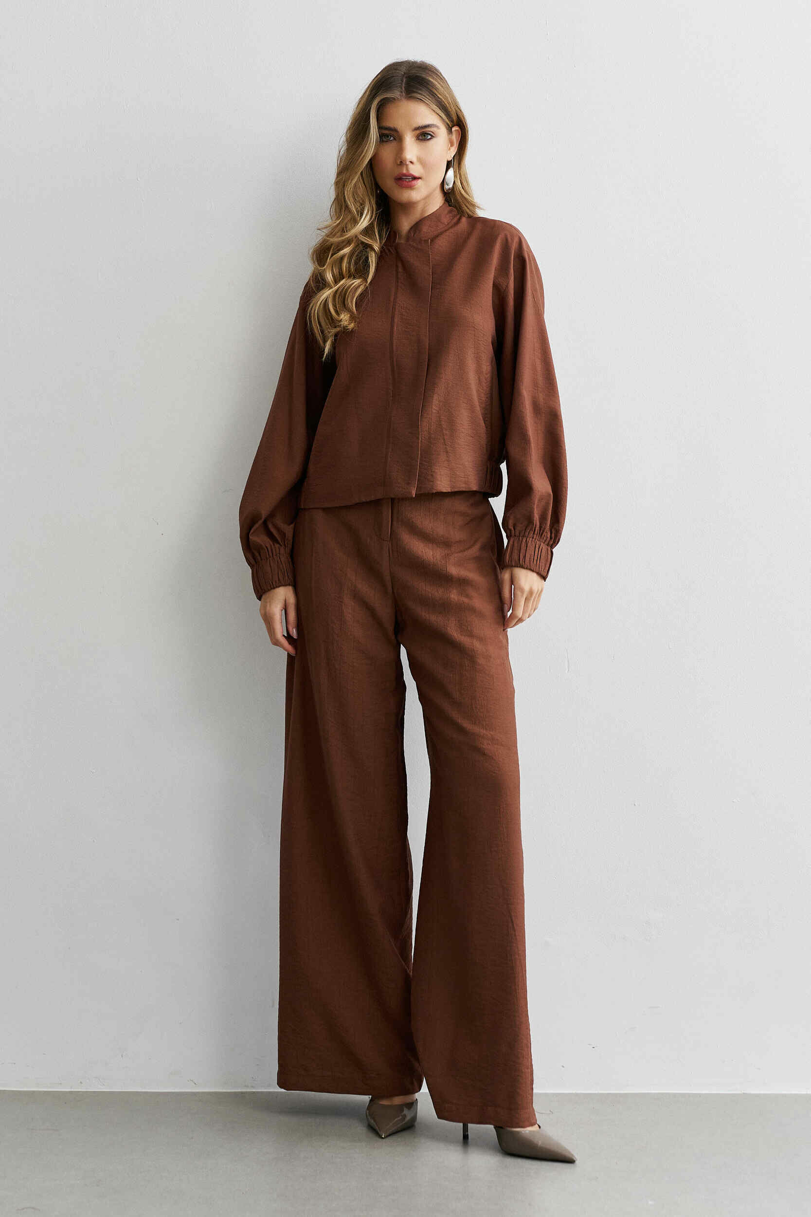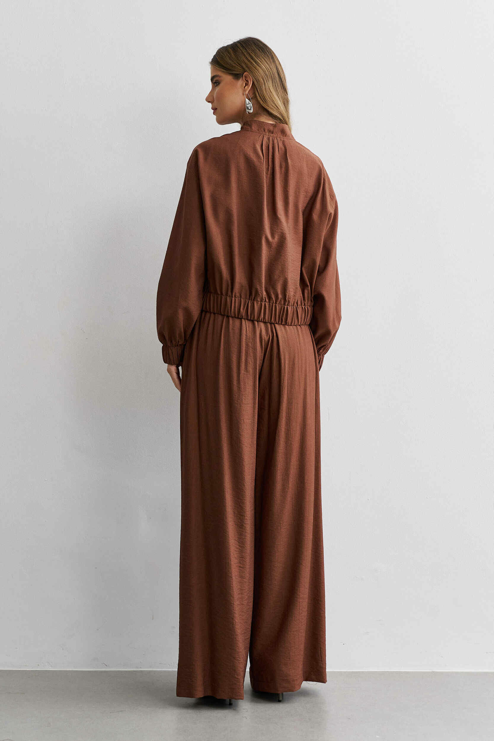 Ficha técnica: confeccionado em crepe de alta qualidade, com composição sugerida em poliéster, conjunto composto por jaqueta estilo bomber com zíper frontal e bolsos funcionais e calça de modelagem ampla e fluida, sem forro, acabamento refinado, cor bege terroso, origem nacional, lavagem à mão ou em ciclo delicado, não usar alvejante, secar à sombra e passar em temperatura baixa para preservar o caimento e a estrutura do tecido 🤍.
