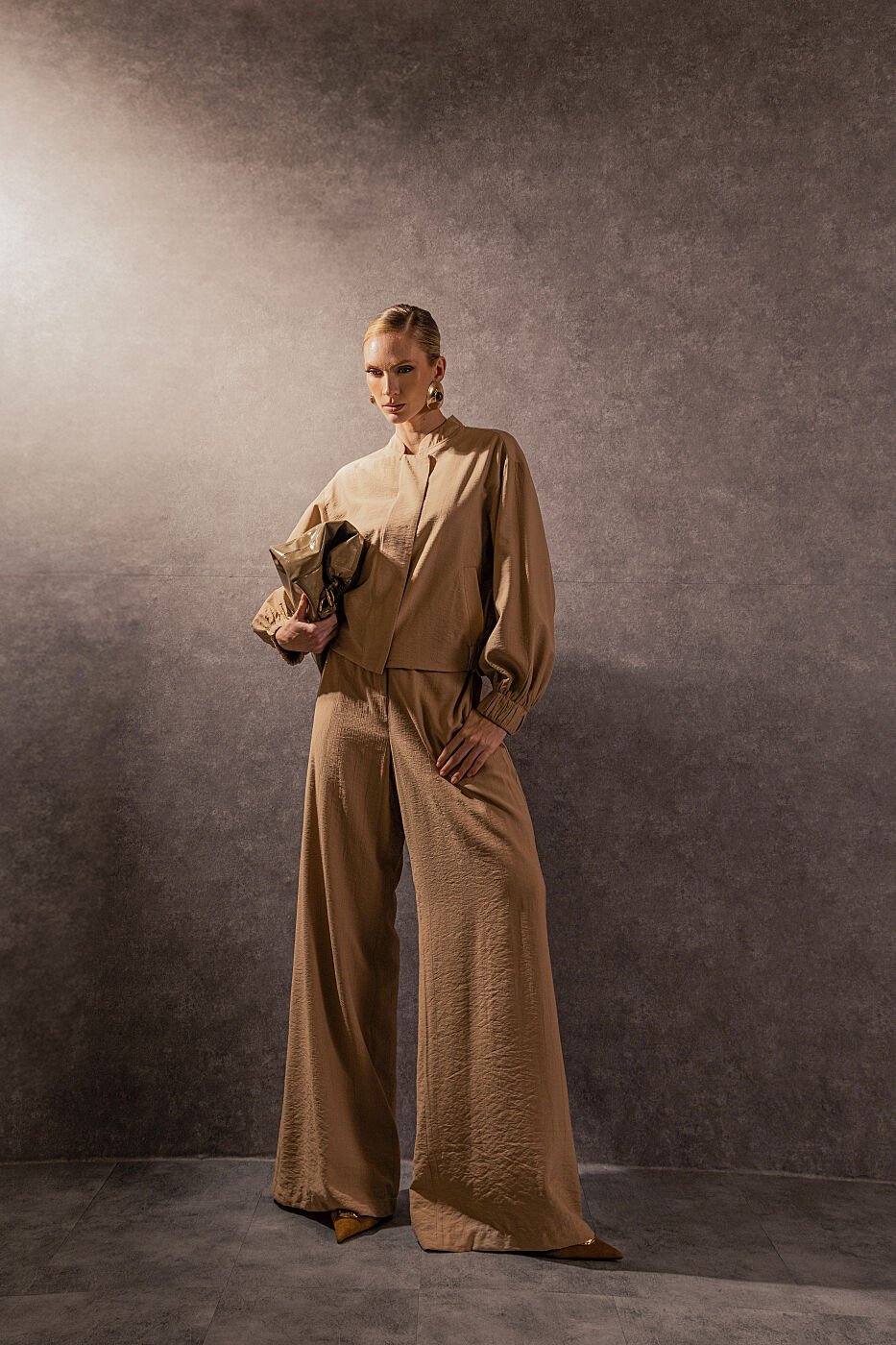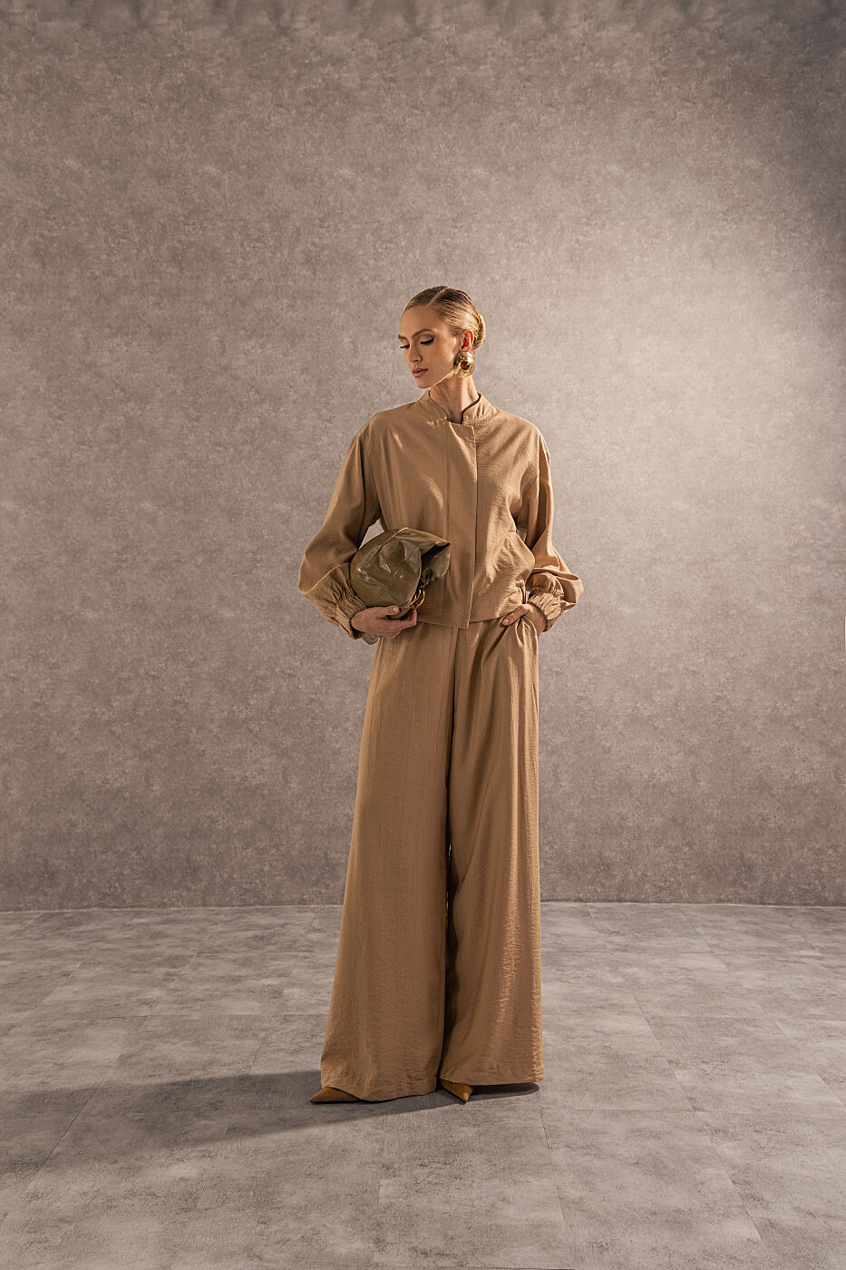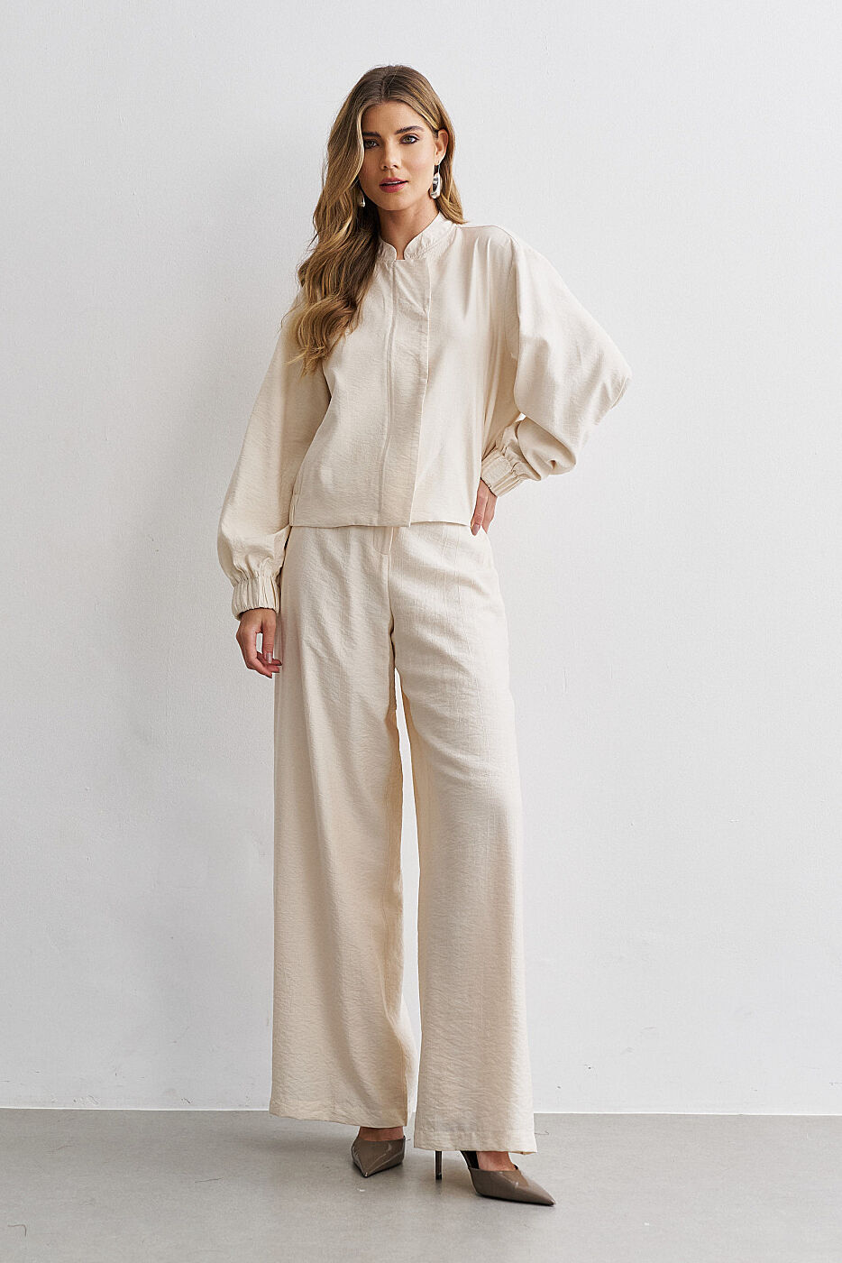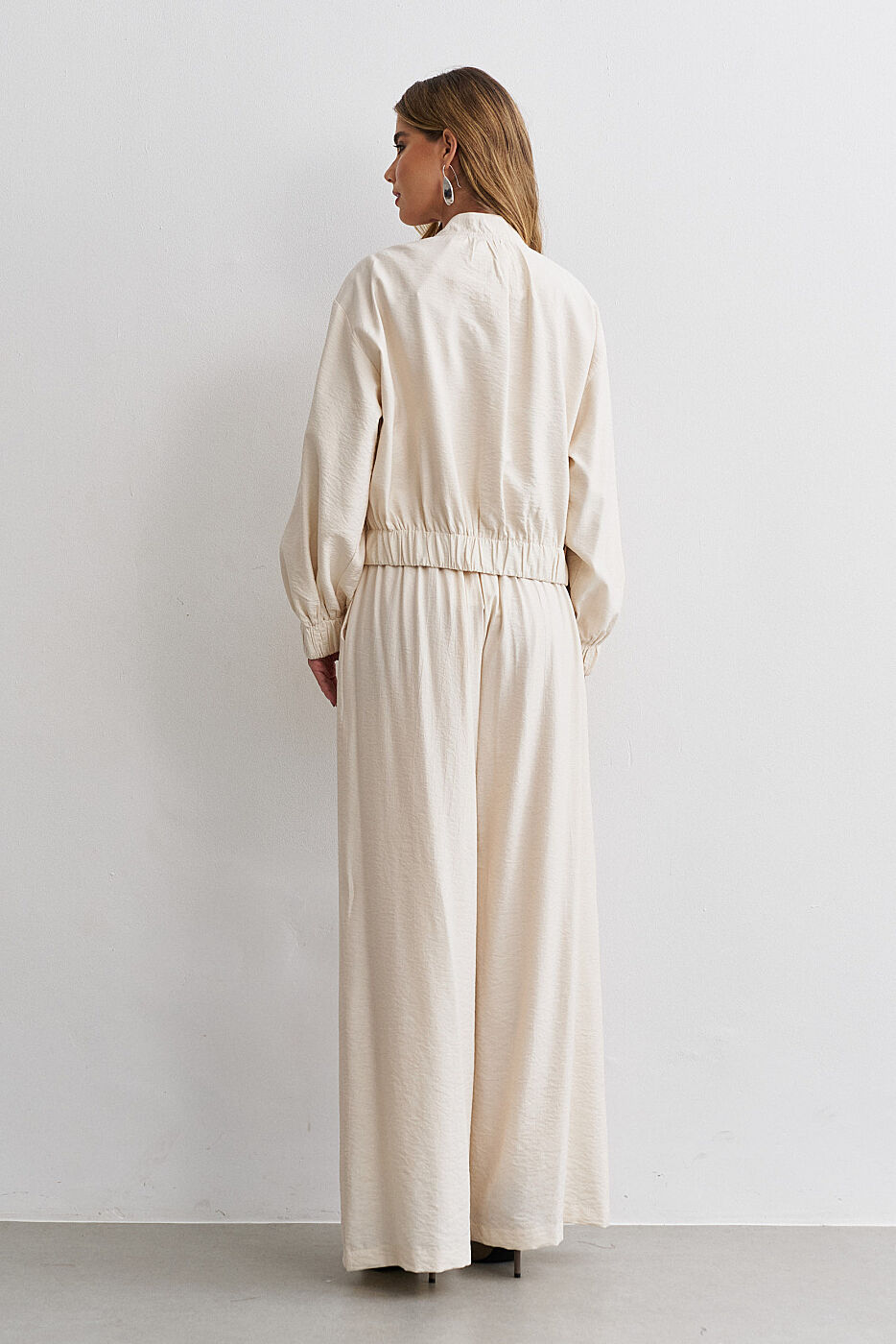 Ficha técnica: confeccionado em crepe de alta qualidade, com composição sugerida em poliéster, conjunto composto por jaqueta estilo bomber com zíper frontal e bolsos funcionais e calça de modelagem ampla e fluida, sem forro, acabamento refinado, cor bege terroso, origem nacional, lavagem à mão ou em ciclo delicado, não usar alvejante, secar à sombra e passar em temperatura baixa para preservar o caimento e a estrutura do tecido 🤍.