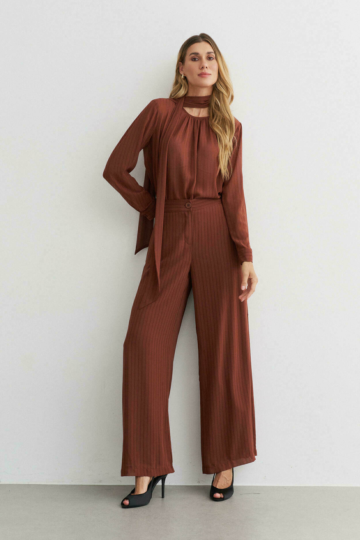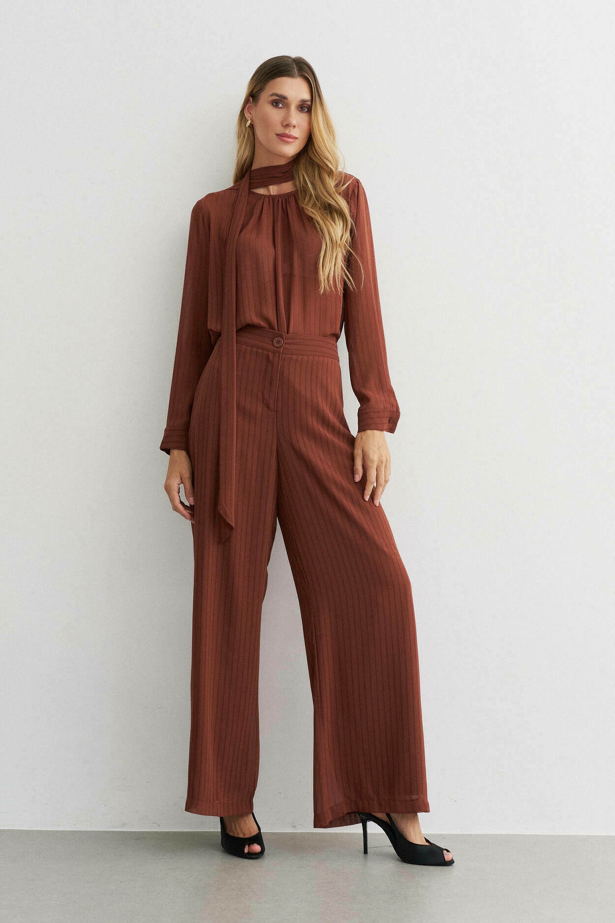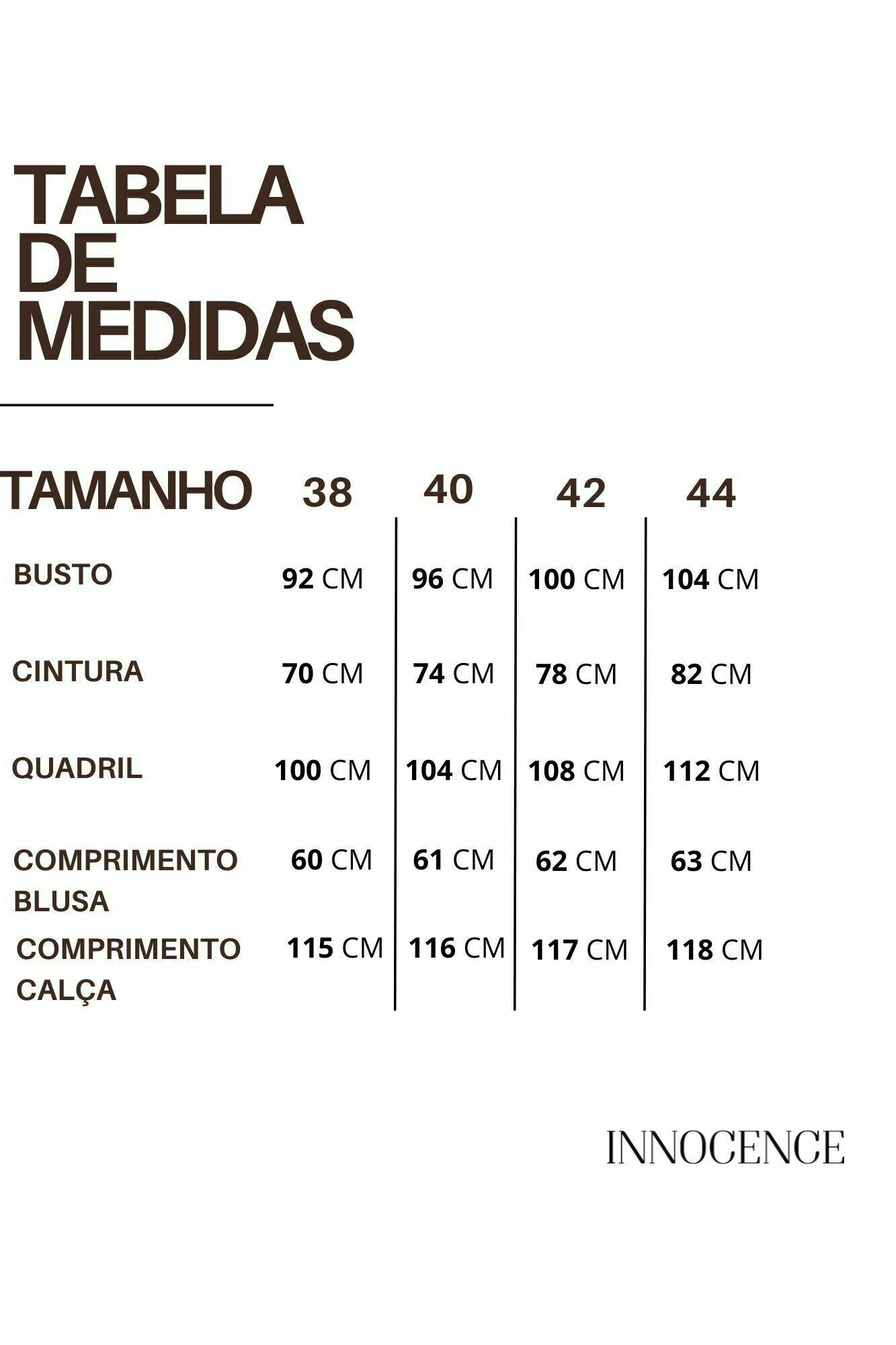 Conjunto crepe maquim. Blusa com decote franzido, fechamento botão costas, acompanha faixa. Calça pantalona, bolso nas laterais. 100% Poliéster
