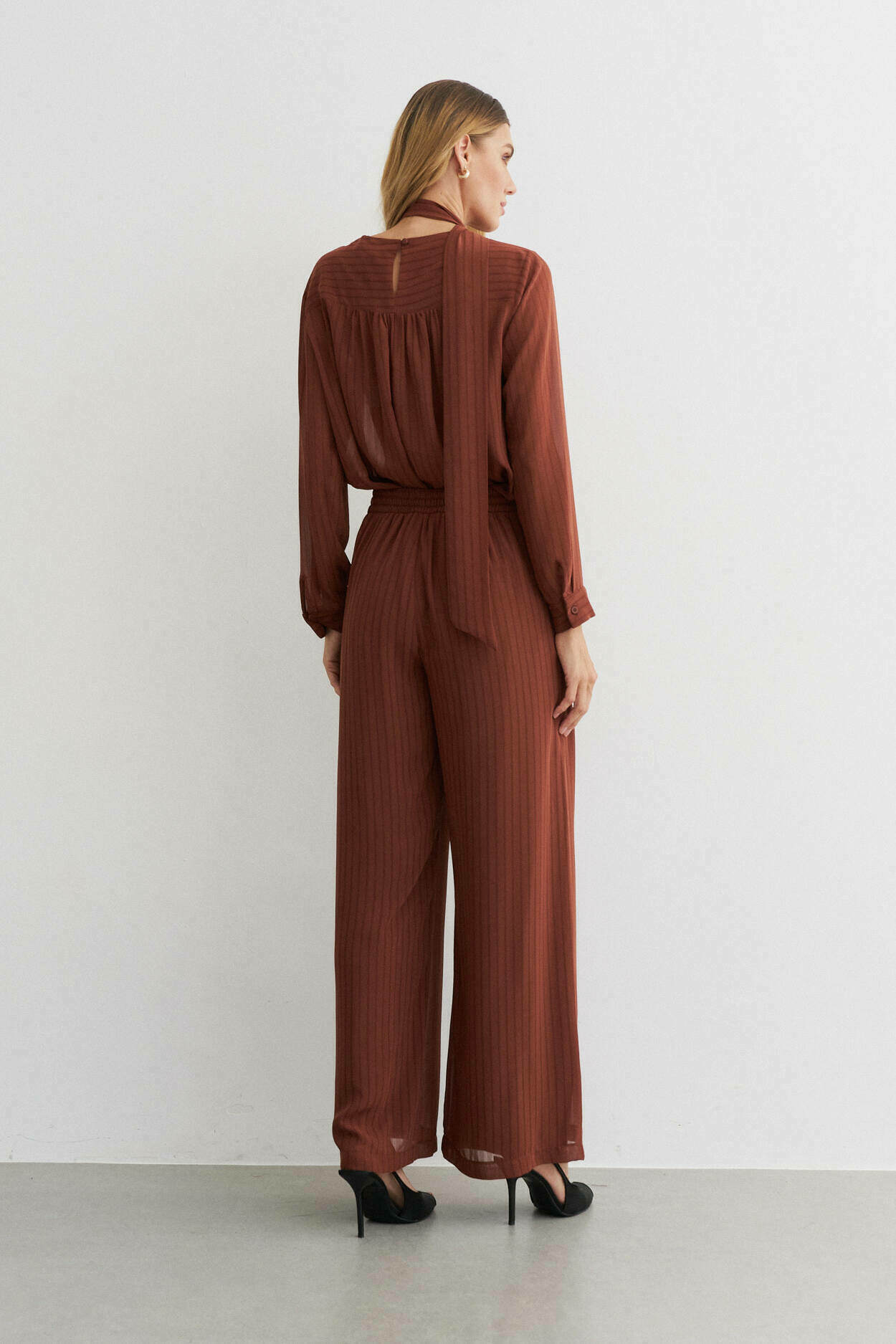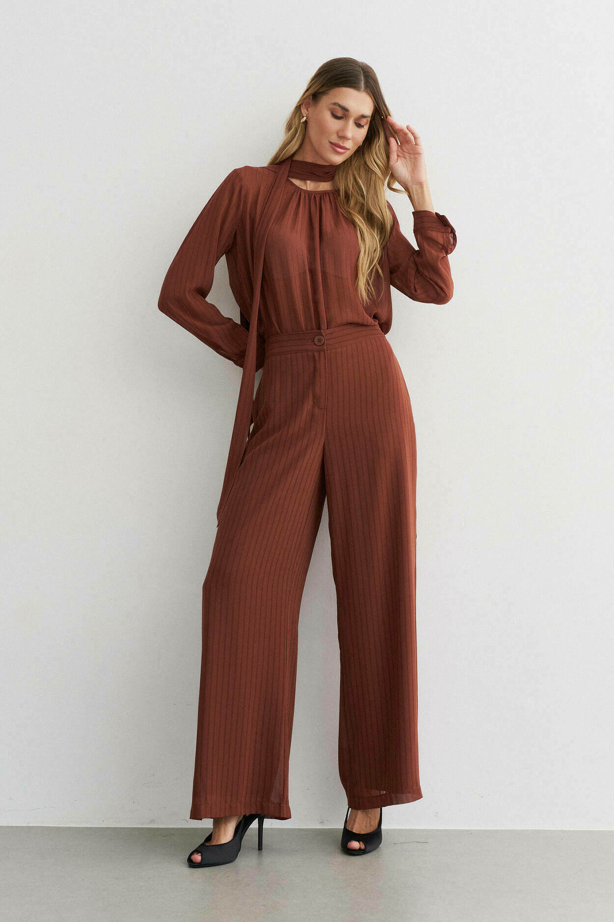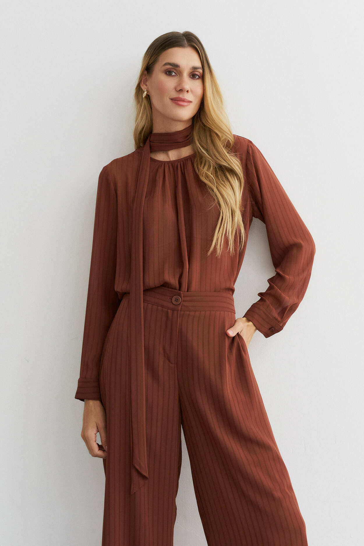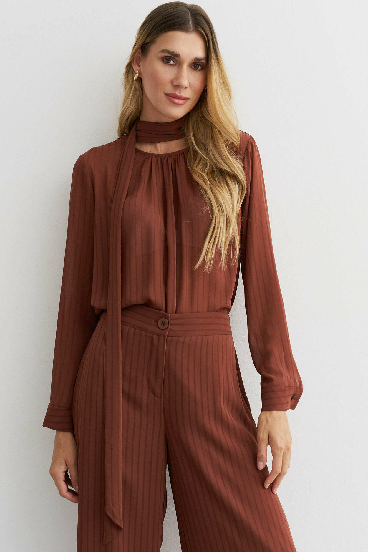 Conjunto crepe maquim. Blusa com decote franzido, fechamento botão costas, acompanha faixa. Calça pantalona, bolso nas laterais. 100% Poliéster