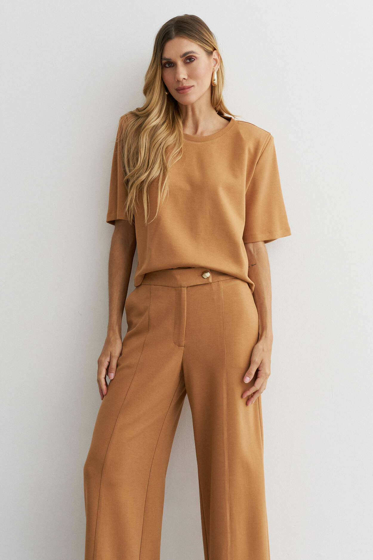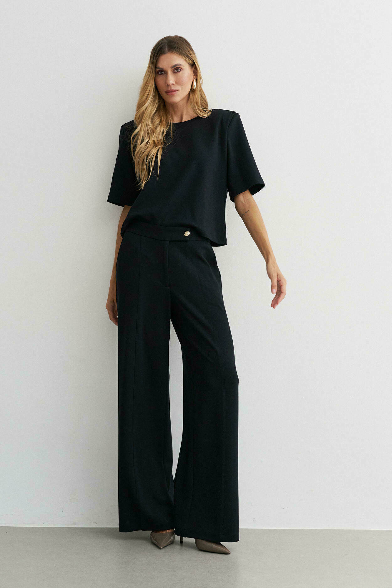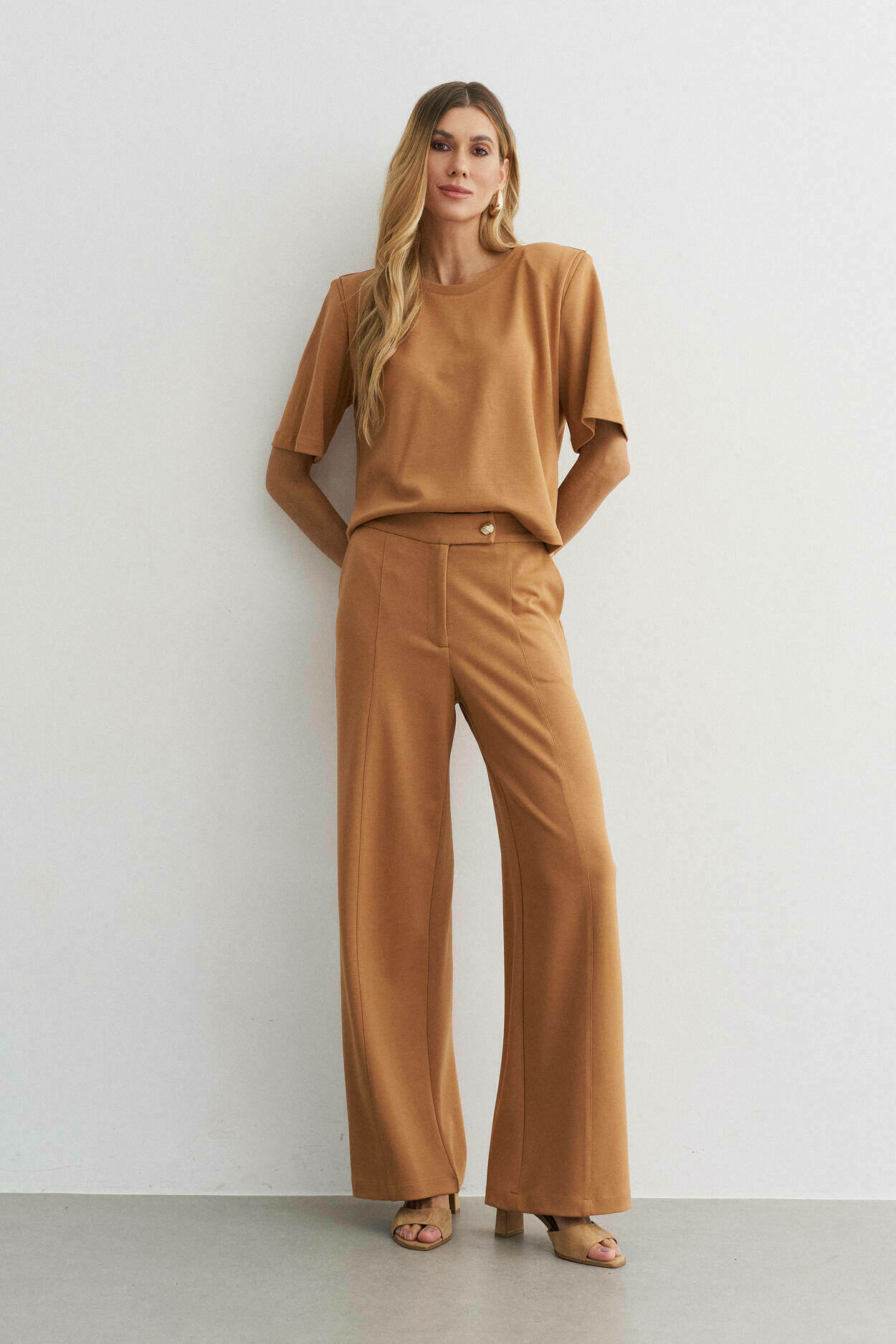 Conjunto moletom. Blusa com pregas e ombreira. Calça pantalona, bolso nas laterais, e fechamento por botão lateral.